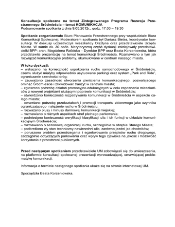 Konsultacje społeczne na temat Zintegrowanego Programu Rozwoju Przestrzennego Śródmieścia – temat KOMUNIKACJA Podsumowanie spotkania z dnia 9.05.2012r., godz. 17.00 – 19.30 Spotkanie zorganizowało Biuro Planowania Przestrzennego przy współudziale Biura Komunikacji Społecznej. Moderatorem spotkania był Dariusz Bielas, koordynator konsultacji. W dyskusji uczestniczyli mieszkańcy Olsztyna oraz przedstawiciele Urzędu Miasta. W sumie ok. 30 osób. Merytoryczną część dyskusji zainicjowały przedstawicielki BPP: arch. Magdalena Rafalska – Dyrektor BPP oraz Beata Korzeniowska, która przedstawiła prezentację na temat komunikacji Śródmieścia. Rozmawiano o tym jak rozwiązać komunikacyjne problemy, skumulowane w centrum naszego miasta. W toku dyskusji: – wskazano na konieczność uspokojenia ruchu samochodowego w Śródmieściu, czemu służyć miałyby odpowiednio usytuowane parkingi oraz system „Park and Ride”, ograniczanie szerokości dróg; – zauważono zasadność utworzenia pierścienia komunikacyjnego, pozwalającego ominąć Śródmieście i zlikwidować tranzyt w centrum miasta; – zgłoszono potrzebę działań promocyjno-edukacyjnych w celu zapoznania mieszkańców z nowymi projektami służącymi poprawie komunikacji w Śródmieściu; – stwierdzono konieczność rozpatrywania komunikacji w Śródmieściu w aspekcie całego miasta; – omawiano potrzebę przekształceń i promocji transportu zbiorowego jako czynnika ograniczającego natężenie ruchu w Śródmieściu; – rozważano plusy i minusy darmowej komunikacji miejskiej; – rozmawiano o różnych aspektach stref płatnego parkowania; – podniesiono konieczność weryfikacji klasyfikacji ulic i ich funkcji w układzie komunikacyjnym Śródmieścia; – rozmawiano o sezonowej organizacji ruchu, szczególnie w obrębie Starego Miasta; – podkreślono zły stan techniczny nawierzchni ulic, zarówno jezdni jak chodników; – poruszono problem przestrzegania i egzekwowania przepisów ruchu drogowego, szczególnie dotyczących parkowania oraz wpływ tego zjawiska na jakość i możliwość korzystania z przestrzeni publicznych. Przed następnym spotkaniem przedstawiciele UM zobowiązali się do umieszczenia, na platformie konsultacji społecznej prezentacji wprowadzającej, omawiającej problematykę komunikacji. Informacja o terminie następnego spotkania ukaże się na stronie internetowej UM. Sporządziła Beata Korzeniowska.