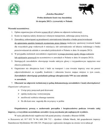 „Ścieżka Huculska” Próba dzielności koni rasy huculskiej 16 sierpnia 2012 r. (czwartek) w Polanie Warunki uczestnictwa: 1. Opłata organizacyjna od konia wynosi 40 zł ( płatna na odprawie technicznej). 2. Konie na imprezę należy dostarczyć własnym transportem, zabierając paszę treściwą. 3. Zawodnicy zobowiązani są przedstawić zaświadczenie lekarskie o braku przeciwwskazań do uprawiania sportów konnych wystawione przez lekarza medycyny sportowej (ważność badań dla wszystkich grup wiekowych 6 miesięcy), lub zaświadczenie od lekarza rodzinnego o braku przeciwwskazań do udziału w zawodach jeździeckich w Polanie w dniu 16 sierpnia 2012r. 4. W przypadku nieletnich zawodników organizator wymaga pisemnej zgody obojga rodziców lub opiekunów prawnych na uczestnictwo w zawodach w Polanie w dniu 16 sierpnia 2012r. 5. Startujących zawodników obowiązuje twarde nakrycie głowy z trzypunktowym zapięciem oraz obuwie jeździeckie. 6. Organizator nie ubezpiecza koni i ludzi na transport i czas trwania imprezy oraz nie ponosi odpowiedzialności za wypadki, kradzieże i zdarzenia losowe mające miejsce w tym czasie. Zawodników obowiązuje posiadanie pełnego ubezpieczenia NW na czas udziału w zawodach. 7. Obecność na odprawie technicznej (z pełną dokumentacją zawodników i koni) obowiązkowa! Organizator zabezpiecza: Uwiąz przy poręczach pod drzewami opiekę medyczną i weterynaryjną możliwość rozbicia własnego namiotu flo dla koni oraz nagrodę dla zwycięzcy w próbie Organizatorzy proszą o zachowanie porządku i bezpieczeństwa podczas trwania całej imprezy, a wszystkim uczestnikom zawodów życzą uzyskania jak najlepszych wyników. W razie jakichkolwiek wątpliwości lub pytań prosimy o kontakt z Biurem OZHK w Rzeszowie tel. 017 852 74 94; 608 290 712 – dyrektor -Gibała Marek, lub gospodarzem imprezy Stanisławem Myślińskim 501 696 325. Propozycje i zgłoszenie dostępne na stronie www.tabun.pl Zatwierdzono dnia 10 lipca 2012 Marek Gibała Dyrektor OZHK Rzeszów Polski Związek Jeździecki prosi wszystkie osoby zaangażowane w jakikolwiek sposób w sporty konne o przestrzeganie poniżej przedstawionego kodeksu oraz zasady, że dobro konia jest najważniejsze. KODEKS POSTĘPOWANIA Z KONIEM I. Na wszystkich etapach treningu i przygotowań konia do startu w zawodach, dobro konia musi stać ponad wszelkimi innymi wymaganiami. Dotyczy to stałej opieki, metod treningu, starannego obrządku, kucia i transportu. II. Konie i jeźdźcy muszą być wytrenowani, kompetentni i zdrowi zanim wezmą udział w zawodach. Odnosi się to także do podawania leków i środków medycznych, zabiegów chirurgicznych zagrażających dobru konia lub ciąży klaczy oraz do przypadków nadużywania pomocy. III. Zawody nie mogą zagrażać dobru konia. Wymaga to zwrócenia szczególnej uwagi na teren zawodów, powierzchnię podłoża, pogodę, warunki stajenne, kondycję koni i ich bezpieczeństwo, także podczas podróży powrotnej z zawodów. IV. Należy dołożyć wszelkich starań, aby zapewnić koniom staranną opiekę po zakończeniu zawodów, a także humanitarne traktowanie po zakończeniu kariery sportowej. Dotyczy to właściwej opieki weterynaryjnej, obrażeń odniesionych na zawodach, spokojnej starości, ewentualnie eutanazji. V. PZJ zachęca wszystkie osoby działające w sporcie jeździeckim do stałego podnoszenia swojej wiedzy oraz umiejętności dotyczących wszelkich aspektów współpracy z koniem.