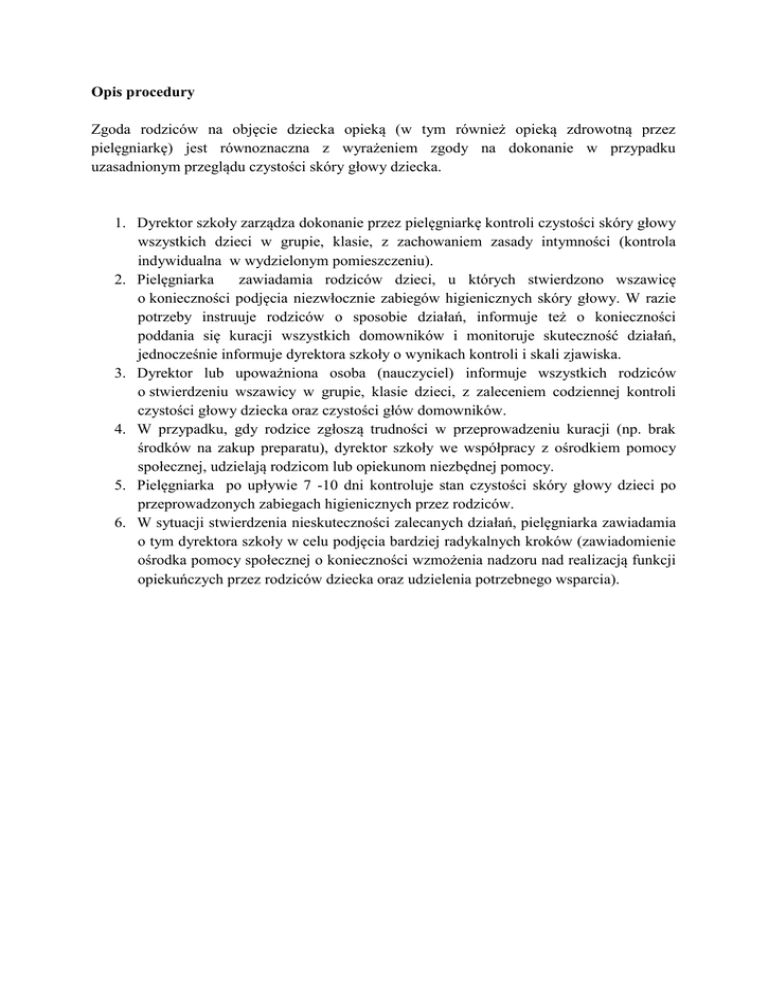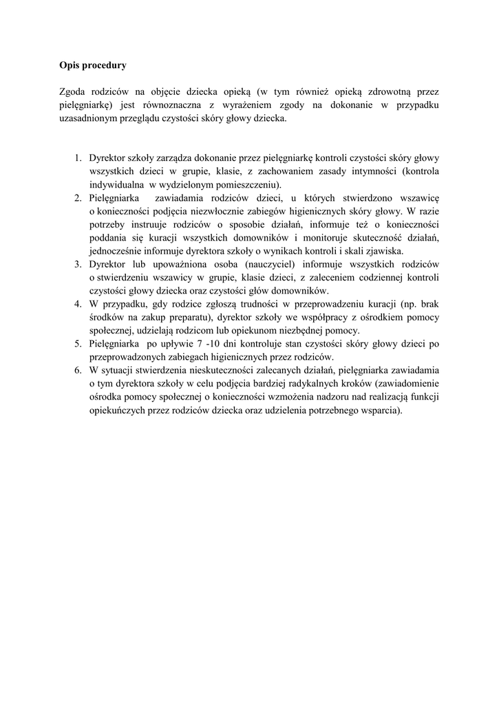 Opis procedury Zgoda rodziców na objęcie dziecka opieką (w tym również opieką zdrowotną przez pielęgniarkę) jest równoznaczna z wyrażeniem zgody na dokonanie w przypadku uzasadnionym przeglądu czystości skóry głowy dziecka. 1. Dyrektor szkoły zarządza dokonanie przez pielęgniarkę kontroli czystości skóry głowy wszystkich dzieci w grupie, klasie, z zachowaniem zasady intymności (kontrola indywidualna w wydzielonym pomieszczeniu). 2. Pielęgniarka zawiadamia rodziców dzieci, u których stwierdzono wszawicę o konieczności podjęcia niezwłocznie zabiegów higienicznych skóry głowy. W razie potrzeby instruuje rodziców o sposobie działań, informuje też o konieczności poddania się kuracji wszystkich domowników i monitoruje skuteczność działań, jednocześnie informuje dyrektora szkoły o wynikach kontroli i skali zjawiska. 3. Dyrektor lub upoważniona osoba (nauczyciel) informuje wszystkich rodziców o stwierdzeniu wszawicy w grupie, klasie dzieci, z zaleceniem codziennej kontroli czystości głowy dziecka oraz czystości głów domowników. 4. W przypadku, gdy rodzice zgłoszą trudności w przeprowadzeniu kuracji (np. brak środków na zakup preparatu), dyrektor szkoły we współpracy z ośrodkiem pomocy społecznej, udzielają rodzicom lub opiekunom niezbędnej pomocy. 5. Pielęgniarka po upływie 7 -10 dni kontroluje stan czystości skóry głowy dzieci po przeprowadzonych zabiegach higienicznych przez rodziców. 6. W sytuacji stwierdzenia nieskuteczności zalecanych działań, pielęgniarka zawiadamia o tym dyrektora szkoły w celu podjęcia bardziej radykalnych kroków (zawiadomienie ośrodka pomocy społecznej o konieczności wzmożenia nadzoru nad realizacją funkcji opiekuńczych przez rodziców dziecka oraz udzielenia potrzebnego wsparcia).