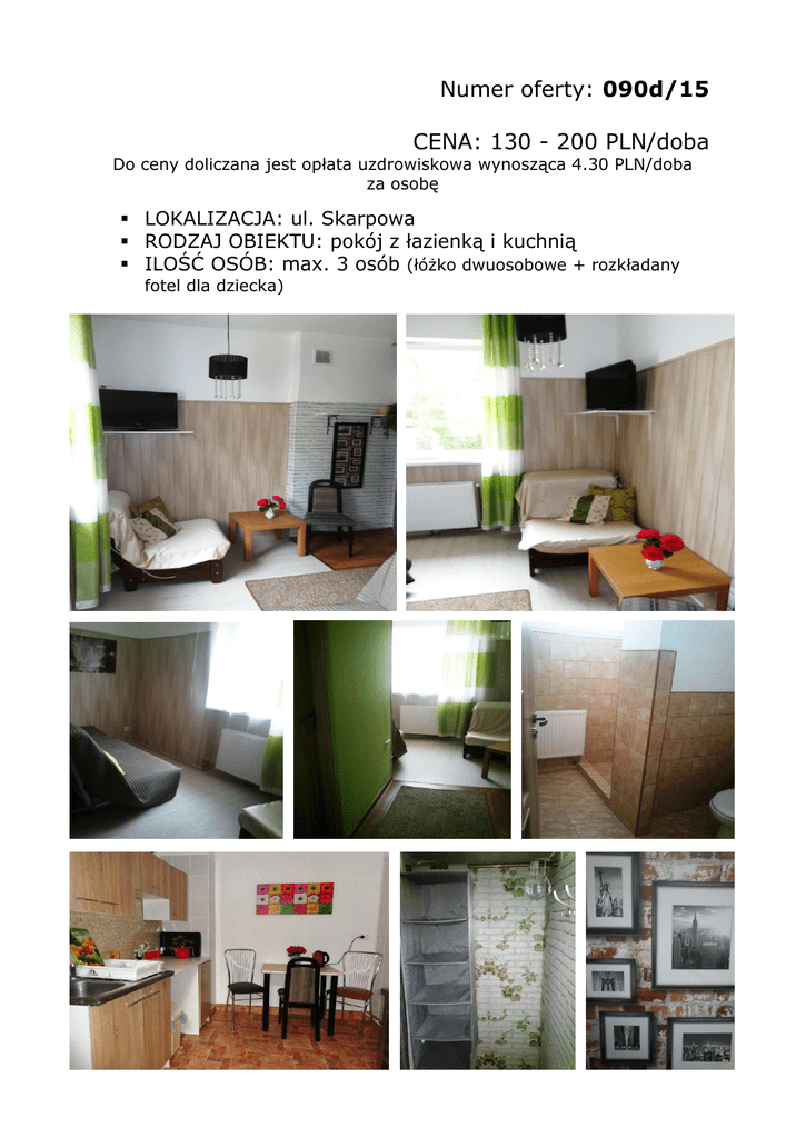 Numer oferty: 090d/15 CENA: 130 - 200 PLN/doba Do ceny doliczana jest opłata uzdrowiskowa wynosząca 4.30 PLN/doba za osobę LOKALIZACJA: ul. Skarpowa RODZAJ OBIEKTU: pokój z łazienką i kuchnią ILOŚĆ OSÓB: max. 3 osób (łóżko dwuosobowe + rozkładany fotel dla dziecka) Numer oferty: 090d/15 LOKALIZACJA: ul. Skarpowa Lp. PRZEDMIOT OCENY UWAGI 1. Nowe/stare budownictwo Nowe budownictwo 2. Nowe/stare meble Nowe meble 3. Parking na posesji/Garaż Na posesji parking 4. Balkon / taras / ogródek Ogródek, taras 5. Telewizor (Kablówka, TV Sat), Radio TV, Radio 6. Dostęp do telefonu nie 7. Dostęp do internetu nie 8. Dostęp do kuchni: Lodówka Kuchenka Czajnik bezprzewodowy Wyposażenie (sztućce, zastawa, garnki) 9. Mała kuchnia w pełni wyposażona w: lodówkę, kuchenkę elektryczną, czajnik bezprzewodowy oraz zastawę i garnki Dostęp do łazienki: Wanna Kabina prysznicowa Oddzielnie WC Łazienka współużytkowana Łazienka z prysznicem, WC 10. Pościel, ręczniki Pościel 11. Dostęp do szafy / półek Tak 12. Pobyt ze zwierzątkiem Do uzgodnienia 14. Niepełnosprawni (winda, podjazd) Obiekt nieprzystosowany 15. Plac zabaw dla dzieci W pobliżu 16. 17. Lokalizacja Centrum – Dworzec PKP Plaża, park Dzielnica Komunikacja miejska Osoby palące 18. Piwnica/schowek Tak 19. Faktura VAT lub Rachunek Rachunek 20. Inne Spokojna okolica, około 15 minut pieszo do ul. Boh. Monte Cassino, 10 minut do dworca, do plaży 10 minut. Tak