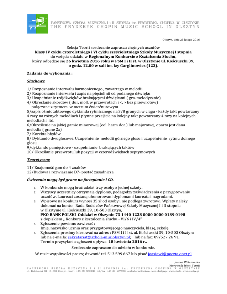Olsztyn, dnia 23 lutego 2016 Sekcja Teorii serdecznie zaprasza chętnych uczniów klasy IV cyklu czteroletniego i VI cyklu sześcioletniego Szkoły Muzycznej I stopnia do wzięcia udziału w Regionalnym Konkursie z Kształcenia Słuchu, który odbędzie się 26 kwietnia 2016 roku w PSM I i II st. w Olsztynie ul. Kościuszki 39, o godz. 12.00 w sali im. Izy Garglinowicz (122). Zadania do wykonania : Słuchowe 1/ Rozpoznanie interwału harmonicznego , zawartego w melodii 2/ Rozpoznanie interwału i zapis na pięciolinii od podanego dźwięku 3/ Uzupełnianie trójdźwięków brakującymi dźwiękami ( gra. melodycznie) 4/ Określanie akordów ( dur, moll, w przewrotach i <, > bez przewrotów) połączone z rytmem w metrum ćwierćnutowym 5/zapis ośmiotaktowego dyktanda rytmicznego na 3/8 granych w ciągu - każdy takt powtarzany 4 razy na różnych melodiach i płynne przejście na kolejny takt powtarzany 4 razy na kolejnych melodiach i itd. 6/Określenie na jakiej gamie minorowej (eol. harm dor.) lub majorowej, oparta jest dana melodia ( grane 2x) 7/ Korekta błędów 8/ Dyktando dwugłosowe. Uzupełnienie melodii górnego głosu i uzupełnienie rytmu dolnego głosu 9/dyktando pamięciowe - uzupełnianie brakujących taktów 10/ Określanie przewrotu lub pozycji w czterodźwiękach septymowych Teoretyczne 11/ Znajomość gam do 4 znaków 12/Budowa i rozwiązanie D7- postać zasadnicza Ćwiczenia mogą być grane na fortepianie i CD. 1. 2. 3. 4. 5. W konkursie mogą brać udział trzy osoby z jednej szkoły. Wszyscy uczestnicy otrzymają dyplomy, pedagodzy zaświadczenia o przygotowaniu uczniów. Laureaci zostaną uhonorowani dyplomami laureata i nagrodami. Wpisowe na konkurs wynosi 35 zł od osoby i nie podlega zwrotowi. Wpłaty należy dokonać na konto: Rada Rodziców Państwowej Szkoły Muzycznej I i II stopnia w Olsztynie ul. Kościuszki 39, 10-503 Olsztyn, PKO BANK POLSKI Oddział w Olszynie 73 1440 1228 0000 0000 0189 0198 z dopiskiem „ Konkurs z kształcenia słuchu - VI/6 i IV/4” Zgłoszenie powinno zawierać : Imię, nazwisko ucznia oraz przygotowującego nauczyciela, klasę, szkołę. Zgłoszenia prosimy kierować na adres : PSM I i II st. ul. Kościuszki 39, 10-503 Olsztyn; lub na e-maila: [email protected]; lub na fax: 89/527 26 91. Termin przysyłania zgłoszeń upływa 18 kwietnia 2016 r.. Serdecznie zapraszam do udziału w konkursie. W razie wątpliwości proszę dzwonić tel. 513 599 667 lub pisać [email protected] Joanna Wiśniewska Kierownik Sekcji Teorii