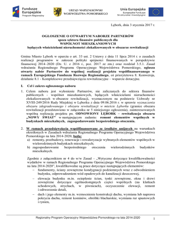 Lębork, dnia 3 stycznia 2017 r. OGŁOSZENIE O OTWARTYM NABORZE PARTNERÓW spoza sektora finansów publicznych dla WSPÓLNOT MIESZKANIOWYCH będących właścicielami nieruchomości zlokalizowanych w obszarze rewitalizacji Gmina Miasto Lębork w oparciu o art. 33 ust. 2 Ustawy z dnia 11 lipca 2014 r. o zasadach realizacji programów w zakresie polityki spójności finansowanych w perspektywie finansowej 2014–2020 (Dz. U. z 2016 r., poz. 2017 ze zm.) oraz rozdział 3.5.1. Zasad wdrażania Regionalnego Programu Operacyjnego Województwa Pomorskiego, ogłasza otwarty nabór Partnerów do wspólnej realizacji projektu współfinansowanego w ramach Europejskiego Funduszu Rozwoju Regionalnego, oś priorytetowa 8. Konwersja, działanie 8.1 - Kompleksowe przedsięwzięcia rewitalizacyjne – wsparcie dotacyjne. I. Cel i zakres ogłoszonego naboru 1. Celem naboru jest wyłonienie Partnerów, nie zaliczanych do sektora finansów publicznych - wspólnot mieszkaniowych, będących właścicielami nieruchomości zlokalizowanych w obszarze rewitalizacji, wyznaczonym na podstawie Uchwały nr XVIII-249/2016 Rady Miejskiej w Lęborku z dnia 09.06.2016 r. w sprawie wyznaczenia obszaru zdegradowanego i obszaru rewitalizacji w mieście Lęborku (granice obszaru rewitalizacji przedstawiono w załączniku nr 5 niniejszego ogłoszenia), zainteresowanych wspólną realizacją projektu pn. ODNOWIONY LĘBORK – rewitalizacja obszaru „NOWY ŚWIAT” w następującym zadaniu: remont elementów wspólnych w budynkach mieszkalnych, zagospodarowanie bezpośredniego otoczenia. 2. W ramach przedsięwzięcia współfinansowane ze środków unijnych na warunkach określonych w Zasadach wdrażania Regionalnego Programu Operacyjnego Województwa Pomorskiego na lata 2014-2020, będą: a) remonty, przebudowy, renowacje i rewaloryzacje wybranych elementów wspólnych w wielorodzinnych budynkach mieszkalnych; b) zagospodarowanie bezpośredniego otoczenia wielorodzinnych budynków mieszkalnych. Zgodnie z załącznikiem nr 4 do w/w Zasad – „Wytyczne dotyczące kwalifikowalności wydatków w ramach Regionalnego Programu Operacyjnego Województwa Pomorskiego na lata 2014-2020”, kwalifikowalne są prace dotyczące następujących elementów: fundamenty, ściany zewnętrzne kondygnacji podziemnych wraz z odwodnieniem budynku, odprowadzeniem wód opadowych do kanalizacji deszczowej, elewacja budynku m.in. ocieplenie ścian, tynki zewnętrzne, okna i drzwi zewnętrzne dotyczące ogólnodostępnych części wspólnych (na klatkach schodowych, strychach, w piwnicach), oczyszczenie elewacji, remont i odtworzenie detali, dach i jego elementy m.in. wzmocnienie konstrukcji dachu, wymiana lub naprawa pokrycia dachu, remont kominów, obróbki blacharskie, wymiana rur spustowych i rynien, 1 klatki schodowe m.in. tynki i oblicowania, odtworzenie detali, roboty malarskie, inne roboty wykończeniowe ścian wewnętrznych, posadzki, schody, instalacja oświetleniowa. Wyciąg z wytycznych stanowi Załącznik nr 4 do Ogłoszenia o naborze i ma znaczenie wyłącznie informacyjne. Wszelkie wątpliwości będą rozstrzygane z uwzględnieniem pełnego dokumentu Zasad wdrażania RPO WP 2014-2020. 3. Wydatki na: a) remonty, przebudowy, renowacje i rewaloryzacje wybranych elementów wspólnych w wielorodzinnych budynkach mieszkalnych nie mogą przekroczyć limitu 120 000 zł kosztów kwalifikowalnych na jeden obiekt; b) zagospodarowanie bezpośrednie otoczenia wielorodzinnych budynków mieszkalnych nie podlega limitowi; c) w sytuacji, gdy w jednym projekcie planowane są oba rodzaje wydatków (zarówno na remonty jak i zagospodarowane otoczenia), limit na remonty, przebudowy, renowacje i rewaloryzacje wybranych elementów wspólnych jest zwiększony do kwoty 180 000 zł kosztów kwalifikowalnych na jeden obiekt. 4. Planowany okres realizacji projektu, w tym wskazanych powyżej zakresów, to marzec 2018 r. - grudzień 2020 r. 5. Niezbędnym warunkiem zawarcia umowy Partnerstwa jest wniesienie wkładu własnego finansowego w wysokości minimum 15% kosztów kwalifikowalnych przedsięwzięcia planowanego do realizacji przez daną Wspólnotę Mieszkaniową. 6. Do zadań i obowiązków Partnerów (Wspólnot Mieszkaniowych) wyłonionych w drodze obecnego naboru, należeć będzie współpraca z Gminą Miasto Lębork w zakresie: a) udostępnienia niezbędnych danych, dokumentów i pozwoleń; b) współuczestnictwa w realizacji ujętych w ramach projektu działań, w tym w przeprowadzeniu niezbędnych procedur formalno-prawnych niezbędnych do udzielenia zamówienia oraz w procesie planowania inwestycji; c) wniesienia wkładu własnego finansowego w wysokości minimum 15% wydatków kwalifikowalnych przedsięwzięcia planowanego do realizacji; d) przygotowania niezbędnej dokumentacji do rozliczenia projektu; e) zapewnienia trwałości projektu przez okres co najmniej 5 lat, poprzez zobowiązanie do braku zmiany sposobu wykorzystania części wspólnych. 7. Z podmiotami wybranymi na Partnerów projektu zawarte zostaną umowy partnerskie, uwzględniające zasady współpracy w w/w zakresie. II. Dane dotyczące złożenia oferty i terminu. 1. Wymagania dla kandydatów na Partnerów projektu. W celu spełnienia wymogów formalnych udziału w projekcie podmiot musi: a) posiadać status Wspólnoty Mieszkaniowej; b) być właścicielem nieruchomości zlokalizowanych w obszarze rewitalizacji, wyznaczonym na podstawie Uchwały nr XVIII-249/2016 Rady Miejskiej w Lęborku z 2 c) d) e) f) g) dnia 09.06.2016 r. w sprawie wyznaczenia obszaru zdegradowanego i obszaru rewitalizacji w mieście Lęborku; złożyć projekt przedsięwzięcia, którego zakres dotyczy prac wskazanych jako kwalifikowalne zgodnie z załącznikiem nr 4 do Zasad wdrażania Regionalnego Programu Operacyjnego Województwa Pomorskiego na lata 2014-2020 – „Wytyczne dotyczące kwalifikowalności wydatków w ramach Regionalnego Programu Operacyjnego Województwa Pomorskiego na lata 2014-2020”, a ko