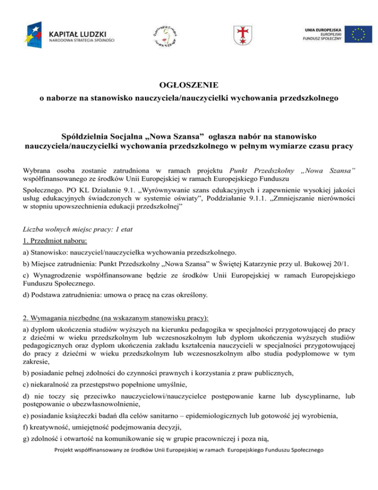 OGŁOSZENIE o naborze na stanowisko nauczyciela/nauczycielki wychowania przedszkolnego Spółdzielnia Socjalna „Nowa Szansa” ogłasza nabór na stanowisko nauczyciela/nauczycielki wychowania przedszkolnego w pełnym wymiarze czasu pracy Wybrana osoba zostanie zatrudniona w ramach projektu Punkt Przedszkolny „Nowa Szansa” współfinansowanego ze środków Unii Europejskiej w ramach Europejskiego Funduszu Społecznego. PO KL Działanie 9.1. „Wyrównywanie szans edukacyjnych i zapewnienie wysokiej jakości usług edukacyjnych świadczonych w systemie oświaty”, Poddziałanie 9.1.1. „Zmniejszanie nierówności w stopniu upowszechnienia edukacji przedszkolnej” Liczba wolnych miejsc pracy: 1 etat 1. Przedmiot naboru: a) Stanowisko: nauczyciel/nauczycielka wychowania przedszkolnego. b) Miejsce zatrudnienia: Punkt Przedszkolny „Nowa Szansa” w Świętej Katarzynie przy ul. Bukowej 20/1. c) Wynagrodzenie współfinansowane będzie ze środków Unii Europejskiej w ramach Europejskiego Funduszu Społecznego. d) Podstawa zatrudnienia: umowa o pracę na czas określony. 2. Wymagania niezbędne (na wskazanym stanowisku pracy): a) dyplom ukończenia studiów wyższych na kierunku pedagogika w specjalności przygotowującej do pracy z dziećmi w wieku przedszkolnym lub wczesnoszkolnym lub dyplom ukończenia wyższych studiów pedagogicznych oraz dyplom ukończenia zakładu kształcenia nauczycieli w specjalności przygotowującej do pracy z dziećmi w wieku przedszkolnym lub wczesnoszkolnym albo studia podyplomowe w tym zakresie, b) posiadanie pełnej zdolności do czynności prawnych i korzystania z praw publicznych, c) niekaralność za przestępstwo popełnione umyślnie, d) nie toczy się przeciwko nauczycielowi/nauczycielce postępowanie karne lub dyscyplinarne, lub postępowanie o ubezwłasnowolnienie, e) posiadanie książeczki badań dla celów sanitarno – epidemiologicznych lub gotowość jej wyrobienia, f) kreatywność, umiejętność podejmowania decyzji, g) zdolność i otwartość na komunikowanie się w grupie pracowniczej i poza nią, Projekt współfinansowany ze środków Unii Europejskiej w ramach Europejskiego Funduszu Społecznego h) znajomość i obsługa programów komputerowych: pakietu MS Office, umiejętność korzystania z poczty elektronicznej, Internetu, i) wysoka kultura osobista. 3. Wymagania dodatkowe: • Preferowane będą osoby ze stopniem rozwoju zawodowego nauczyciela mianowanego; • Preferowane będą osoby zamieszkujące Gminę Siechnice; • Preferowane będą osoby mające doświadczenie i kompetencje w pracy z dziećmi w wieku 3-5 lat w grupach różnowiekowych. 4. Zakres wykonywanych zadań na stanowisku: a) Przygotowanie autorskiego programu realizacji podstawy programowej w przedszkolu na okres trwania projektu oraz konspekty zajęć na każdy dzień pracy; b) Realizacja podstawy programowej określonej w załączniku nr 1 do rozporządzenia Ministra Edukacji Narodowej z dnia 23 grudnia 2008 r. (Dz. U z 2009 r. Nr 4 poz. 1); c) Opieka nad dziećmi; d) Informowanie rodziców o postępach dzieci; e) Dokonywanie ewaluacji pracy dydaktyczno-wychowawczo-opiekuńczej oraz dokonywanie ewaluacji osiągnięć rozwojowych dziecka pod kątem rozwoju postaw, umiejętności i poziomu wiedzy, w tym, w zakresie rezultatów wskazanych w projekcie; f) Prowadzenie dokumentacji pedagogicznej. g) Prowadzenie dokumentacji projektowej nauczyciela zgodnie z wytycznymi koordynatora projektu. 5. Wymagane dokumenty: a) życiorys (CV), b) list motywacyjny, c) na rozmowie kwalifikacyjnej: - kopie: dyplomów ukończenia studiów, świadectw ukończenia szkół potwierdzających zdobyte wykształcenie lub ich odpisy oraz dokumentujące doświadczenie zawodowe, a także inne dodatkowe dokumenty. - książeczka zdrowia do wglądu lub zaświadczenie lekarskie o stanie zdrowia pozwalającym na pracę na stanowisku nauczyciela/nauczycielki wychowania przedszkolnego, - oświadczenie o tym, że nie toczy się przeciwko nauczycielowi postępowanie karne lub dyscyplinarne, lub postępowanie o ubezwłasnowolnienie oraz że nie został skazany prawomocnym wyrokiem za popełnienie przestępstwa umyślnego. Projekt współfinansowany ze środków Unii Europejskiej w ramach Europejskiego Funduszu Społecznego Wymagane dokumenty aplikacyjne należy składać za pośrednictwem poczty elektronicznej na adres: [email protected], poczty tradycyjnej lub osobiście w biurze projektu przy ul. Bukowej 20/1 w 55-010 Święta Katarzyna, z dopiskiem: Dotyczy naboru na stanowisko nauczyciela/nauczycielki wychowania przedszkolnego – w ramach projektu POKL Punkt Przedszkolny „Nowa Szansa”. Termin złożenia ofert upływa dnia 2 sierpnia 2013 r. Oferty złożone po terminie nie będą rozpatrywane. Za datę złożenia dokumentów drogą pocztową uważa się datę stempla pocztowego polskiego urzędu pocztowego. Informacja o wyniku naboru będzie umieszczona na stronie internetowej: www.punkt-przedszkolny.eu oraz w Biurze Projektu. Wymagane dokumenty aplikacyjne: list motywacyjny, szczegółowe CV powinny być opatrzone klauzulą: Wyrażam zgodę na przetwarzanie moich danych osobowych zawartych w ofercie pracy dla potrzeb niezbędnych do realizacji procesu rekrutacji zgodnie z ustawą z dnia 29 sierpnia 1997 r. o ochronie danych osobowych (Dz. U. z 2002 r. Nr 101, poz. 926 z późn. zm.) oraz ustawą z dnia 22 marca 1999 r. o pracownikach samorządowych (Dz. U. z 2001 r. Nr 142, poz. 1593 z późn. zm.), a także Oświadczeniem o zapoznaniu się z regulaminem naboru na wolne stanowiska w projekcie Punkt Przedszkolny „Nowa Szansa” oraz regulaminem naboru i uczestnictwa w projekcie Punkt Przedszkolny „Nowa Szansa” zamieszczonymi na stronie projektu. Projekt współfinansowany ze środków Unii Europejskiej w ramach Europejskiego Funduszu Społecznego