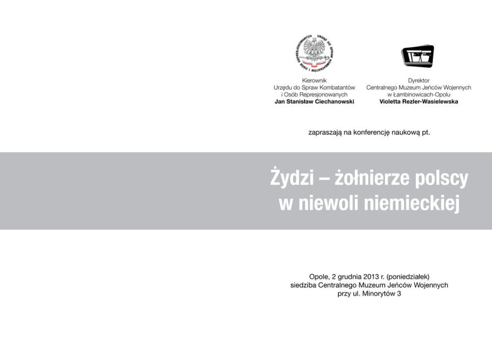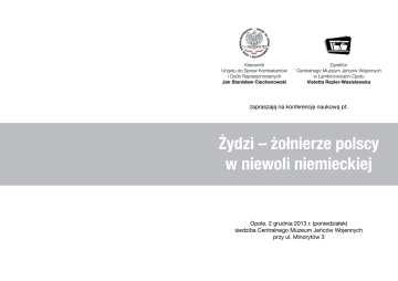 Kierownik Urzędu do Spraw Kombatantów i Osób Represjonowanych Jan Stanisław Ciechanowski Dyrektor Centralnego Muzeum Jeńców Wojennych w Łambinowicach-Opolu Violetta Rezler-Wasielewska zapraszają na konferencję naukową pt. Żydzi – żołnierze polscy w niewoli niemieckiej Opole, 2 grudnia 2013 r. (poniedziałek) siedziba Centralnego Muzeum Jeńców Wojennych przy ul. Minorytów 3 Program Patronat honorowy Jan Stanisław Ciechanowski Kierownik Urzędu do Spraw Kombatantów i Osób Represjonowanych Patronat medialny 11.00–11.15 Salomon Strauss-Marko, Fragmenty wspomnień Andrzej Czernik (Teatr im. Jana Kochanowskiego w Opolu) 11.15–11.30 Powitanie dr Violetta Rezler-Wasielewska (CMJW w ŁambinowicachOpolu), prof. dr hab. Danuta Kisielewicz (Uniwersytet Opolski, Stowarzyszenie Przyjaciół CMJW w Łambinowicach-Opolu) 11.30–11.50 Żydzi w Wojsku Polskim w latach 1918–1939 dr hab. Aleksander Woźny, Opole 11.50–12.10 Historiografia polska o udziale Żydów w wojnie dr Maciej Borkowski (Państwowy Instytut Naukowy. Instytut Śląski w Opolu) 12.10–12.30 Żydzi w kampanii polskiej 1939 r. prof. dr hab. Tomasz Gąsowski (Instytut Historii Uniwersytetu Jagiellońskiego) 12.30–13.20 Przerwa 13.20–13.40 Niemieckie rozporządzenia w sprawie traktowania Żydów w niewoli dr Jan Bańbor (Archiwum Akt Nowych w Warszawie) 13.40–14.00 Żydzi-żołnierze Wojska Polskiego w obozach Wehrmachtu dr Violetta Rezler-Wasielewska (CMJW w ŁambinowicachOpolu) 14.00–14.20 Wśród jeńców z Powstania Warszawskiego dr Piotr Stanek (CMJW w Łambinowicach-Opolu) 14.20–14.40 Historia obozu, historia ludzi. Żydzi-żołnierze Wojska Polskiego w obozie SS przy ul. Lipowej 7 w Lublinie Marta Grudzińska (Państwowe Muzeum na Majdanku) 14.40–15.00 SS-Sonderkommnado Dirlewanger wobec Żydów na Lubelszczyźnie, ze szczególnym uwzględnieniem obozu jenieckiego przy ul. Lipowej 7 Hubert Kuberski, Warszawa 15.00–15.20 Żydowski ruch kombatancki w Polsce dr August Grabski (Żydowski Instytut Historyczny) 15.20–16.00 Dyskusja i podsumowanie prof. dr hab. Danuta Kisielewicz (Uniwersytet Opolski), dr Violetta Rezler-Wasielewska (CMJW w Łambinowicach-Opolu)