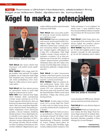 Temat Kögel Rozmowa z Ulrichem Humbaurem, właścicielem firmy Kögel oraz Volkerem Seitz, dyrektorem ds. komunikacji Kögel to marka z potencjałem rantuje stabilną przyszłość naszej bawarskiej tradycyjnej marki Kögel. Ulrich Humbaur, właściciel firmy Kögel Truck Auto.pl: Jakie motywy skłoniły Pana do przejęcia, w tak ciężkich czasach, upadłego Kögela? Ulrich Humbaur: Dobry image marki Kögel, produkty i duży potencjał. Nie mogłem przyglądać się, jak tradycyjna marka Kögel była zarządzana przez ówczesnych właścicieli. Jestem przedsiębiorcą z krwi i kości. Kögel ma wielką szansę na wzrost i generowanie zysków. Truck Auto.pl: Jakie Pana zdaniem powinny być wprowadzone zmiany, by marka Kögel mogła być konkurencyjna na rynku? Volker Seitz: Nowy właściciel firmy Kögel, Ulrich Humbaur, działa z powodzeniem w branży naczep i przyczep już od 25 lat. Posiada ogromne doświadczenie, które jest konieczne do zapewnienia sukcesów w przyszłości. Także nowy zarząd firmy Kögel składa się z ekspertów branży. Naszą paletę produktów uzupełniamy o nowe, innowacyjne produkty, a obecnie budujemy dodatkową fabrykę montażu w Turcji. Kögel będzie także wchodził w nowe segmenty rynku. Przykładowo dla branży budowlanej od 2010 r. oferujemy naczepę niskopodwoziową, a od 2011 naczepę wywrotkę. Obecnie wchodzimy także w produkcję wielozmianową. Różnorodna działalność długoterminowo gwa12 Truck Auto.pl: Jakiej nowej palety produktów (przyczep, naczep) możemy spodziewać się w najbliższym czasie? Ulrich Humbaur: Kögel ma w przygotowaniu wiele nowych, innowacyjnych modeli. Przykładowo Kögel Mega Trailer o wysokości całkowitej 4 metrów, przy 3 metrach wysokości wewnętrznej. Będzie to highlight targów „Transport logistic”, odbywających się w maju 2011 w Monachium. Także Kögel LongPlex, naczepa z dwoma mostami wymiennymi, o wysokości 7,45 m, która produkowana jest od stycznia 2011, spotyka się z dużym zainteresowaniem przewoźników. Absolutnym hitem roku 2011 będzie nowa naczepa wywrotka Kögel, która zostanie zaprezentowana publicznie w drugiej połowie roku 2011. Truck Auto.pl: Czy będzie kontynuowana produkcja cynkowanych ogniowo naczep Big One? Czy stawiacie przede wszystkim na metodę KTL w ochronie przed korozją? Ulrich Humbaur: Kögel jest jedynym dużym producentem naczep, który może zaoferować klientom dwie metody: lakierowanie KTL oraz cynkowanie ogniowe. Oba procesy mają swoje specyficzne zalety dla naszych klientów. Nabywca może zatem zdecydować w Kögel, jaką ochronę przed korozją preferuje. Truck Auto.pl: Na jakim etapie jest obecnie rozwój 14,9 m naczepy Kögel Euro Trailer? Co robicie ażeby ten rodzaj naczepy obowiązywał jako standard dla firm transportowych w Europie? Volker Seitz: Kögel Euro Trailer jest używana z powodzeniem w Niemczech i wschodniej Europie od ponad 5 lat. Klienci i instytuty naukowe, jak np. Instytut Transportu Samochodowego w Warszawie, stwierdzili: ok. 10-proc. redukcję zużycia paliwa, ok. 10-proc. redukcję emisji dwutlenku węgla, wyraźną redukcję kosztów transportu. Euro Trailer jest krótsza o 7 m od „Gigaliner”, ale oferuje wciąż 7 t masy użytkowej więcej. Poza tym przed kilkoma daniami otrzymaliśmy zezwolenie dla 100 naczep Euro Trailer w Polsce. Truck Auto.pl: Z jakich krajów płynie obecnie największa liczba zamówień? Jak w chwili obecnej wygląda stan produkcji w Burtenbach? Jakie są wasze cele na rok 2011? Ulrich Humbaur: Kögel działa w całej Europie. W roku 2010 mogliśmy podwoić naszą sprzedaż w stosunku do roku poprzedniego. Na rok 2011 planujemy jeszcze większy Volker Seitz, dyrektor ds. komunikacji wzrost sprzedaży do 10000 naczep. Aktualna sytuacja zamówień jest bardzo pozytywna. Truck Auto.pl: Jak ważny dla firmy Kögel jest polski rynek? Ulrich Humbaur: Polska jest tradycyjnie ważnym rynkiem dla firmy Kögel. Przed kryzysem Kögel dostarczał do polskich klientów rocznie ponad 3000 naczep. W osobie Krzysztofa Adamiuka posiadamy w Polsce własnego Key Account Managera. Rozmawiał: Zbigniew Witamborski