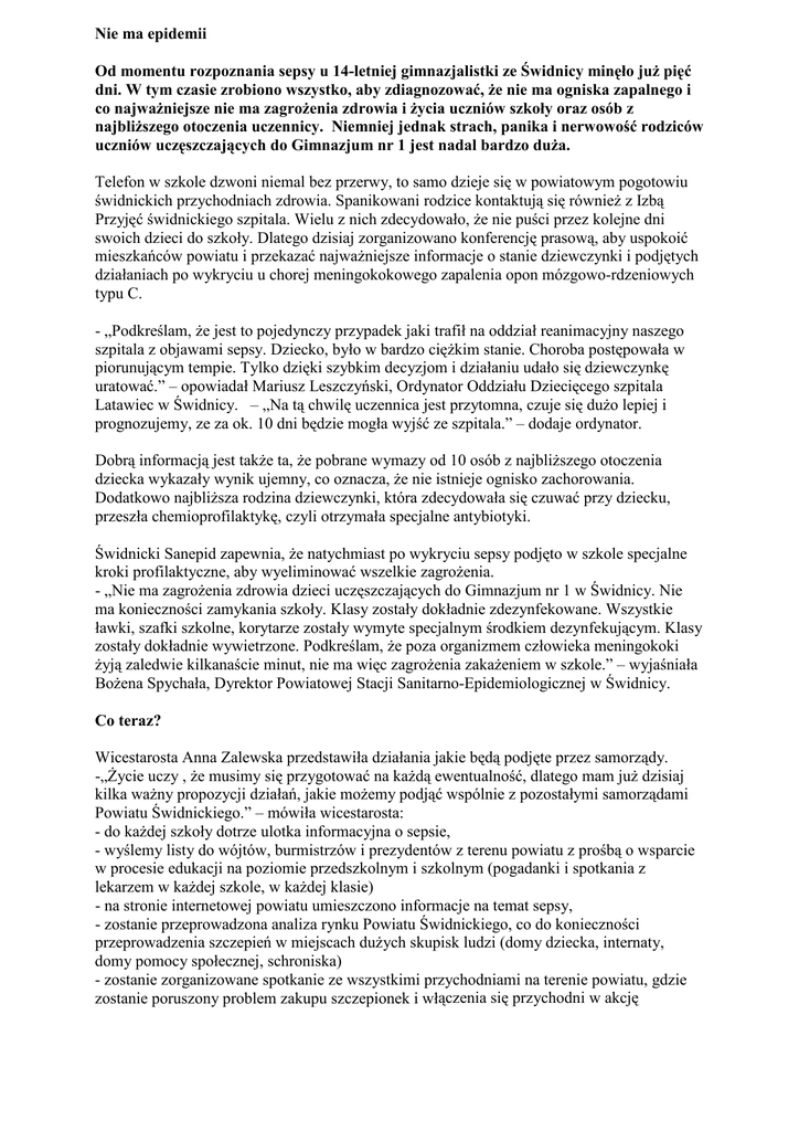 Nie ma epidemii Od momentu rozpoznania sepsy u 14-letniej gimnazjalistki ze Świdnicy minęło juŜ pięć dni. W tym czasie zrobiono wszystko, aby zdiagnozować, Ŝe nie ma ogniska zapalnego i co najwaŜniejsze nie ma zagroŜenia zdrowia i Ŝycia uczniów szkoły oraz osób z najbliŜszego otoczenia uczennicy. Niemniej jednak strach, panika i nerwowość rodziców uczniów uczęszczających do Gimnazjum nr 1 jest nadal bardzo duŜa. Telefon w szkole dzwoni niemal bez przerwy, to samo dzieje się w powiatowym pogotowiu świdnickich przychodniach zdrowia. Spanikowani rodzice kontaktują się równieŜ z Izbą Przyjęć świdnickiego szpitala. Wielu z nich zdecydowało, Ŝe nie puści przez kolejne dni swoich dzieci do szkoły. Dlatego dzisiaj zorganizowano konferencję prasową, aby uspokoić mieszkańców powiatu i przekazać najwaŜniejsze informacje o stanie dziewczynki i podjętych działaniach po wykryciu u chorej meningokokowego zapalenia opon mózgowo-rdzeniowych typu C. - „Podkreślam, Ŝe jest to pojedynczy przypadek jaki trafił na oddział reanimacyjny naszego szpitala z objawami sepsy. Dziecko, było w bardzo cięŜkim stanie. Choroba postępowała w piorunującym tempie. Tylko dzięki szybkim decyzjom i działaniu udało się dziewczynkę uratować.” – opowiadał Mariusz Leszczyński, Ordynator Oddziału Dziecięcego szpitala Latawiec w Świdnicy. – „Na tą chwilę uczennica jest przytomna, czuje się duŜo lepiej i prognozujemy, ze za ok. 10 dni będzie mogła wyjść ze szpitala.” – dodaje ordynator. Dobrą informacją jest takŜe ta, Ŝe pobrane wymazy od 10 osób z najbliŜszego otoczenia dziecka wykazały wynik ujemny, co oznacza, Ŝe nie istnieje ognisko zachorowania. Dodatkowo najbliŜsza rodzina dziewczynki, która zdecydowała się czuwać przy dziecku, przeszła chemioprofilaktykę, czyli otrzymała specjalne antybiotyki. Świdnicki Sanepid zapewnia, Ŝe natychmiast po wykryciu sepsy podjęto w szkole specjalne kroki profilaktyczne, aby wyeliminować wszelkie zagroŜenia. - „Nie ma zagroŜenia zdrowia dzieci uczęszczających do Gimnazjum nr 1 w Świdnicy. Nie ma konieczności zamykania szkoły. Klasy zostały dokładnie zdezynfekowane. Wszystkie ławki, szafki szkolne, korytarze zostały wymyte specjalnym środkiem dezynfekującym. Klasy zostały dokładnie wywietrzone. Podkreślam, Ŝe poza organizmem człowieka meningokoki Ŝyją zaledwie kilkanaście minut, nie ma więc zagroŜenia zakaŜeniem w szkole.” – wyjaśniała BoŜena Spychała, Dyrektor Powiatowej Stacji Sanitarno-Epidemiologicznej w Świdnicy. Co teraz? Wicestarosta Anna Zalewska przedstawiła działania jakie będą podjęte przez samorządy. -„śycie uczy , Ŝe musimy się przygotować na kaŜdą ewentualność, dlatego mam juŜ dzisiaj kilka waŜny propozycji działań, jakie moŜemy podjąć wspólnie z pozostałymi samorządami Powiatu Świdnickiego.” – mówiła wicestarosta: - do kaŜdej szkoły dotrze ulotka informacyjna o sepsie, - wyślemy listy do wójtów, burmistrzów i prezydentów z terenu powiatu z prośbą o wsparcie w procesie edukacji na poziomie przedszkolnym i szkolnym (pogadanki i spotkania z lekarzem w kaŜdej szkole, w kaŜdej klasie) - na stronie internetowej powiatu umieszczono informacje na temat sepsy, - zostanie przeprowadzona analiza rynku Powiatu Świdnickiego, co do konieczności przeprowadzenia szczepień w miejscach duŜych skupisk ludzi (domy dziecka, internaty, domy pomocy społecznej, schroniska) - zostanie zorganizowane spotkanie ze wszystkimi przychodniami na terenie powiatu, gdzie zostanie poruszony problem zakupu szczepionek i włączenia się przychodni w akcję informującą społeczeństwo o chorobie (dzisiaj tylko 4 przychodnie w powiecie posiadają szczepionki). Spotkanie zaplanowano juŜ na jutro na godz. 14.00. Urząd Miasta Świdnica juŜ dzisiaj zadeklarował pomoc w zakupie szczepionek, jeśli będzie taka konieczność. Obserwujmy nasze dzieci Sepsa jest chorobą, która rozwija się niezwykle szybko i gwałtownie. Dziecko staje się coraz słabsze, apatyczne, ma gorączkę i ból głowy. Często występują wymioty i wysypka. Przypominamy, Ŝe powiatowy inspektor sanitarny uświadamia, Ŝe wystarczy przestrzegać podstawowych zasad higieny, Ŝeby uniknąć niebezpieczeństwa zakaŜenia. W szkole chodzi o wietrzenie klas podczas przerw, niepicie przez dzieci na stołówkach z jednego kubka, nieuŜywanie tych samych sztućców. Choroba rozprzestrzenia się bowiem drogą kropelkową. Na początku występują objawy grypopodobne, których nasilenie pozornie zmniejsza się po 46 godzinach, co czasem prowadzi do opóźnienia momentu postawienia diagnozy i rozpoczęcia leczenia. Charakterystyczne objawy zakaŜeń meningokokowych, czyli sztywność karku i drobne wybroczyny, zwykle pojawiają się dopiero w zaawansowanych stadiach choroby. Korzystne rokowanie zaleŜy od szybkiego postawienia prawidłowego rozpoznania i bezzwłocznego rozpoczęcia leczenia.
