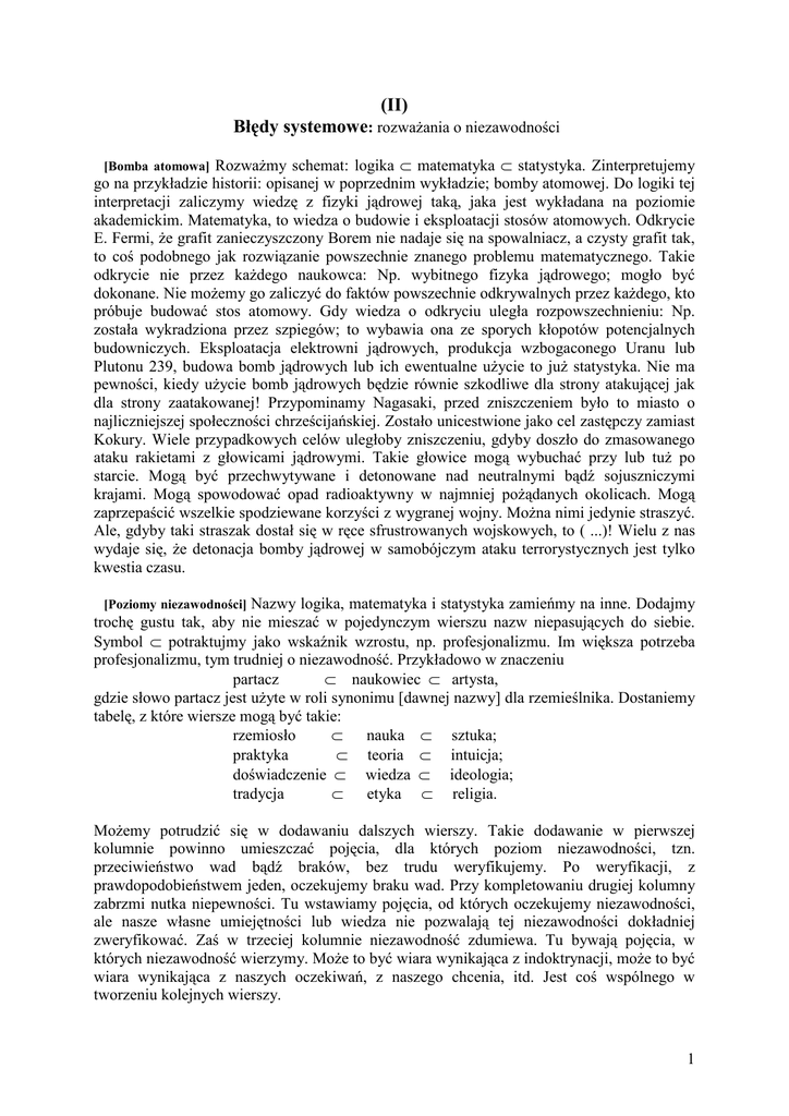 (II) Błędy systemowe: rozwaŜania o niezawodności [Bomba atomowa] RozwaŜmy schemat: logika ⊂ matematyka ⊂ statystyka. Zinterpretujemy go na przykładzie historii: opisanej w poprzednim wykładzie; bomby atomowej. Do logiki tej interpretacji zaliczymy wiedzę z fizyki jądrowej taką, jaka jest wykładana na poziomie akademickim. Matematyka, to wiedza o budowie i eksploatacji stosów atomowych. Odkrycie E. Fermi, Ŝe grafit zanieczyszczony Borem nie nadaje się na spowalniacz, a czysty grafit tak, to coś podobnego jak rozwiązanie powszechnie znanego problemu matematycznego. Takie odkrycie nie przez kaŜdego naukowca: Np. wybitnego fizyka jądrowego; mogło być dokonane. Nie moŜemy go zaliczyć do faktów powszechnie odkrywalnych przez kaŜdego, kto próbuje budować stos atomowy. Gdy wiedza o odkryciu uległa rozpowszechnieniu: Np. została wykradziona przez szpiegów; to wybawia ona ze sporych kłopotów potencjalnych budowniczych. Eksploatacja elektrowni jądrowych, produkcja wzbogaconego Uranu lub Plutonu 239, budowa bomb jądrowych lub ich ewentualne uŜycie to juŜ statystyka. Nie ma pewności, kiedy uŜycie bomb jądrowych będzie równie szkodliwe dla strony atakującej jak dla strony zaatakowanej! Przypominamy Nagasaki, przed zniszczeniem było to miasto o najliczniejszej społeczności chrześcijańskiej. Zostało unicestwione jako cel zastępczy zamiast Kokury. Wiele przypadkowych celów uległoby zniszczeniu, gdyby doszło do zmasowanego ataku rakietami z głowicami jądrowymi. Takie głowice mogą wybuchać przy lub tuŜ po starcie. Mogą być przechwytywane i detonowane nad neutralnymi bądź sojuszniczymi krajami. Mogą spowodować opad radioaktywny w najmniej poŜądanych okolicach. Mogą zaprzepaścić wszelkie spodziewane korzyści z wygranej wojny. MoŜna nimi jedynie straszyć. Ale, gdyby taki straszak dostał się w ręce sfrustrowanych wojskowych, to ( ...)! Wielu z nas wydaje się, Ŝe detonacja bomby jądrowej w samobójczym ataku terrorystycznych jest tylko kwestia czasu. Nazwy logika, matematyka i statystyka zamieńmy na inne. Dodajmy trochę gustu tak, aby nie mieszać w pojedynczym wierszu nazw niepasujących do siebie. Symbol ⊂ potraktujmy jako wskaźnik wzrostu, np. profesjonalizmu. Im większa potrzeba profesjonalizmu, tym trudniej o niezawodność. Przykładowo w znaczeniu partacz ⊂ naukowiec ⊂ artysta, gdzie słowo partacz jest uŜyte w roli synonimu [dawnej nazwy] dla rzemieślnika. Dostaniemy tabelę, z które wiersze mogą być takie: rzemiosło ⊂ nauka ⊂ sztuka; praktyka ⊂ teoria ⊂ intuicja; doświadczenie ⊂ wiedza ⊂ ideologia; tradycja ⊂ etyka ⊂ religia. [Poziomy niezawodności] MoŜemy potrudzić się w dodawaniu dalszych wierszy. Takie dodawanie w pierwszej kolumnie powinno umieszczać pojęcia, dla których poziom niezawodności, tzn. przeciwieństwo wad bądź braków, bez trudu weryfikujemy. Po weryfikacji, z prawdopodobieństwem jeden, oczekujemy braku wad. Przy kompletowaniu drugiej kolumny zabrzmi nutka niepewności. Tu wstawiamy pojęcia, od których oczekujemy niezawodności, ale nasze własne umiejętności lub wiedza nie pozwalają tej niezawodności dokładniej zweryfikować. Zaś w trzeciej kolumnie niezawodność zdumiewa. Tu bywają pojęcia, w których niezawodność wierzymy. MoŜe to być wiara wynikająca z indoktrynacji, moŜe to być wiara wynikająca z naszych oczekiwań, z naszego chcenia, itd. Jest coś wspólnego w tworzeniu kolejnych wierszy. 1 [Zasady dyskusji] Zacznijmy od cytatów z dialogu Platona „Menon”. Pierwszy z tych cytatów daje wskazówki, na jakich warunkach warto prowadzić dyskusję. Dwa pozostałe sugerują, iŜ zaawansowana dociekliwość, choć jednej ze stron w dyskusji, często prowadzi do tego, Ŝe obie strony zaczynają mieć wątpliwości. Co ciekawsze, jako to wynika z obu końcowych cytatów, strona naprowadzająca na wątpliwości bywa oskarŜana [podejrzewana] o niecne zamiary. Sokrates: (...) Gdyby pytający był kimś spośród mędrców, którzy lubią dyskusje i spory, to bym dodał: ja powiedziałem swoje, a jeŜeli nie mam słuszności, to twoja rzecz zabrać głos i zbijać. Ale jeŜeliby się chciało rozmawiać po przyjacielsku, tak jak ja z tobą teraz, to trzeba jakoś łagodniej odpowiadać; raczej tak, jak w zwykłej rozmowie. A charakter zwyczajnej rozmowy moŜe na tym polega, Ŝeby nie tylko dawać odpowiedzi prawdziwe, ale opierać się na tym, co zgodzi się przyjąć, jako rzecz znaną, uczestnik rozmowy. [Dyskusja przyjacielska lub agresywna] Sokrates radzi, aby wszelkich partnerów w dyskusji dzielić na dwie kategorie. Tych, z którymi chciałoby się rozmawiać po przyjacielsku. A więc naszych potencjalnych kooperantów w jakimś tam rodzaju rywalizacji. Druga grupa to ci, z którymi dyskutujemy, ale w sposób bardziej agresywny. Czyli tak jakbyśmy się nie spodziewamy, Ŝe kiedyś mogą zostać naszymi kooperantami. A więc zaliczany ich do zdecydowanie trwałych rywali w grach społecznych, w których wspólnie z nimi będziemy uczestniczyli. W stosunku do tych dwóch grup mamy stosować inne zasady rozmowy. Logika naszej rozmowy powinna zaleŜeć od oceny partnera w dyskusji. Kolejny fragment z „Menona” coś jakby potwierdzał rozgoryczenie Platona, Ŝe zasady rywalizacji wśród Ateńczyków nie są optymalne. Dialog „Menon” toczy się po przegranej bitwie, w której bohater dialogu Menon odniósł być moŜe śmiertelne rany. Zaś świadectwem braku optymalnej rywalizacji – np. takiej, jaka wynika z twierdzenia Turana; jest rola Menona, który próbuje być partnerem dwóch zdecydowanych rywali Anytosa oraz Sokratesa. Menon: Sokratesie, słyszałem ci ja jeszcze, zanim cię spotkał, Ŝe ty nic, tylko sam wciąŜ nic nie wiesz i nic nie masz, i drugich teŜ w kłopot i w biedę wprowadzasz. I teraz teŜ, mam wraŜenie, czary na mnie rzucasz i duru jakiegoś zadajesz, i po prostu czarodziejskie nade mną odprawiasz praktyki,