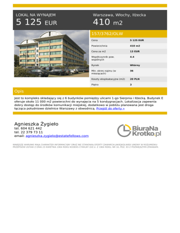 LOKAL NA WYNAJEM Warszawa, Włochy, Iłżecka 5 125 410 EUR m2 157/3762/OLW Cena 5 125 EUR Powierzchnia 410 m2 Cena za m2 13 EUR Współczynnik pow. wspólnych 4.4 Rynek Wtórny Min. okres najmu (w miesiącach) 36 Koszty eksploatacyjne (m2) 20 PLN Piętro 3 Opis Jest to kompleks składający się z 6 budynków pomiędzy ulicami 1-go Sierpnia i Iłżecką. Budynek E oferuje około 11 000 m2 powierzchni do wynajęcia na 5 kondygnacjach. Lokalizacja zapewnia dobry dostęp do środków komunikacji miejskiej, dodatkowo w pobliżu planowana jest droga łącząca południowe dzielnice Warszawy z obwodnicą. Przejdź do oferty » Agnieszka Żygieło tel. 604 621 442 tel. 22 379 73 11 email: [email protected] NINIEJSZE WARUNKI MAJĄ CHARAKTER INFORMACYJNY ORAZ NIE STANOWIĄ OFERTY ZAWARCIA JAKIEJKOLWIEK UMOWY W ROZUMIENIU PRZEPISÓW USTAW Z DNIA 23 KWIETNIA 1964 ROKU KODEKS CYWILNY (DZ.U. Z 1964 ROKU, NR 16, POZ. 93 Z PÓŹNIEJSZYMI ZMIANAMI. Powered by TCPDF (www.tcpdf.org)