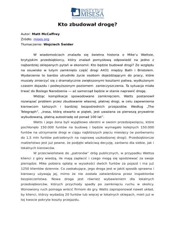 Kto zbudował drogę? Autor: Matt McCaffrey Źródło: mises.org Tłumaczenie: Wojciech Świder W wiadomościach znalazła się świetna historia o Mike’u Wattsie, brytyjskim przedsiębiorcy, który znalazł pomysłową odpowiedź na jedno z najbardziej oklepanych pytań w ekonomii: Kto będzie budował drogi? Ze względu na osuwisko w lutym zamknięto część drogi A431 między Bath i Bristolem. Wydarzenie to bardzo utrudniło życie osobom dojeżdżającym do pracy, które musiały zmierzyć się z dramatycznie zwiększonymi kosztami paliwa, wydłużonym czasem dojazdu i podwyższonym poziomem zanieczyszczenia. Ta sytuacja miała trwać do Bożego Narodzenia — aż samorząd będzie w stanie naprawić drogę. Widząc komplikacje spowodowane zamknięciem, Watts postanowił rozwiązać problem przez zbudowanie własnej, płatnej drogi, w celu zapewnienia kierowcom tańszych i bardziej bezpośrednich przejazdów. Według „The Telegraph”, „trasa, którą otwarto w piątek, jest uważana za pierwszą prywatnie wybudowaną, płatną autostradę od ponad 100 lat”. Watts i jego żona byli wyjątkowo obrotni w swoim przedsięwzięciu, które pochłonęło 150.000 funtów na budowę i będzie wymagało kolejnych 150.000 funtów na utrzymanie drogi w ciągu najbliższych pięciu miesięcy (w porównaniu do 1,5 mln funtów potrzebnych na naprawę uszkodzonej drogi). Przedsiębiorcze małżeństwo jest już pewne, że podjęło właściwą decyzję, zarówno dla siebie, jak i lokalnych kierowców. W przeciwieństwie do „patronów” dróg publicznych, w przypadku Wattsa klienci z góry wiedzą, ile mają zapłacić i czego mogą się spodziewać za swoje pieniądze. Mike pobiera opłatę w wysokości dwóch funtów za pojazd i ma już 1250 klientów dziennie. Co zaskakujące, jego droga jest w jakiś sposób sprawna i kierowcy używają jej, mimo że nie została zatwierdzona przez inspektorów bezpieczeństwa. Nowa droga jest również wybawieniem dla lokalnych przedsiębiorców, których przychody spadły po zamknięciu ruchu w okolicy. Wznowiony ruch pomaga wrócić firmom do gry. Watts zaproponował nawet układ, by klienci, którzy wydadzą 20 funtów lub więcej w lokalnych sklepach, mieli już w tej kwocie pokryte koszty przejazdu. Ze względu na łatwość i wydajność jazdy po tej prywatnej drodze, nie dziwi fakt, że Rada Bath i North East Somerset (odpowiedzialna za lokalne rządowe drogi) próbuje przekonać kierowców, by nie używali drogi Mike’a. Jednak można powiedzieć, że konsumenci „głosują kołami” i mimo to wybierają płatną drogę. To kolejna sytuacja, gdy rynek interweniuje, rozwiązując problemy tam, gdzie rząd okazuje się zawodny.