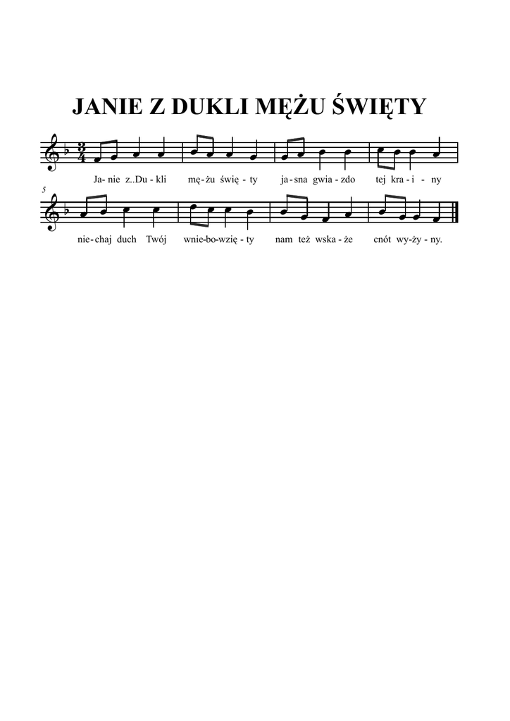 JANIE Z DUKLI MĘŻU ŚWIĘTY Ja- nie z..Du - kli 5 nie - chaj duch Twój mę - żu świę - ty wnie-bo-wzię - ty ja - sna gwia - zdo tej kra - i - ny nam też wska - że cnót wy-ży - ny.