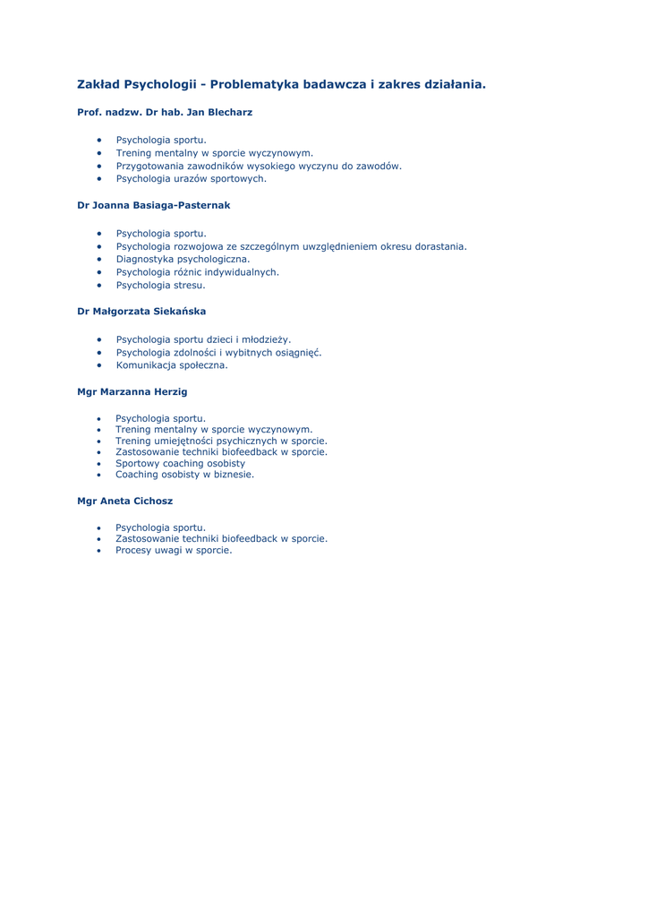 Zakład Psychologii - Problematyka badawcza i zakres działania. Prof. nadzw. Dr hab. Jan Blecharz • • • • Psychologia sportu. Trening mentalny w sporcie wyczynowym. Przygotowania zawodników wysokiego wyczynu do zawodów. Psychologia urazów sportowych. Dr Joanna Basiaga-Pasternak • • • • • Psychologia sportu. Psychologia rozwojowa ze szczególnym uwzględnieniem okresu dorastania. Diagnostyka psychologiczna. Psychologia różnic indywidualnych. Psychologia stresu. Dr Małgorzata Siekańska • • • Psychologia sportu dzieci i młodzieży. Psychologia zdolności i wybitnych osiągnięć. Komunikacja społeczna. Mgr Marzanna Herzig • • • • • • Psychologia sportu. Trening mentalny w sporcie wyczynowym. Trening umiejętności psychicznych w sporcie. Zastosowanie techniki biofeedback w sporcie. Sportowy coaching osobisty Coaching osobisty w biznesie. Mgr Aneta Cichosz • • • Psychologia sportu. Zastosowanie techniki biofeedback w sporcie. Procesy uwagi w sporcie.