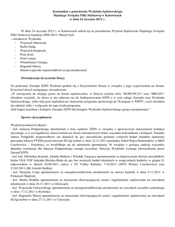 Komunikat z posiedzenia Wydziału Sędziowskiego Śląskiego Związku Piłki Siatkowej w Katowicach w dniu 24 stycznia 2012 r. W dniu 24 stycznia 2012 r. w Katowicach zebrał się na posiedzeniu Wydział Sędziowski Śląskiego Związku Piłki Siatkowej kadencji 2008-2012. Obecni byli: - członkowie Wydziału: - Wojciech Maroszek, - Rufin Duda, - Wojciech Kasprzyk, - Piotr Król, - Piotr Lenart, - Włodzimierz Ociepa, - Bogumił Sikora. Marek Lagierski usprawiedliwił swoją nieobecność. Oświadczenie Krzysztofa Duszy Na polecenie Zarządu ŚZPS Wydział spotkał się z Krzysztofem Duszą w związku z jego wypowiedzią na forum. Krzysztof złoŜył następujące oświadczenie: „W nawiązaniu do mojego postu na forum sędziowskim, w którym uŜyłem słów "KORUPCJA" oraz "BRUDY" chciałem wyjaśnić, Ŝe słowa te nie odnoszą się do funkcjonowania SZPS a w tym całego Zarządu oraz Wydziału Sędziowskiego, tylko mój post napisałem po obejrzeniu programu sportowego pt "Korupcja w PZPN", czyli chciałem się odnieść tylko i wyłącznie do tego tytułu programu. Jeśli kogoś uraziłem z kolegów Zarządu SZPS lub kolegów Wydziału Sędziowskiego gorąco przepraszam.” Sprawy dyscyplinarne Wydział postanowił ukarać: - kol. Janusza Podgórskiego skreśleniem z listy sędziów ŚZPS w związku z uporczywym naruszaniem kodeksu etycznego, a w szczególności okazywaniem na forum internetowym braku szacunku koleŜankom i kolegom. Ponadto Janusz Podgórski nieprawidłowo nie dopuścił do gry zawodniczki pomimo waŜnych badań (badania opatrzone pieczątką lekarza PTSM) przed meczem III ligi kobiet w dniu 22.12.2011 pomiędzy Sokół Rojca Radzionków a MKS Czechowice – Dziedzice, co kwalifikuje się do udzielenia upomnienia. W związku z groŜącą sankcją wszystkie aktualne nominacje dla Janusza Podgórskiego zostają wycofane. Decyzja Wydziału wymaga zatwierdzenia przez Zarząd ŚZPS; - kol. kol. Michalinę Konsek, Jakuba Malarza i Witolda Targosza upomnieniami za dopuszczenie dwóch zawodników klubu UKS TOP Jedynka Bielsko-Biała do gry bez waŜnych badań lekarskich w rozgrywkach kadetów w grupie II, odpowiednio w dniach 26.09.2011 (mecz z TS Volley Rybnik), 7.10.2011 (MTS Winner Czechowice) oraz 23.09.2011 (SK Górnik Radlin); - kol. Henryka Czaja upomnieniem za nieusprawiedliwioną nieobecność na meczu kadetek w dniu 9.11.2011 w Piekarach Śląskich; - kol. Marka Drabika upomnieniem za naruszenie obowiązujących zasad i regulaminów sędziowania na zawodach młodziczek w dniu 26.11.2011 w Gliwicach; - kol. Wojciecha Ostrowskiego upomnieniem za nieusprawiedliwioną nieobecność na zawodach szczebla centralnego w dniu 17.12.2011 w Rybniku; - kol. Bogumiła Sikorę upomnieniem za naruszenie obowiązujących zasad i regulaminów sędziowania na zawodach III ligi kobiet w dniu 27.11.2011 w Cieszynie. Forum internetowe W związku z tym, Ŝe sędziowskie forum internetowe nie spełnia celów, dla których zostało powołane, a staje się areną animozji między sędziami, Wydział postanowił zawiesić działalność forum do czasu ukonstytuowania się Wydziału kolejnej kadencji. Wyjątkiem jest dział poświęcony zamianom meczów, który winien pozostać aktywny. Moderatorzy forum proszeni są o zablokowanie pozostałych działów i usuwanie jakichkolwiek postów niezwiązanych ze zmianami w obsadach. W dzisiejszych czasach załoŜenie prywatnego forum przez któregoś z sędziów lub ich grupę albo komunikacja z sędziami w inny sposób są bardzo proste i zawieszenie forum nie uniemoŜliwia merytorycznej dyskusji. Nie ma natomiast uzasadnienia, by wypowiedzi, które w duŜej części polegają na jątrzeniu, wykazywaniu braku wzajemnego szacunku albo zaufania, miały pojawiać się na oficjalnym forum sędziów ŚZPS, firmowanym przez Wydział. Kłopoty zdrowotne Wydział postanowił, Ŝe w przypadku wystąpienia powtarzających się kłopotów zdrowotnych powodujących przerwanie sędziowania zawodów, sędzia nie otrzyma kolejnych nominacji do czasu przedstawienia Wydziałowi zaświadczenia lekarza sportowego o braku przeciwwskazań do pełnienia funkcji sędziego sportowego (przepisy dotyczące lekarza analogicznie do przepisów ŚZPS dla zawodników). Kurs sędziowski Wydział zwraca się do Zarządu ŚZPS o wyraŜenie zgody na organizację podstawowego kursu sędziowskiego. Zajęcia w ramach kursu odbędą się równolegle w Jastrzębiu Zdroju i Częstochowie. Początek kursu przewidziano na 19 maja, kurs ma objąć 8 dni zajęć. Koszt udziału w kursie to 400 zł. Wydział proponuje przyznanie 20 licencji sędziowskich. Za organizację kursu odpowiadają Wojciech Maroszek (Jastrzębie Zdrój) oraz Wojciech Kasprzyk (Częstochowa), za stronę merytoryczną kursu odpowiada Piotr Król. Zebranie sprawozdawczo-wyborcze Ogólne zasady wyborów władz sędziowskich ŚZPS określa § 2 Regulaminu Wydziału Sędziowskiego ŚZPS. Wydział składa do Zarządu ŚZPS wniosek o zwołanie Walnego Zebrania Sprawozdawczo-Wyborczego na dzień 20 kwietnia br. (piątek) w Katowicach na godzinę 17.30 (II termin w pół godziny po I) i przedstawia projekt Regulaminu Walnego Zebrania Sprawozdawczo-Wyborczego, którego treść stanowi załącznik nr 1 do niniejszego komunikatu. Proponowany program zebrania: 1. Otwarcie Zebrania 2. Wybór Przewodniczącego Zebrania, Zastępcy oraz Sekretarza 3. Przedstawienie i przyjęcie porządku obrad 4. Wystąpienie Prezesa ŚZPS i zaproszonych gości 5. Wręczenie pamiątek jubileuszowych za lata 2011 i 2012 6. Wybór Komisji Mandatowo-Skrutacyjnej 7. Wybór Komisji Uchwał i Wniosków 8. Stwierdzenie prawomocności Zebrania 9. Sprawozdanie Wydziału Sędziowskiego kadencji 2008 - 2012 10. Dyskusja 11. Wybory Przewodniczącego Wydziału Sędziowskiego 12. Podjęcie uchwał 13. Zamknięcie Zebrania Odznaki honorowe, tytuły honorowe Wydział postanowił złoŜyć wniosek do Zarządu ŚZPS o wystąpienie do PZPS o nadanie Srebrnej Odznaki Hono