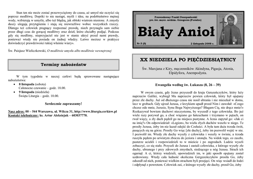 Stan ten nie może zostać przezwyciężony do czasu, aż umysł nie oczyści się poprzez modlitwę. Dopóki to nie nastąpi, myśli i idee, na podobieństwo mętnej wody, wzbierają w umyśle, albo też błądzą, jak obłoki wiatrem niesione. A zmysły duszy ulegają przytępieniu i stają się niewrażliwe wobec wszystkich rzeczy. Dlatego też człowiek pragnący rozpoznać prawdę, niech przynagla sam siebie przez długi czas do gorącej modlitwy oraz dzieł, które chciałby podjąć. Podczas gdy się modlimy, nieprzyjaciel nie jest w stanie ukryć przed nami prawdy, ponieważ wtedy nie posiada on żadnej władzy. Łatwo możesz w praktyce doświadczyć prawdziwości takiej właśnie wiary». Św. Paisjusz Wieliczkowski, O modlitwie umysłu albo modlitwie wewnętrznej Terminy nabożeństw W tym tygodniu w naszej cerkwi będą sprawowane następujące nabożeństwa: · 8 listopada (sobota) Całonocne czuwanie – godz. 18.00. · 9 listopada (niedziela) Święta Liturgia – godz. 10.00. Serdecznie zapraszamy! Nasz adres: 00 – 544 Warszawa, ul. Wilcza 31, http://www.liturgia.cerkiew.pl Kontakt telefoniczny: ks. Artur Aleksiejuk – 603037770. XX NIEDZIELA PO PIĘĆDZIESIĄTNICY Św. Marcjana z Kiry, męczenników Akindyna, Pigasja, Atonia, Elpidyfora, Anempodysta. Ewangelia według św. Łukasza (8, 26 – 39) W owym czasie, gdy Jezus przyszedł do kraju Gerazeńczyków, który leży naprzeciw Galilei, wybiegł Mu naprzeciw pewien człowiek, który był opętany przez złe duchy. Już od dłuższego czasu nie nosił ubrania i nie mieszkał w domu, lecz w grobach. Gdy ujrzał Jezusa, z krzykiem upadł przed Nim i zawołał: «Czego chcesz ode mnie, Jezusie, Synu Boga Najwyższego? Błagam Cię, nie dręcz mnie!» Rozkazywał bowiem duchowi nieczystemu, by wyszedł z tego człowieka. Bo już wiele razy porywał go, a choć wiązano go łańcuchami i trzymano w pętach, on rwał więzy, a zły duch pędził go na miejsca pustynne. A Jezus zapytał go: «Jak ci na imię?» On odpowiedział: «Legion», bo wielu złych duchów weszło w niego. Te prosiły Jezusa, żeby im nie kazał odejść do Czeluści. A była tam duża trzoda świń, pasących się na górze. Prosiły Go więc [złe duchy], żeby im pozwolił wejść w nie. I pozwolił im. Wtedy złe duchy wyszły z człowieka i weszły w świnie, a trzoda ruszyła pędem po urwistym zboczu do jeziora i utonęła. Na widok tego, co zaszło, pasterze uciekli i rozpowiedzieli to w mieście i po zagrodach. Ludzie wyszli zobaczyć, co się stało. Przyszli do Jezusa i zastali człowieka, z którego wyszły złe duchy, ubranego i przy zdrowych zmysłach, siedzącego u nóg Jezusa. Strach ich ogarnął. A ci, którzy wiedzieli, opowiedzieli im, w jaki sposób opętany został uzdrowiony. Wtedy cała ludność okoliczna Gergezeńczyków prosiła Go, żeby odszedł od nich, ponieważ wielkim strachem byli przejęci. On więc wsiadł do łodzi i odpłynął z powrotem. Człowiek zaś, z którego wyszły złe duchy, prosił Go, żeby mógł zostać przy Nim. Lecz Jezus odprawił go słowami: «Wracaj do domu i opowiadaj wszystko, co Bóg uczynił z tobą». Poszedł więc i głosił po całym mieście wszystko, co Jezus mu uczynił. List św. Apostoła Pawła do Galatów (1, 11 – 19) Bracia! Oświadczam wam, że głoszona przeze mnie Ewangelia nie jest wymysłem ludzkim. Nie otrzymałem jej bowiem ani nie nauczyłem się od jakiegoś człowieka, lecz objawił mi ją Jezus Chrystus. Słyszeliście przecież o moim postępowaniu ongiś, gdy jeszcze wyznawałem judaizm, jak z niezwykłą gorliwością zwalczałem Kościół Boży i usiłowałem go zniszczyć, jak w żarliwości o judaizm przewyższałem wielu moich rówieśników z mego narodu, jak byłem szczególnie wielkim zapaleńcem w zachowywaniu tradycji moich przodków. Gdy jednak spodobało się Temu, który wybrał mnie jeszcze w łonie matki mojej i powołał łaską swoją, aby objawić Syna swego we mnie, bym Ewangelię o Nim głosił poganom, natychmiast, nie radząc się ciała i krwi ani nie udając się do Jerozolimy, do tych, którzy apostołami stali się pierwej niż ja, skierowałem się do Arabii, a później znowu wróciłem do Damaszku. Następnie, trzy lata później, udałem się do Jerozolimy dla zapoznania się z Kefasem, zatrzymując się u niego [tylko] piętnaście dni. Spośród zaś innych, którzy należą do grona Apostołów, widziałem jedynie Jakuba, brata Pańskiego. Rozważania niedzielne Widzimy człowieka podbiegającego do Chrystusa, człowieka zmagającego się ze złym duchem. Ów człowiek podbiega, ale zachowuje się tak, jakby chciał uciec. Oto bowiem przychodzi Ten, w obliczu Którego ujawnia się to co prawdziwe. On jest weryfikatorem, przed nim nie ukryje się żadne zło, nawet te najbardziej zakamuflowane, ukryte na dnie serca. Wobec Prawdy, którą jest Słowo Boże, Boski Logos – Jezus Chrystus wszelka nieprawda i fałsz staje się jawne. Pytanie «Czego chcesz ode mnie?» to jakby ostatni oddech fałszu, zniewolenia stającego w obronie zagarniętego i okupowanego przez siebie terytorium duszy człowieka. Można powiedzieć, że jest to głos rozpaczy przed zdemaskowaniem, rozpaczliwa obrona i próba ratowania królestwa zła wspierającego się na kłamstwie, iluzji, manipulacji i zniewoleniu. W pewnym sensie jest to błaganie o litość przez tego, który tej litości nigdy nie okazywał. I Chrystus okazuje mu litość, nie odsyła ducha zła do otchłani, lecz pozwala mu wstąpić w stado świń. A Jezus zapytał go: «Jak ci na imię?» On odpowiedział: «Legion», bo wielu złych duchów weszło w niego. Wydaje się, że czasami my moglibyśmy odpowiedzieć Jezusowi w ten sam sposób: «Nazywam się Legion», bo jest w nas wiele złych i grzesznych myśli, zawiści, półprawd, kłamstwa, oszczerstw itd. Boimy się ich, ale potrzebujemy uzdrowienia oraz odnowienia priorytetów. «Czego chcesz ode mnie, Jezusie, Synu Boga Najwyżs