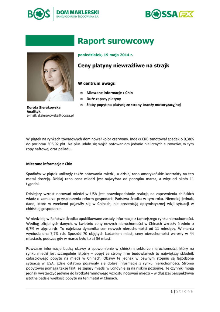 Raport surowcowy poniedziałek, 19 maja 2014 r. Ceny platyny niewrażliwe na strajk W centrum uwagi: Dorota Sierakowska Analityk e-mail: [email protected] • • • Mieszane informacje z Chin Duże zapasy platyny Słaby popyt na platynę ze strony branży motoryzacyjnej W piątek na rynkach towarowych dominował kolor czerwony. Indeks CRB zanotował spadek o 0,38% do poziomu 305,92 pkt. Na plus udało się wyjść notowaniom jedynie nielicznych surowców, w tym ropy naftowej oraz palladu. Mieszane informacje z Chin Spadków w piątek uniknęły także notowania miedzi, a dzisiaj rano amerykańskie kontrakty na ten metal drożeją. Dzisiaj rano cena miedzi jest najwyższa od początku marca, a więc od około 11 tygodni. Dzisiejszy wzrost notowań miedzi w USA jest prawdopodobnie reakcją na zapewnienia chińskich władz o zamiarze przyspieszenia reform gospodarki Państwa Środka w tym roku. Niemniej jednak, dane, które w weekend pojawiły się w Chinach, nie prezentują optymistycznej wizji sytuacji w chińskiej gospodarce. W niedzielę w Państwie Środka opublikowane zostały informacje z tamtejszego rynku nieruchomości. Według oficjalnych danych, w kwietniu ceny nowych nieruchomości w Chinach wzrosły średnio o 6,7% w ujęciu rdr. To najniższa dynamika cen nowych nieruchomości od 11 miesięcy. W marcu wyniosła ona 7,7% rdr. Spośród 70 objętych badaniem miast, ceny nieruchomości wzrosły w 44 miastach, podczas gdy w marcu było to aż 56 miast. Powyższe informacje budzą obawy o spowolnienie w chińskim sektorze nieruchomości, który na rynku miedzi jest szczególnie istotny – popyt ze strony firm budowlanych to największy składnik całościowego popytu na miedź w Chinach. Obawy te jednak w pewnym stopniu są łagodzone sytuacją w USA, gdzie ostatnio pojawiały się dobre informacje z rynku nieruchomości. Stronie popytowej pomaga także fakt, że zapasy miedzi w Londynie są na niskim poziomie. Te czynniki mogą jednak wystarczyć jedynie do krótkoterminowego wzrostu notowań miedzi – w dłuższej perspektywie istotna będzie wielkość popytu na ten metal w Chinach. 1|Strona Wykres 1. Notowania miedzi w USA – dane dzienne. Duże zapasy platyny Dzisiaj rano strona popytowa radzi sobie dobrze także na rynkach platyny i palladu. Nie jest to dziwne, biorąc pod uwagę sytuację w RPA, a dokładniej – trwający już od 23 stycznia strajk górników. Wpłynął on istotnie na globalną produkcję platyny, której RPA jest największym producentem (ok. 40% światowego wydobycia). Biorąc pod uwagę fakt, że sytuacja w RPA już przez dłuższy czas mocno ogranicza produkcję platyny, można byłoby jednak dojść do wniosku, że wykres tego surowca wcale istotnie nie odzwierciedlił napiętej sytuacji w kopalniach platyny w tym kraju. Od czasu wybuchu strajku ceny platyny fluktuowały w trendzie bocznym w rejonie 1390-1480 USD za uncję i ostatecznie wzrost cen tego surowca jest – przynajmniej na razie – symboliczny. Dlaczego notowania platyny, pomimo strajku, nie poszybowały w górę? W pewnym stopniu może być to rezultat utrzymywania sporych zapasów tego metalu przez spółki wydobywcze funkcjonujące w RPA. Dzięki temu, Anglo Platinum, Lonmin czy też Impala Platinum mogą wciąż wywiązywać się ze swoich zobowiązań dostaw platyny, pomimo trwającego w tych spółkach strajku. Przedsiębiorstwa te są zmuszone uwzględniać uwarunkowania polityczne w swoich działaniach na terenie RPA – kraju, gdzie wielokrotnie dochodziło już do rozległych strajków i przerw w wydobyciu metali. 2|Strona Słaby popyt na platynę ze strony branży motoryzacyjnej Jednak brak istotnego wzrostu notowań platyny może także sugerować relatywnie słaby popyt na ten kruszec. Platyna jest wykorzystywana przede wszystkim w branży motoryzacyjnej, w produkcji katalizatorów samochodowych. Popyt jest generowany przede wszystkim przez producentów samochodów z Europy, gdzie popularne są silniki typu diesel (w silnikach benzynowych platynę można zastąpić tańszym palladem). Przez 6 ostatnich lat, liczba zarejestrowanych nowych samochodów w Europie systematycznie spadała, dlatego popyt na platynę z tej branży był ograniczony. Jak pokazały najnowsze dane ACEA (Europejskie Stowarzyszenie Producentów Samochodów), w pierwszych czterech miesiącach tego roku liczba rejestracji samochodów w UE wzrosła o 6,3% rdr, więc ten rok może przynieść odwrócenie niekorzystnego trendu. Tym samym, jest szansa na wzrost cen platyny, zwłaszcza jeśli trudna sytuacja w RPA będzie się przedłużać, a popyt ze strony producentów samochodów będzie systematycznie wzrastał. Warto jednak podkreślić, że taki scenariusz prawdopodobnie nie zrealizuje się od razu i na wyraźną zwyżkę cen tego metalu trzeba będzie poczekać. Wykres 2. Notowania platyny – dane dzienne. ---Prezentowany raport został przygotowany w Wydziale Doradztwa i Analiz Rynkowych Domu Maklerskiego Banku Ochrony Środowiska S.A. z siedzibą w Warszawie tylko i wyłącznie w celach informacyjnych i nie stanowi analizy inwestycyjnej, ani analizy finansowej ani rekomendacji w rozumieniu przepisów Rozporządzenia Ministra Finansów z dnia 19 października 2005r. (Dz.U. 2005, poz. 206 nr 1715) oraz Ustawy z dnia 29 lipca 2005r. (Dz.U. 2005, Nr 183, poz. 1538 z późn. zm.). Przedstawiony raport jest wyłącznie wyrazem wiedzy i poglądów autora według stanu na dzień sporządzenia i w żadnym wypadku nie może być podstawą działań inwestycyjnych Klienta. Przy sporządzaniu raportu DM BOŚ SA działał z należytą starannością oraz rzetelnością. DM BOŚ SA i jego pracownicy nie ponoszą jednak odpowiedzialności za działania lub zaniechania Klienta podjęte na podstawie niniejszego raportu ani za szkody poniesione w wyniku tych decyzji inwestycyjnych. Niniejszy raport adresowany jest do nieograniczonego kręgu odbiorców. Został sporządzony na potrzeby klientów DM BOŚ S.A. oraz in