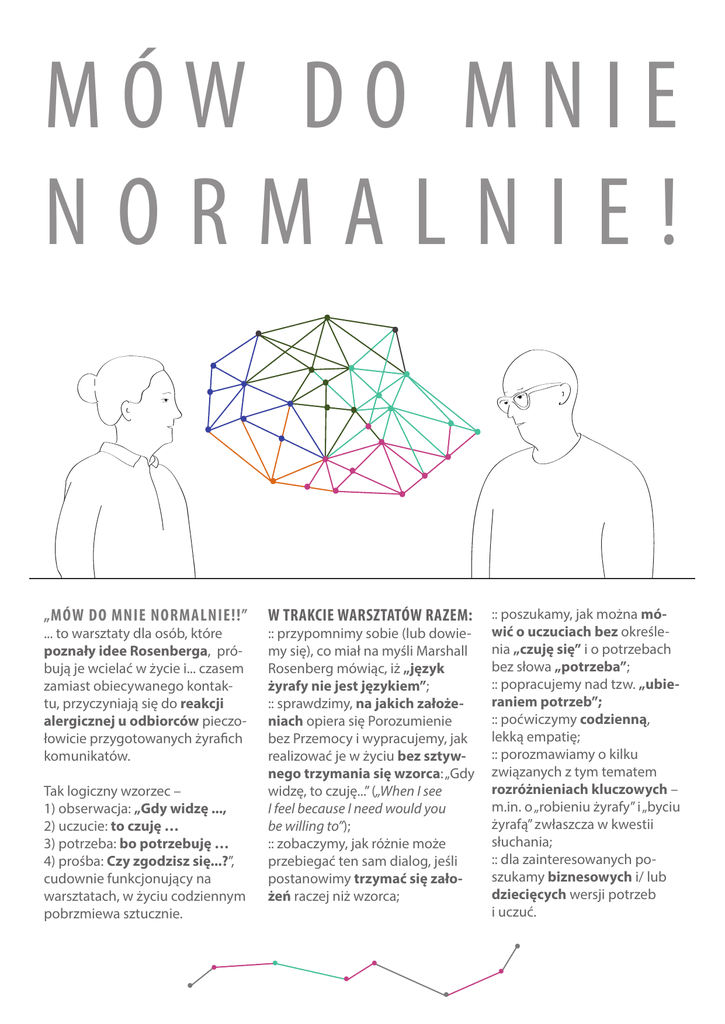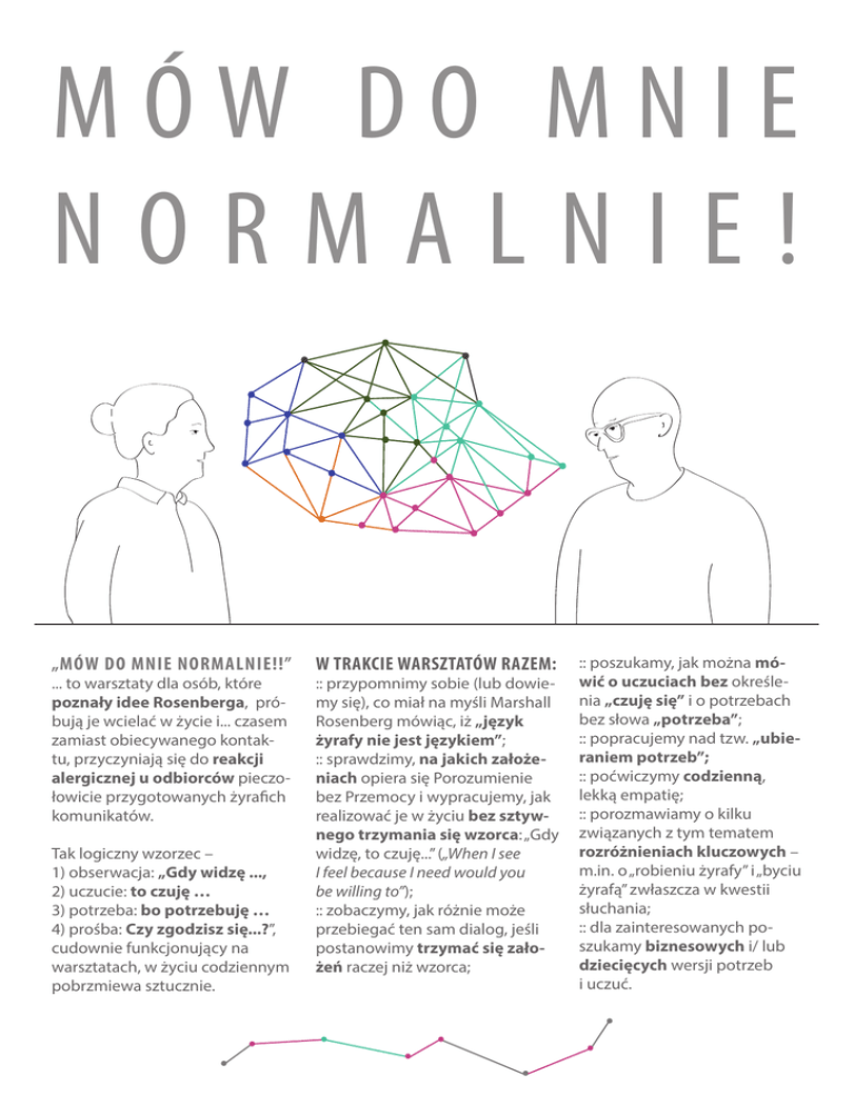 MÓW DO MNIE NORMALNIE! „MÓW DO MNIE NORMALNIE!!” ... to warsztaty dla osób, które poznały idee Rosenberga, próbują je wcielać w życie i... czasem zamiast obiecywanego kontaktu, przyczyniają się do reakcji alergicznej u odbiorców pieczołowicie przygotowanych żyrafich komunikatów. Tak logiczny wzorzec – 1) obserwacja: „Gdy widzę ..., 2) uczucie: to czuję … 3) potrzeba: bo potrzebuję … 4) prośba: Czy zgodzisz się...?”, cudownie funkcjonujący na warsztatach, w życiu codziennym pobrzmiewa sztucznie. W TRAKCIE WARSZTATÓW RAZEM: :: przypomnimy sobie (lub dowiemy się), co miał na myśli Marshall Rosenberg mówiąc, iż „język żyrafy nie jest językiem”; :: sprawdzimy, na jakich założeniach opiera się Porozumienie bez Przemocy i wypracujemy, jak realizować je w życiu bez sztywnego trzymania się wzorca: „Gdy widzę, to czuję...” („When I see I feel because I need would you be willing to”); :: zobaczymy, jak różnie może przebiegać ten sam dialog, jeśli postanowimy trzymać się założeń raczej niż wzorca; . . . . :: poszukamy, jak można mówić o uczuciach bez określenia „czuję się” i o potrzebach bez słowa „potrzeba”; :: popracujemy nad tzw. „ubieraniem potrzeb”; :: poćwiczymy codzienną, lekką empatię; :: porozmawiamy o kilku związanych z tym tematem rozróżnieniach kluczowych – m.in. o „robieniu żyrafy” i „byciu żyrafą” zwłaszcza w kwestii słuchania; :: dla zainteresowanych poszukamy biznesowych i/ lub dziecięcych wersji potrzeb i uczuć. . . . . AGNIESZKA PIETLICKA PROWADZĄCA Przekładam idee Porozumienia na życie codzienne od 2002 roku – z większym lub mniejszym sukcesem, co łagodnie daje mi okazję do ćwiczenia pokory. Za każdym razem warto. Odkrywałam Porozumienie w Niemczech, Szwajcarii, Francji, Polsce i USA, m.in. na warsztatach z Marshallem Rosenbergiem. Dzielę się tą filozofią z różnymi grupami zawodowymi. Prywatnie – partnerka, mama dwóch chłopców. Jestem certyfikowaną trenerką PbP. Warsztat „Mów do mnie normalnie” stworzyłam wierząc, że życie jest za krótkie, żeby się uczyć tylko na własnych błędach. Przechodzenie przez różne etapy Porozumienia było wyzwaniem nie tyle dla nie, co dla mojego otoczenia… Jej, ale się nasłuchali… LOGISTYKA Wymagane jest wcześniejsze uczestnictwo w przynajmniej dwóch dniach warsztatów z Porozumienia bez Przemocy. Kiedy? 19 i 20 marca (sobota i niedziela), odpowiednio w godzinach 10:00-19:00 i 9:00-16:00 Gdzie? Poznań, Jeżyce, ul. Kochanowskiego 4; Studio Jogi Yam Koszt: 430 zł, 400 zł/ osobę – para, rodzina osoby z tej samej instytucji oraz early bird (przy wpłaceniu zaliczki do 01.02.2016 r.) 360 zł/ osobę – early bird plus para/ rodzina/ ten sam pracodawca, 300 zł – osoby powyżej 60 i poniżej 24 r. życia Bezzwrotna zaliczka: 50 zł w momencie zapisania się na konto 67 1240 6609 1111 0010 6139 6516 (Agnieszka Pietlicka Dialogue Unlimited, Pekao S.A.) z dopiskiem „Mów do mnie normalnie”. Informacje merytoryczne: [email protected], tel. 503 498 330 Zapisy: [email protected] Dialogue Unlimited przy współpracy z Fundacją Świadomego Rozwoju wydaje książki z Porozumienia bez Przemocy. Polecam z serii „Porozumiewajmy się”: Komunikacja konstruktywna w biznesie. Przez rozmowę do efektywnego zarządzania, Gabriele Lindemann, Vera Hein Dorastanie w zaufaniu, Justine Mol Żyrafa i szakal w nas, Justine Mol Sen żyrafy. Porozumienie bez przemocy z dziećmi. Scenariusze dla przedszkoli, Frank i Gaudi Gaschler W przygotowaniu: Edukacja wzbogacająca życie, Marshall Rosenberg (wznowienie), wersja polska książki Miki Kashtan: Spinning threads of radical aliveness; transcending the legacy of separation in our individual lives.
