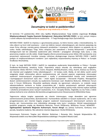 Zacumujmy w Łodzi w październiku! Największe targi ekobranży w Polsce W terminie 7-9 października 2016 roku Spółka Międzynarodowe Targi Łódzkie organizuje IX edycję Międzynarodowych Targów Żywności Ekologicznej i Naturalnej NATURA FOOD ( w tym samym miejscu i czasie odbywa się komplementarne wydarzenia - V Targi Ekologicznego Stylu Życia beECO). NATURA FOOD i beECO to imprezy o ugruntowanej pozycji, na które branża czeka z niecierpliwością. Co roku obecni są liczni stali wystawcy – znani już dobrze naszym odwiedzającym, jak również pojawiają się nowe firmy oferując szeroką gamę ciekawych produktów i rozwiązań, które dopiero co pojawiły się na rynku. Każdy odwiedzający Targi, który związany jest zawodowo z branżą biożywności i produktami ekologicznymi lub też odwiedza wydarzenie jako miłośnik i propagator zdrowego stylu życia, z całą pewnością znajdzie coś dla siebie. Dzięki bogatej ofercie prezentowanej przez blisko 350 wystawców oraz prezentacji najnowszych trendów rozwoju rolnictwa ekologicznego impreza NATURA FOOD i beECO podąża za międzynarodowymi trendami i jest najbardziej rozpoznawalną imprezą w Polsce i w Europie Środkowo-Wschodniej. O tym, że targi NATURA FOOD i beECO to największe wydarzenie bioproduktów w Polsce i Europie Środkowo-Wschodniej świadczą liczby. Poprzednia edycja okazała się rekordową pod względem wystawców: blisko 350 firm z Polski, Czech, Hiszpanii, Wielkiej Brytanii, Litwy, Austrii, Szwecji czy Ukrainy, ale również pod względem liczby odwiedzających – 12 tysięcy osób. Myślę, że tak dobry wynik został osiągnięty dzięki różnorodnej ofercie wystawienniczej, jak również poprzez organizację interesujący wydarzeń towarzyszących przygotowanych z myślą o przedstawicielach branży oraz świadomych i wymagających koneserach stylu eko – mówi Agata Szczepaniak – Kierownik Projektu. Niewątpliwie dużym zainteresowaniem cieszyły się wydarzenia branżowe czyli: Akademia Biokurier, BIObiznes Forum oraz II Forum EKObranży. Wszystkie spotkania okazały się ogromnym sukcesem, co znalazło swoje odzwierciedlenie zarówno w liczbie uczestników, jak i bardzo pozytywnych opiniach dotyczących wysokiego poziomu merytorycznego tych inicjatyw. Na tak pochlebną opinię miały również wpływ wykłady i szkolenia prowadzone przez naszych wystawców, m.in.: Szczyptę Świata, Vegetalię czy Joy Food, a także pokazy kulinarne oraz szkolenia dla basistów przygotowane przez Stowarzyszenie Miłośników Kawy. Tegoroczna edycja targów zapowiada się równie interesująco, czego dowodem jest ogromne zainteresowanie producentów, dystrybutorów i hurtowników udziałem w naszym wydarzeniu. Jak co roku przygotowywany jest również bogaty program wydarzeń towarzyszących skierowanych zarówno do branży, jak i konsumentów oraz miłośników zdrowego stylu życia i smakoszy. Wśród najważniejszych punktów programu znajdą się Akademia Biokurier, Forum EKObranży, BIObiznes Forum, NOWOŚCI Ogólnopolskie Spotkanie Blogerów Kulinarnych, Forum Alergii czy pokazy kulinarne, konkursy oraz porady, bezpłatne badania. Nie zabraknie również degustacji i Strefy EKOdziecka. Honorowym Patronem Targów jest Minister Rolnictwa i Rozwoju Wsi, Związek Województw RP, Wojewoda Łódzki oraz Marszałek Województwa Łódzkiego i Prezydent Miasta Łodzi. Organizatorem imprezy są Międzynarodowe Targi Łódzkie Spółka Targowa. Kontakt prasowy: Agata Szczepaniak Kierownik Projektu Tel. 603 172 934 Email: [email protected] Godziny zwiedzania 7 października - 10:00 - 18:00 8 października - 10:00 - 18:00 9 października - 10:00 - 17:00 Zachęcamy do zakupu biletów w systemie on-line. Więcej informacji znajduje się na stronie www.NATURAFOOD.pl oraz www.beeco.com.pl