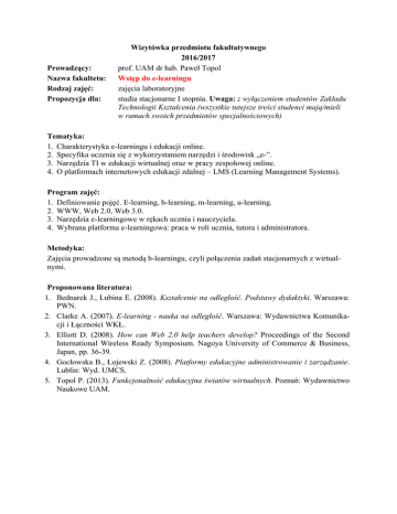Prowadzący: Nazwa fakultetu: Rodzaj zajęć: Propozycja dla: Wizytówka przedmiotu fakultatywnego 2016/2017 prof. UAM dr hab. Paweł Topol Wstęp do e-learningu zajęcia laboratoryjne studia stacjonarne I stopnia. Uwaga: z wyłączeniem studentów Zakładu Technologii Kształcenia (wszystkie tutejsze treści studenci mają/mieli w ramach swoich przedmiotów specjalnościowych) Tematyka: 1. Charakterystyka e-learningu i edukacji online. 2. Specyfika uczenia się z wykorzystaniem narzędzi i środowisk „e-”. 3. Narzędzia TI w edukacji wirtualnej oraz w pracy zespołowej online. 4. O platformach internetowych edukacji zdalnej – LMS (Learning Management Systems). Program zajęć: 1. Definiowanie pojęć. E-learning, b-learning, m-learning, u-learning. 2. WWW, Web 2.0, Web 3.0. 3. Narzędzia e-learningowe w rękach ucznia i nauczyciela. 4. Wybrana platforma e-learningowa: praca w roli ucznia, tutora i administratora. Metodyka: Zajęcia prowadzone są metodą b-learningu, czyli połączenia zadań stacjonarnych z wirtualnymi. Proponowana literatura: 1. Bednarek J., Lubina E. (2008). Kształcenie na odległość. Podstawy dydaktyki. Warszawa: PWN. 2. Clarke A. (2007). E-learning - nauka na odległość. Warszawa: Wydawnictwa Komunikacji i Łączności WKŁ. 3. Elliott D. (2008). How can Web 2.0 help teachers develop? Proceedings of the Second International Wireless Ready Symposium. Nagoya University of Commerce & Business, Japan, pp. 36-39. 4. Gocłowska B., Łojewski Z. (2008). Platformy edukacyjne administrowanie i zarządzanie. Lublin: Wyd. UMCS. 5. Topol P. (2013). Funkcjonalność edukacyjna światów wirtualnych. Poznań: Wydawnictwo Naukowe UAM.