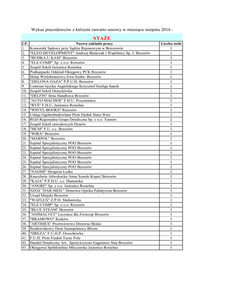 Wykaz pracodawców z którymi zawarto umowy w miesiącu sierpniu 2016 : STAŻE LP. 1. 2. 3. 4. 5. 6. 7. 8. 9. 10. 11. 12. 13. 14. 15. 16. 17. 18. 19. 20. 21. 22. 23. 24. 25. 26. 27. 28. 29. 30. 31. 32. 33. 34. 35. 36. 37. 38. 39. 40. 41. 42. 43. Nazwa zakładu pracy Komornik Sądowy przy Sądzie Rejonowym w Brzozowie "ELEO-DEVELOPMENT" Andrzej Bieńczak i Wspólnicy Sp. J. Brzozów "BUDKA U KASI" Brzozów "ELE-COMP" Sp. z o.o. Rzeszów Zespół Szkół Jasienica Rosielna Podkarpacki Oddział Okręgowy PCK Rzeszów Sklep Wielobranżowy Ewa Szuba Brzozów "ZIELONA OAZA" P.P.U.H. Brzozów Centrum Języka Angielskiego Krzysztof Szeliga Sanok Zespół Szkół Orzechówka "DELFIN" firna Handlowa Brzozów "AUTO-MACHER" F.H.U. Przysietnica "RYŚ" F.H.U. Jasienica Rosielna "WINYL-BOOKS" Rzeszów Usługi Ogólnobudowlane Piotr Dydek Stara Wieś RGD Regionalna Grupa Detaliczna Sp. z o.o. Tarnów Zespół Szkół zawodowych Dynów "MCM" F.U. s.c. Brzozów "WIRA" Brzozów "MARPOL" Brzozów Szpital Specjalistyczny POO Brzozów Szpital Specjalistyczny POO Brzozów Szpital Specjalistyczny POO Brzozów Szpital Specjalistyczny POO Brzozów Szpital Specjalistyczny POO Brzozów Szpital Specjalistyczny POO Brzozów "NAOMI" Drogeria Lesko Kancelaria Adwokacka Anna Szarek-Kopeć Brzozów "KAJA" P.P.H.U. s.c. Humniska "ANGRE" Sp. z o.o. Jasienica Rosielna NZOZ "DAR-MED." Domowa Opieka Paliatywna Brzozów Urząd Miejski Brzozów "WAFLEX" Z.P.H. Malinówka "ELE-COMP" Sp. z o.o. Rzeszów "BLUE STEAM" Brzozów "ANIMALVET" Lecznica dla Zwierząt Brzozów "BRAMOWO" Kraków "ARTIMEX" Przetwórsrwo Drzewne Besko Środowiskowy Dom Samopomocy Blizne "DREZA" F.U.H.P. Orzechówka F.U.H. Piotr Fiedeń Turze Pole Handel Detaliczny Art.. Spożywczymi Eugeniusz Stój Brzozów Okręgowa Spółdzielnia Mleczarska Jasienica Rosielna Liczba osób 1 1 1 1 1 1 1 1 1 2 1 1 1 1 1 2 1 1 1 1 1 1 1 1 1 2 1 1 1 1 1 1 1 1 1 1 1 1 1 1 1 1 1 PRACE INTERWENCYJNE LP. 1. 2. 3. 4. 5. 6. 7. 8. 9. 10. 11. 12. 13. 14. Nazwa zakładu pracy Zespół Szkół Ogólnokształcących Brzozów MICROTEC Sp. z o.o. Brzozów ASM STARTER Rzeszów Firma Handlowa DOMEX Lesko CENTURION Sp. z o.o. Sanok N ZOZ DAR-MED. Brzozów Z-d Rem.-Bud. LATER Sp. z o.o. Rymanów Szpital Specjalistyczny w Brzozowie Usługi Transp. ADJUKOP-TRANS Niebocko Zespół Szkół Górki Powiat. Centrum Integracji Społecznej Orzechówka KRO-REM Krosno Budka U Kasi Brzozów Salon Fryzjerski LA BELLA Rzeszów Liczba osób 1 1 1 1 1 1 1 1 1 1 1 1 1 1 REFUNDACJA KOSZTÓW WYPOSAŻENIA LUB DOPOSAŻENIA STANOWISK PRACY DLA SKIEROWANEGO BEZROBOTNEGO LP. 1. 2. 3. 4. Nazwa zakładu pracy Usługi Budowlano - Instalacyjne "DUD - BUD" OFF ROAD MOTOCYKLE Marek Matus CYBERMAX s. c. Mirosław Brzana, Tomasz Brzana, Zbigniew Brzana WRW s. c. Jucha, Urbanek, Blicharczyk Liczba osób 1 1 1 18