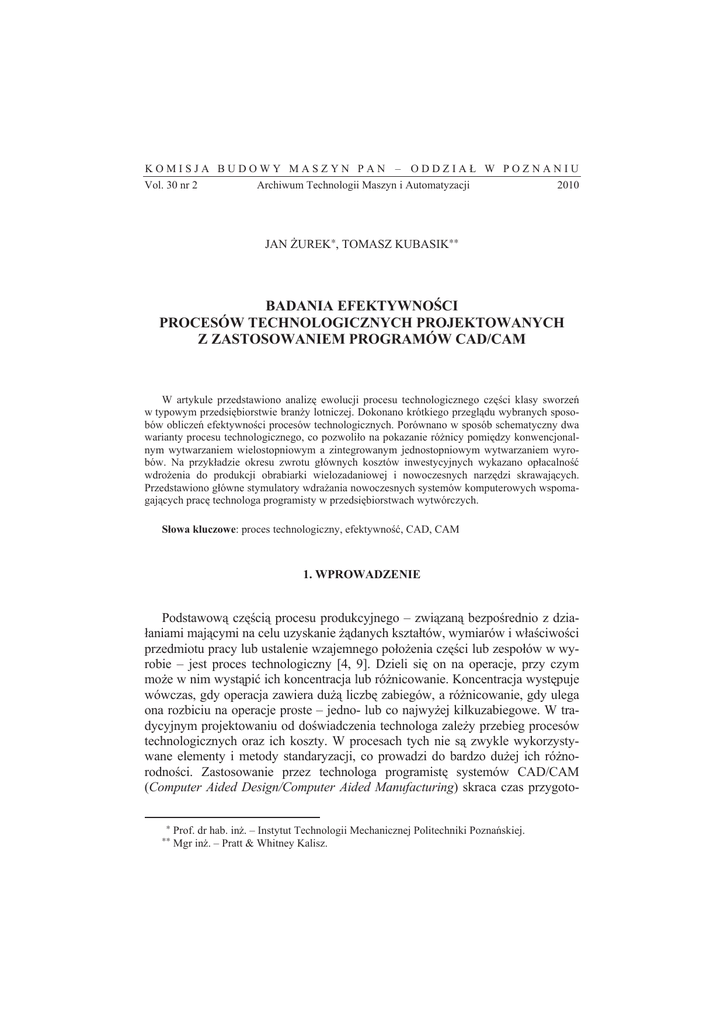 KOMISJA BUDOWY MASZYN PAN – ODDZIAà W POZNANIU Vol. 30 nr 2 Archiwum Technologii Maszyn i Automatyzacji 2010 JAN ĩUREK∗, TOMASZ KUBASIK∗∗ BADANIA EFEKTYWNOĝCI PROCESÓW TECHNOLOGICZNYCH PROJEKTOWANYCH Z ZASTOSOWANIEM PROGRAMÓW CAD/CAM W artykule przedstawiono analizĊ ewolucji procesu technologicznego czĊĞci klasy sworzeĔ w typowym przedsiĊbiorstwie branĪy lotniczej. Dokonano krótkiego przeglądu wybranych sposobów obliczeĔ efektywnoĞci procesów technologicznych. Porównano w sposób schematyczny dwa warianty procesu technologicznego, co pozwoliáo na pokazanie róĪnicy pomiĊdzy konwencjonalnym wytwarzaniem wielostopniowym a zintegrowanym jednostopniowym wytwarzaniem wyrobów. Na przykáadzie okresu zwrotu gáównych kosztów inwestycyjnych wykazano opáacalnoĞü wdroĪenia do produkcji obrabiarki wielozadaniowej i nowoczesnych narzĊdzi skrawających. Przedstawiono gáówne stymulatory wdraĪania nowoczesnych systemów komputerowych wspomagających pracĊ technologa programisty w przedsiĊbiorstwach wytwórczych. Sáowa kluczowe: proces technologiczny, efektywnoĞü, CAD, CAM 1. WPROWADZENIE Podstawową czĊĞcią procesu produkcyjnego – związaną bezpoĞrednio z dziaáaniami mającymi na celu uzyskanie Īądanych ksztaátów, wymiarów i wáaĞciwoĞci przedmiotu pracy lub ustalenie wzajemnego poáoĪenia czĊĞci lub zespoáów w wyrobie – jest proces technologiczny [4, 9]. Dzieli siĊ on na operacje, przy czym moĪe w nim wystąpiü ich koncentracja lub róĪnicowanie. Koncentracja wystĊpuje wówczas, gdy operacja zawiera duĪą liczbĊ zabiegów, a róĪnicowanie, gdy ulega ona rozbiciu na operacje proste – jedno- lub co najwyĪej kilkuzabiegowe. W tradycyjnym projektowaniu od doĞwiadczenia technologa zaleĪy przebieg procesów technologicznych oraz ich koszty. W procesach tych nie są zwykle wykorzystywane elementy i metody standaryzacji, co prowadzi do bardzo duĪej ich róĪnorodnoĞci. Zastosowanie przez technologa programistĊ systemów CAD/CAM (Computer Aided Design/Computer Aided Manufacturing) skraca czas przygoto∗ ∗∗ Prof. dr hab. inĪ. – Instytut Technologii Mechanicznej Politechniki PoznaĔskiej. Mgr inĪ. – Pratt & Whitney Kalisz. 174 J. ĩurek, T. Kubasik wania procesu techologicznego, zwiĊksza efektywnoĞü oraz zmniejsza ryzyko popeánienia báĊdu przy opracowywaniu programu na obrabiarki sterowane numerycznie [11]. Na Ğwiecie dąĪy siĊ do wykonywania moĪliwie najwiĊkszej liczby powierzchni, a najlepiej caáej czĊĞci, na jednej obrabiarce wielozadaniowej. Obróbka kompletna, integracja technik wytwarzania i technika symulacyjna warunkują obecnie rozwój kaĪdego przedsiĊbiorstwa. ZwiĊkszają one elastycznoĞü produkcji i wyraĨnie skracają áaĔcuchy wytwórcze, co przekáada siĊ na skrócenie czasu obróbki, czyli na zwiĊkszenie efektywnoĞci procesu produkcyjnego [7]. EfektywnoĞü ekonomiczna przedsiĊbiorstwa (zwana równieĪ ekonomicznoĞcią, rodzajem sprawnoĞci dziaáania), definiowana np. jako rezultat dziaáalnoĞci gospodarczej przedsiĊbiorstwa, gaáĊzi produkcji lub caáej gospodarki [3], okreĞla relacjĊ uzyskanych efektów do poniesionych nakáadów. Najdokáadniej efektywnoĞü procesu technologicznego E moĪna obliczyü za pomocą wskaĨnika ekonomicznej efektywnoĞci przedsiĊwziĊcia (1), opisanego dokáadnie w pracy [12]: §1 · ¨¨ I + K ¸b + s ¹̧ E = ©T , P (1) gdzie: T – czas zwrotu nakáadów inwestycyjnych, I – wielkoĞü nakáadów inwestycyjnych, K – koszt robocizny, s – roczna wartoĞü zuĪycia surowców, materiaáów, paliwa, energii itp., b – wspóáczynnik korygujący, wyraĪający wpáyw dáugoĞci okresu eksploatacji na efektywnoĞü inwestycji, P – roczna wielkoĞü produkcji. EfektywnoĞü procesu technologicznego zaleĪy bezpoĞrednio od sumy czasów jednostkowych tj, sumy czasów przygotowawczo-zakoĔczeniowych tpz i nakáadów inwestycyjnych. W celu porównania dwóch wariantów procesu technologicznego wykazano róĪnicĊ w czasach ich wykonania oraz okres zwrotu gáównych kosztów inwestycyjnych T0 przy okreĞlonym rocznym planie produkcyjnym i staáym koszcie roboczogodziny w przedsiĊbiorstwie. Do wyliczenia powyĪszego posáuĪyá wzór, dokáadniej opisany w pracy [5]: T0 = I , (2) Uk gdzie: I – suma nakáadów poniesionych na realizacjĊ przedsiĊwziĊcia, Uk – suma rocznych oszczĊdnoĞci. Do oszacowania sumy oszczĊdnoĞci rocznych Uk wykorzystano wzór (3), przy czym za ekonomiczną wielkoĞü serii produkcyjnej przyjĊto 50 czĊĞci: Badania efektywnoĞci procesów technologicznych... ∆ ¦ t pz · § ¸¸ K r , U k = P¨¨ ∆ ¦ t j + 50 ¹ © 175 (3) gdzie: ∆ ¦ t j – róĪnica sumy czasów jednostkowych dwóch wariantów procesu, ∆ ¦ t pz – róĪnica sumy czasów przygotowawczo-zakoĔczeniowych, Kr – koszt jednej godziny roboczej na wydziale produkcyjnym, P – roczna wielkoĞü produkcji. 2. EWOLUCJA PROCESU TECHNOLOGICZNEGO Do badaĔ przyjĊto zaprojektowany kilkanaĞcie lat temu proces technologiczny obróbki czĊĞci klasy sworzeĔ, wchodzącej w skáad przekáadni planetarnej silnika turboĞmigáowego (rys. 1, 2). CzĊĞü byáa ksztaátowana w wiĊkszoĞci na obrabiarkach konwencjonalnych o duĪym stopniu róĪnicowania operacji (tabl. 1). Materiaá czĊĞci to podwyĪszonej jakoĞci lotnicza stal niskostopowa z zawartoĞcią wĊgla 0,07 – 0,13% oraz duĪą zawartoĞcią chromu (1 – 1,4%) i niklu (3 – 3,5%), dodatkowo zawierająca mangan, krzem, fosfor, molibden, bor, miedĨ, siarkĊ. Stal ta zazwyczaj jest stosowana na czĊĞci nawĊglane wymagające duĪej miniRys. 1. Sworznie w malnej twardoĞci rdzenia w wąskim zakresie i podlegające koĔcowej fazie prosztywnym normom defektoskopii magnetycznej proszkowej. cesu ObrabialnoĞü materiaáu (wg AISI – American Iron and Steel Fig. 1. Pins in final phase of process Institute) w stanie dostawy ksztaátuje siĊ na poziomie 50% przy twardoĞci 24 HRC. Po uleps