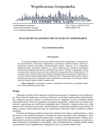 Współczesna Gospodarka Contemporary Economy Electronic Scientific Journal www.wspolczesnagospodarka.pl Vol. 1 Issue 1 (2010) 49-56 ISSN 2082-677X ZNACZENIE WŁASNOŚCI PRYWATNEJ W GOSPODARCE Krzysztof Dobrowolski Streszczenie W artykule poddano teoretycznej analizie możliwości uruchomienia i funkcjonowania mechanizmów: rynkowego i konkurencji w gospodarce upaństwowionej i rynkowej z dominacją własności prywatnej. Przeprowadzona analiza wskazuje, że w gospodarce upaństwowionej mechanizm rynkowy nie może funkcjonować, natomiast mechanizm konkurencji przyjmuje specyficzną, zdeformowana postać. Jedynie w gospodarce zdominowanej przez własność prywatną oba mechanizmy mogą prawidłowo funkcjonować. W ostatniej części artykułu zajęto się problemem niepełnej prywatyzacji jako rezultatem stosowania różnych metod przekształceń własnościowych. Dokonano także analizy wpływu niepełnej prywatyzacji na funkcjonowanie mechanizmu rynkowego i mechanizmu konkurencji na różnych typach rynków cząstkowych. Słowa kluczowe: mechanizm rynkowy, mechanizm konkurencji, gospodarka upaństwowiona, niepełna prywatyzacja Wstęp Własność prywatna może zajmować zróżnicowaną pozycję w organizacji życia społecznego. Może stanowić fundament, na którym budowane są instytucje społeczeństwa obywatelskiego i zajmować poczesne miejsce w systemie prawnym, znajdując się pod szczególną ochroną władz publicznych. Może być spychana na margines gospodarki, eliminowana ze struktur społecznych, ograniczana do możliwości posiadania przez obywateli i dysponowania przez nich jedynie ściśle określonymi rzeczami, umożliwiającymi zaspokojenie podstawowych potrzeb. W takim systemie władza publiczna staje się właścicielem większości, bądź wszystkich, środków produkcji. Przyjęcie określonego modelu usytuowania własności prywatnej w społeczeństwie, a może być jeszcze wiele modeli pośrednich w stosunku do zarysowanych powyżej, oddziałuje w istotny sposób na kształt różnorodnych społecznych instytucji i ich funkcjonowanie. Dlatego też w odpowiedzi na tytułowy problem inne zagadnienia ważne byłyby dla socjologa czy prawnika a inne dla historyka, politologa czy ekonomisty. Jako przedstawiciel tej ostatniej profesji skupię się na podstawowych zagadnieniach znajdujących się w jej obszarze badawczym. 50 Krzysztof Dobrowolski 1. Mechanizm rynkowy w gospodarce upaństwowionej i rynkowej Od dwudziestu lat zmagamy się ze spuścizną systemu negującego społeczne znaczenie własności prywatnej i przywracamy ustrój, w którym zajmuje ona należne sobie miejsce. Znaczna część naszego społeczeństwa pamięta jeszcze lata osiemdziesiąte poprzedniego wieku, kiedy problemem, często nie do przezwyciężenia, było kupienie podstawowych produktów czy usług. Był to schyłkowy okres gospodarki scentralizowanej, opartej na państwowej własności, która w całej swojej historii nie zapewniła obywatelom poziomu życia charakterystycznego dla społeczeństw zachodnich. Podstawową przyczyną ekonomiczną był brak w gospodarce rozwiniętej własności prywatnej, która jest fundamentem prawidłowego jej funkcjonowania. Dwa ważne mechanizmy stanowią siłę napędową rozwoju gospodarczego: mechanizm rynkowy i mechanizm konkurencji. Żaden z nich nie może prawidłowo funkcjonować w gospodarce upaństwowionej czyli pozbawionej własności prywatnej i jej głównego przedstawiciela – przedsiębiorcy. Funkcjonowaniu mechanizmu rynkowego zawdzięczmy równoważenie popytu na dobra materialne i usługi z ich podażą za pośrednictwem cen swobodnie kształtowanych przez rynek. Warunkami umożliwiającymi efektywne funkcjonowanie tego mechanizmu są: zdecentralizowana struktura podmiotowa po stronie podaży, sprawnie dostosowująca się do warunków otoczenia, popyt wrażliwy na działanie bodźców finansowych oraz elastyczna struktura cen. W gospodarce pozbawionej własności prywatnej warunki te nie są spełnione. Podaż reprezentowana przez państwowe przedsiębiorstwa jest mało lub, w niektórych segmentach gospodarki, nawet całkowicie niewrażliwa na oddziaływanie popytu. Wielkość i struktura produkcji nie jest dostosowywana do potrzeb konsumentów, ponieważ nie wymusza tego otoczenie gospodarcze. Państwowe przedsiębiorstwa w zetatyzowanym systemie nie mogą zbankrutować, nie działa więc podstawowy mechanizm wymuszający uwzględnianie oczekiwań klientów i eliminujący z rynku nieudolnych producentów. Proces tworzenia nowych, państwowych podmiotów gospodarczych jest natomiast długi, wmontowany w całą mało efektywną i zbiurokratyzowaną strukturę urzędów państwowych, co również przyczynia się do usztywnienia podażowej strony gospodarki. Powstałe w ten sposób przedsiębiorstwa bardzo często już w momencie rozpoczynania działalności wytwarzają produkty mało nowoczesne, które jednak wykupywane są przez klientów z braku innych możliwości. W gospodarce zetatyzowanej nie jest również spełniony warunek dotyczący prawidłowego i elastycznego układu cen, stanowiącego istotę mechanizmu przywracania równowagi między popytem a podażą. W znakomitej większości ceny ustalane są przez państwo i utrzymywane na poziomie uwarunkowanym nie czynnikami ekonomicznymi lecz politycznymi, w obawie przed wybuchem niezadowolenia społecznego.1 Powoduje to, że ceny nie zawierają w sobie podstawowych informacji niezbędnych dla podejmowania racjonalnych decyzji zarówno przez producentów jak i konsumentów. Producentów nie informują o rzadkości wykorzystywanych zasobów, uniemożliwiając prowadzenie prawidłowego rachunku ekonomicznego. Klientów nie informują o rzeczywistej wartości poszczególnych dóbr, nie stanowią więc efektywnego regulatora popytu. W rezultacie niedostateczna podaż towarów i usług, będąca wynikiem strukturalnej nieefektywności i małej elastyczności producentów, spotyka się z