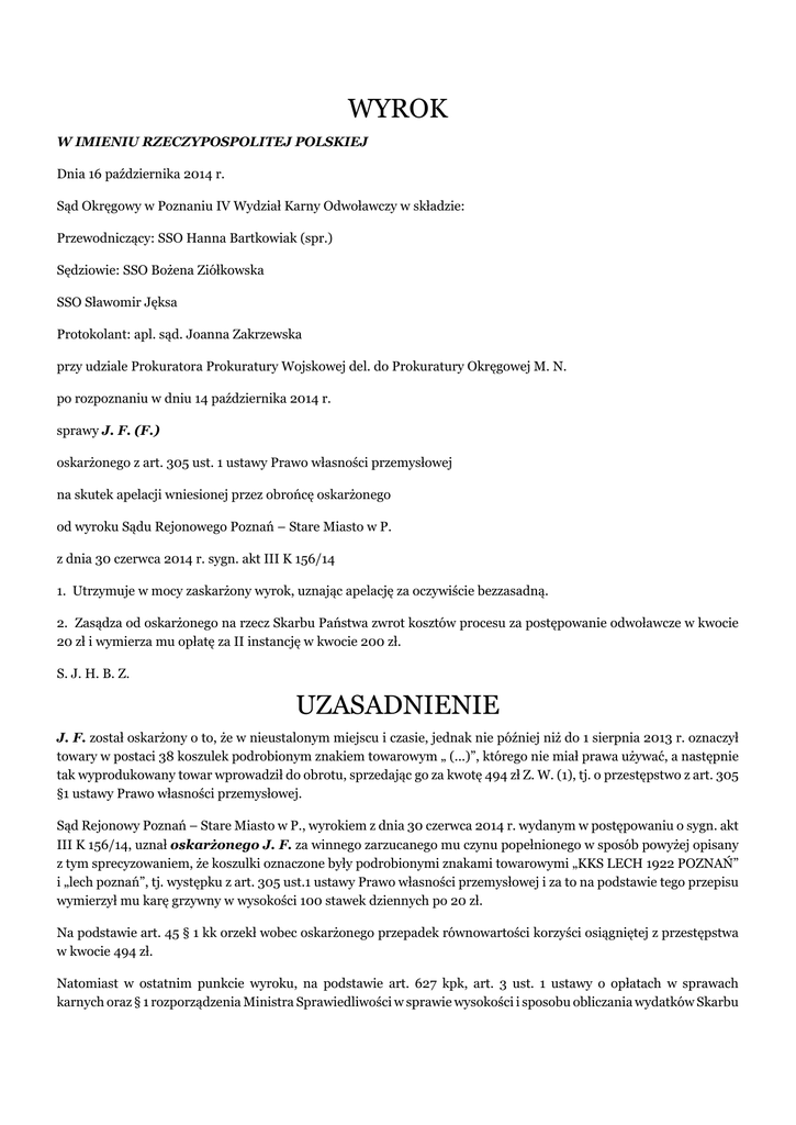 WYROK W IMIENIU RZECZYPOSPOLITEJ POLSKIEJ Dnia 16 października 2014 r. Sąd Okręgowy w Poznaniu IV Wydział Karny Odwoławczy w składzie: Przewodniczący: SSO Hanna Bartkowiak (spr.) Sędziowie: SSO Bożena Ziółkowska SSO Sławomir Jęksa Protokolant: apl. sąd. Joanna Zakrzewska przy udziale Prokuratora Prokuratury Wojskowej del. do Prokuratury Okręgowej M. N. po rozpoznaniu w dniu 14 października 2014 r. sprawy J. F. (F.) oskarżonego z art. 305 ust. 1 ustawy Prawo własności przemysłowej na skutek apelacji wniesionej przez obrońcę oskarżonego od wyroku Sądu Rejonowego Poznań – Stare Miasto w P. z dnia 30 czerwca 2014 r. sygn. akt III K 156/14 1. Utrzymuje w mocy zaskarżony wyrok, uznając apelację za oczywiście bezzasadną. 2. Zasądza od oskarżonego na rzecz Skarbu Państwa zwrot kosztów procesu za postępowanie odwoławcze w kwocie 20 zł i wymierza mu opłatę za II instancję w kwocie 200 zł. S. J. H. B. Z. UZASADNIENIE J. F. został oskarżony o to, że w nieustalonym miejscu i czasie, jednak nie później niż do 1 sierpnia 2013 r. oznaczył towary w postaci 38 koszulek podrobionym znakiem towarowym „ (...)”, którego nie miał prawa używać, a następnie tak wyprodukowany towar wprowadził do obrotu, sprzedając go za kwotę 494 zł Z. W. (1), tj. o przestępstwo z art. 305 §1 ustawy Prawo własności przemysłowej. Sąd Rejonowy Poznań – Stare Miasto w P., wyrokiem z dnia 30 czerwca 2014 r. wydanym w postępowaniu o sygn. akt III K 156/14, uznał oskarżonego J. F. za winnego zarzucanego mu czynu popełnionego w sposób powyżej opisany z tym sprecyzowaniem, że koszulki oznaczone były podrobionymi znakami towarowymi „KKS LECH 1922 POZNAŃ” i „lech poznań”, tj. występku z art. 305 ust.1 ustawy Prawo własności przemysłowej i za to na podstawie tego przepisu wymierzył mu karę grzywny w wysokości 100 stawek dziennych po 20 zł. Na podstawie art. 45 § 1 kk orzekł wobec oskarżonego przepadek równowartości korzyści osiągniętej z przestępstwa w kwocie 494 zł. Natomiast w ostatnim punkcie wyroku, na podstawie art. 627 kpk, art. 3 ust. 1 ustawy o opłatach w sprawach karnych oraz § 1 rozporządzenia Ministra Sprawiedliwości w sprawie wysokości i sposobu obliczania wydatków Skarbu Państwa w postępowaniu karnym zasądził od oskarżonego na rzecz Skarbu Państwa koszty sądowe w wysokości 290 zł, obejmujące opłatę w wysokości 200 zł oraz 90 zł tytułem wydatków poniesionych przez Skarb Państwa. Powyższy wyrok zaskarżył w całości obrońca oskarżonego. Zarzucił on temu orzeczeniu: 1. obrazę przepisów prawa materialnego, to jest art. 305 ust. 1 ustawy Prawo własności przemysłowej w zw. art. 120 ust. 3 pkt. 3 ustawy Prawo własności przemysłowej poprzez błędne zastosowanie i przyjęcie, że zachodzą podstawy do uznania, że oskarżony J. F. zarzucanym mu czynem wypełnił znamiona przestępstwa określonego w art. 305 ust. 1 ustawy Prawo własności przemysłowej, podczas gdy ze zgromadzonego w sprawie materiału dowodowego nie wynika aby oskarżonego wypełniał znamiona tego przestępstwa; 2. obrazę przepisów prawa procesowego, która miała wpływ na treść orzeczenia, to jest: -. • art. 413 § 1 pkt 2 kpk w zw. z art. 438 pkt 2 kpk poprzez brak wskazania w zaskarżonym wyroku wszystkich dat i miejsc rozpoznania sprawy, na skutek pominięcia części rozpraw, w trakcie których doszło do rozpoznania sprawy, tj. pominięcie faktu naprowadzenia rozpraw w dniach 29 kwietnia 2014 r. oraz w dniu 3 czerwca 2014 r.; • art. 424 § 1 pkt 1 kpk w zw. z art. 7 kpk poprzez wydanie zaskarżonego wyroku w oparciu o niepełny materiał dowodowy na skutek pominięcia części zgromadzonego w sprawie materiału dowodowego w postaci dowodów z zeznań świadka Z. W. (1), złożonych w dniach 27 sierpnia oraz 12 grudnia 2013r., co miało wpływ na treść wydanego orzeczenia, jak również nie wskazane w treści uzasadnienia, z jakiego powodu Sąd I instancji pominął ww. dowody. Wywodząc tak, apelujący wniósł o zmianę zaskarżonego orzeczenia i uniewinnienie oskarżonego J. F. od zarzucanego mu przestępstwa, ewentualnie o uchylenie wyroku i przekazanie sprawy Sądowi I instancji do ponownego rozpoznania. Sąd Okręgowy zważył, co następuje: Apelacja okazała się oczywiście bezzasadna i nie zasługiwała na uwzględnienie. Na wstępie podkreślić trzeba, że cechę oczywistej bezzasadności (art. 457 § 2 kpk) przypisuje się środkowi odwoławczemu, jeśli już na pierwszy rzut oka, bez konieczności dogłębnej analizy podniesionych zarzutów, można zauważyć, że wskazane na ich poparcie argumenty nie są trafne. W świetle twierdzeń apelującego trudno bowiem dostrzec by w zaskarżonym orzeczeniu występowały uchybienia określone w art. 438 kpk czy art. 439 kpk, ewentualnie by zachodziła przesłanka z art. 440 kpk. Apelacją oczywiście bezzasadną jest więc taka, której bezpodstawność wynika z samej jej treści i co powoduje, że uwzględniona być ona nie może (por. wyrok SA w Krakowie z 28 lutego 2007r., II AKa 26/07, KZS 2007/4/38). Taką oczywistą bezzasadność środka odwoławczego stwierdzono w niniejszej sprawie. W świetle zgłoszonych przez apelującego zarzutów nie ujawniły się bowiem jakiekolwiek uchybienia Sądu I instancji. Przesłanka uchylenia bądź zmiany zaskarżonego orzeczenia nie uzewnętrzniła się także podczas tych działań kontrolnych, które Sąd II instancji podjął z urzędu. Działań, które podyktowane były przyjęciem założenia, że sąd odwoławczy może wyjść poza granice środka odwoławczego i podniesionych w nim zarzutów w wypadkach określonych w ustawie, a to w sytuacjach wskazanych w art. 439, art. 440 i art. 455 kpk (vide: postanowienie SN z 13 marca 2014 r., KK 9/14, Lex nr 1466528). Omawiając powody podjętego w postępowaniu drugoinstancyjnym rozstrzygnięcia, wskazać również trzeba, że koniecznym stało się nieprzyj
