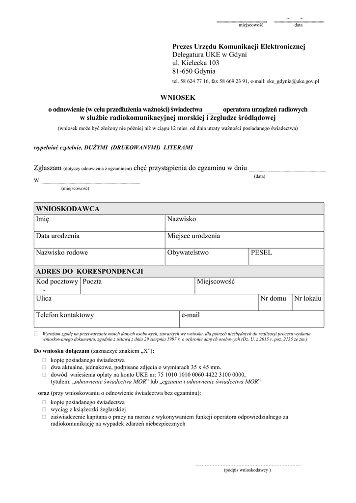 miejscowość data Prezes Urzędu Komunikacji Elektronicznej Delegatura UKE w Gdyni ul. Kielecka 103 81-650 Gdynia tel. 58 624 77 16, fax 58 669 23 91, e-mail: [email protected] WNIOSEK o odnowienie (w celu przedłużenia ważności) świadectwa operatora urządzeń radiowych w służbie radiokomunikacyjnej morskiej i żegludze śródlądowej (wniosek może być złożony nie później niż w ciągu 12 mies. od dnia utraty ważności posiadanego świadectwa) wypełniać czytelnie, DUŻYMI (DRUKOWANYMI) LITERAMI Zgłaszam (dotyczy odnowienia z egzaminem) chęć przystąpienia do egzaminu w dniu (data) w (miejscowość) WNIOSKODAWCA Imię Nazwisko Data urodzenia Miejsce urodzenia Nazwisko rodowe Obywatelstwo ADRES DO KORESPONDENCJI Kod pocztowy Poczta Ulica Telefon kontaktowy PESEL Miejscowość Nr domu Nr lokalu e-mail Wyrażam zgodę na przetwarzanie moich danych osobowych, zawartych we wniosku, dla potrzeb niezbędnych do realizacji procesu wydania wnioskowanego dokumentu, zgodnie z ustawą z dnia 29 sierpnia 1997 r. o ochronie danych osobowych (Dz. U. z 2015 r. poz. 2135 ze zm.) Do wniosku dołączam (zaznaczyć znakiem „X”): kopię posiadanego świadectwa dwa aktualne, jednakowe, podpisane zdjęcia o wymiarach 35 x 45 mm. dowód wniesienia opłaty na konto UKE nr: 75 1010 1010 0060 4422 3100 0000, tytułem: „odnowienie świadectwa MOR” lub „egzamin i odnowienie świadectwa MOR” oraz (przy wnioskowaniu o odnowienie świadectwa bez egzaminu): kopię posiadanego świadectwa wyciąg z książeczki żeglarskiej zaświadczenie kapitana o pracy na morzu z wykonywaniem funkcji operatora odpowiedzialnego za radiokomunikację na wypadek zdarzeń niebezpiecznych …………………………………………………………. (podpis wnioskodawcy ) Informacja o wysokości opłat za: Odnowienie świadectwa bez egzaminu Odnowienie świadectwa z egzaminem wydanie świadectwa 25 zł 25 zł egzamin 100 zł (każdorazowo) Jeśli wniosek dotyczy odnowienia świadectwa z egzaminem, wniosek należy złożyć co najmniej 14 dni przed wskazanym terminem egzaminu (decyduje data stempla pocztowego). Kwituję odbiór świadectwa nr ............................ .............................................................................. i m i ę i n a z w i s k o o s o b y o d b i e r a j ą c e j ś wi a d e c t wo ............................................ data i podpis