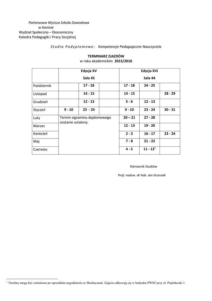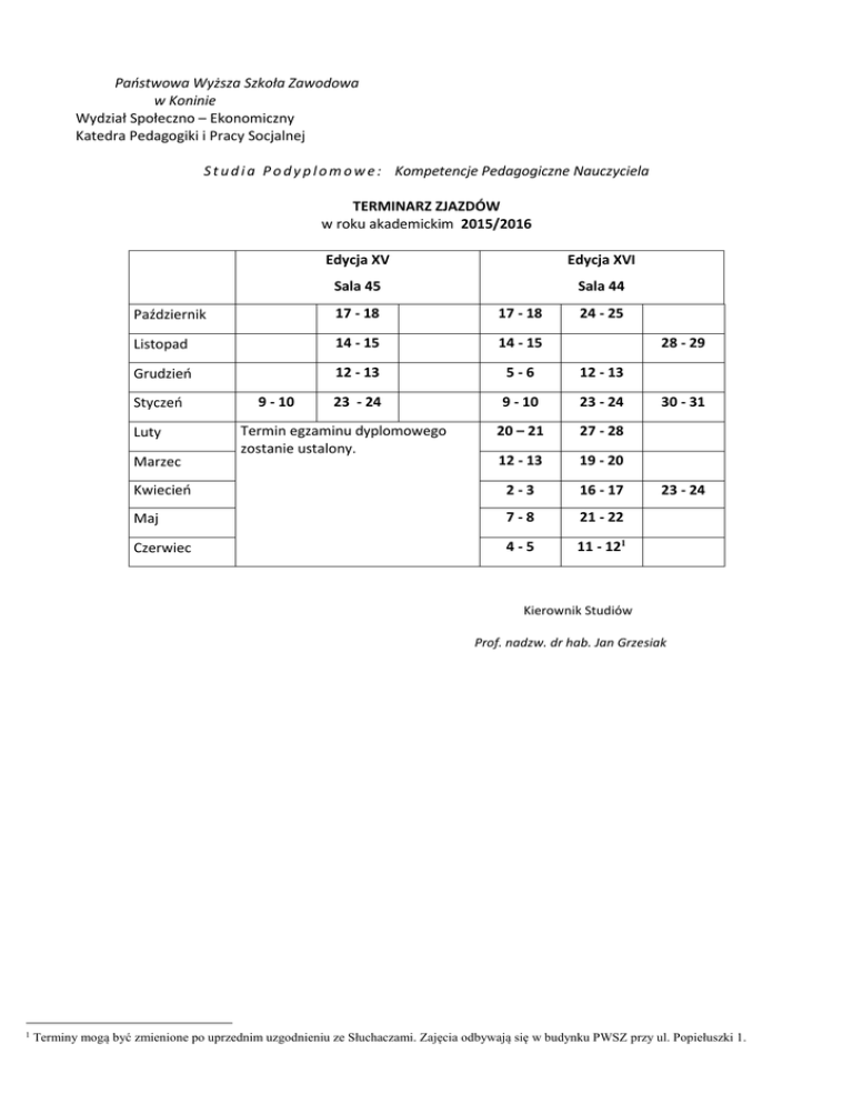 Państwowa Wyższa Szkoła Zawodowa w Koninie Wydział Społeczno – Ekonomiczny Katedra Pedagogiki i Pracy Socjalnej S t u d i a P o d y p l o m o w e : Kompetencje Pedagogiczne Nauczyciela TERMINARZ ZJAZDÓW w roku akademickim 2015/2016 Edycja XV Edycja XVI Sala 45 Sala 44 Październik 17 - 18 17 - 18 Listopad 14 - 15 14 - 15 Grudzień 12 - 13 5-6 12 - 13 23 - 24 9 - 10 23 - 24 20 – 21 27 - 28 12 - 13 19 - 20 Kwiecień 2-3 16 - 17 Maj 7-8 21 - 22 Czerwiec 4-5 11 - 121 Styczeń Luty Marzec 9 - 10 Termin egzaminu dyplomowego zostanie ustalony. 24 - 25 28 - 29 30 - 31 23 - 24 Kierownik Studiów Prof. nadzw. dr hab. Jan Grzesiak 1 Terminy mogą być zmienione po uprzednim uzgodnieniu ze Słuchaczami. Zajęcia odbywają się w budynku PWSZ przy ul. Popiełuszki 1. PWSZ Konin Rozkład zajęć – 2015_2016 (semestr zimowy) (z) Studia podyplomowe Data 17.10 18.10 24.10 25.10 Godz. rozpoczęcia 8.00 11.30 8.00 11.30 8.00 11.30 8.00 11.30 Kompetencje Pedagogiczne Nauczyciela (XV - XVI) EDYCJA XV Przedmiot / prowadzący Dydaktyka szczegółowa – JG Dydaktyka szczegółowa – JG Wykład monograficzny – TO Emisja głosu i komunikacja interpersonalna – JK Seminarium dyplomowe – wg indywidualnych uzgodnień ----- sala 45 45 45 45 45 45 45 45 EDYCJA XVI Przedmiot / prowadzący Psychologia – J. Nawrocki Psychologia – J. Nawrocki Dydaktyka – T. Knotowicz Pedagogika – T. Olejniczak Diagnostyka psychopedagogiczna - JG Psychologia – J. Nawrocki Dydaktyka – T. Knotowicz Pedagogika – T. Olejniczak sala 44 44 44 44 44 44 44 44 Oznaczenia: JG – prof. nadzw. dr hab. Jan Grzesiak; JK – dr Jadwiga Knotowicz; MJ – doc. dr Mariusz Jabłoński; JN – doc. dr Józef Nawrocki; TO – prof. PWSZ dr Tomasz Olejniczak. Uwagi: Zajęcia odbywają się w modułach obejmujących 2 – 4 godzin dydaktycznych. Uczestnicy studiów mają możliwość odbywania części zajęć w formie konsultacji indywidualnych (grupowych) według zasad uzgodnionych z poszczególnymi nauczycielami akademickimi. Ponadto zakłada się aktywne uczestnictwo słuchaczy studiów w formach opartych na e–learningu i e-platformie.