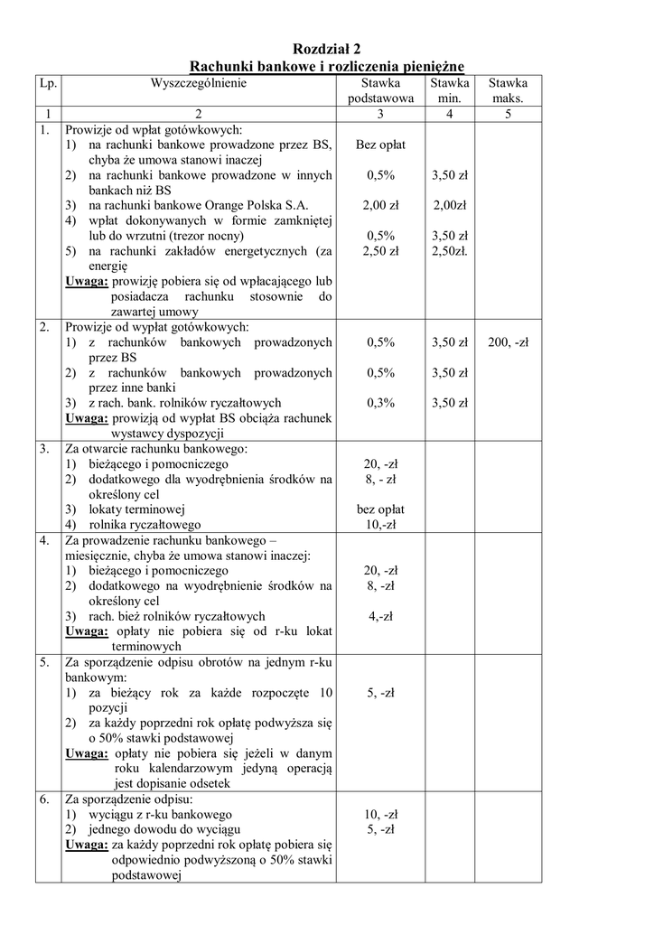 Rozdział 2 Rachunki bankowe i rozliczenia pieniężne Lp. Wyszczególnienie 1 1. 2 Prowizje od wpłat gotówkowych: 1) na rachunki bankowe prowadzone przez BS, chyba że umowa stanowi inaczej 2) na rachunki bankowe prowadzone w innych bankach niż BS 3) na rachunki bankowe Orange Polska S.A. 4) wpłat dokonywanych w formie zamkniętej lub do wrzutni (trezor nocny) 5) na rachunki zakładów energetycznych (za energię Uwaga: prowizję pobiera się od wpłacającego lub posiadacza rachunku stosownie do zawartej umowy Prowizje od wypłat gotówkowych: 1) z rachunków bankowych prowadzonych przez BS 2) z rachunków bankowych prowadzonych przez inne banki 3) z rach. bank. rolników ryczałtowych Uwaga: prowizją od wypłat BS obciąża rachunek wystawcy dyspozycji Za otwarcie rachunku bankowego: 1) bieżącego i pomocniczego 2) dodatkowego dla wyodrębnienia środków na określony cel 3) lokaty terminowej 4) rolnika ryczałtowego Za prowadzenie rachunku bankowego – miesięcznie, chyba że umowa stanowi inaczej: 1) bieżącego i pomocniczego 2) dodatkowego na wyodrębnienie środków na określony cel 3) rach. bież rolników ryczałtowych Uwaga: opłaty nie pobiera się od r-ku lokat terminowych Za sporządzenie odpisu obrotów na jednym r-ku bankowym: 1) za bieżący rok za każde rozpoczęte 10 pozycji 2) za każdy poprzedni rok opłatę podwyższa się o 50% stawki podstawowej Uwaga: opłaty nie pobiera się jeżeli w danym roku kalendarzowym jedyną operacją jest dopisanie odsetek Za sporządzenie odpisu: 1) wyciągu z r-ku bankowego 2) jednego dowodu do wyciągu Uwaga: za każdy poprzedni rok opłatę pobiera się odpowiednio podwyższoną o 50% stawki podstawowej 2. 3. 4. 5. 6. Stawka podstawowa 3 Stawka min. 4 Stawka maks. 5 Bez opłat 0,5% 3,50 zł 2,00 zł 2,00zł 0,5% 2,50 zł 3,50 zł 2,50zł. 0,5% 3,50 zł 0,5% 3,50 zł 0,3% 3,50 zł 20, -zł 8, - zł bez opłat 10,-zł 20, -zł 8, -zł 4,-zł 5, -zł 10, -zł 5, -zł 200, -zł 7. 8. 9. 10. 11. 12. 13. 14. 15. 16. 17. Za udzielanie telefonicznej informacji o saldzie r-ku Klienta – na podstawie umowy zawartej z Klientem – po podaniu hasła - miesięcznie (za dany miesiąc z góry) 5, -zł Za wydanie na wniosek Klienta: 1) zestawienia obrotów na jednym rachunku i 30, -zł opinii o rachunku 2) zaświadczenia stwierdzającego posiadanie 20, -zł rachunku bieżącego i wysokości salda Za przelewy: 1) na r-ki bankowe prowadzone przez BS bez opłat 2) na r-ki bankowe prowadzone przez inne 3,50 -zł banki od każdego przelewu 3) na r-ki Orange Polska S.A. 2,00- zł 4) za realizację polecenia zapłaty w banku dłużnika 2,00 zł 5) odwołanie polecenia zapłaty przez dłużnika 3,00 zł 6) na r-ki bankowe zakładu energetycznego za 2,50zł energie elektryczną Za wydanie na wniosek Klienta potwierdzenia 5, -zł wykonania przelewu. Za wydanie czeków gotówkowych lub rozrachunkowych posiadaczom r-ków bankowych: 1) za książeczkę - 25-czekową 25, -zł 2) za pojedynczy blankiet czekowy wydany 1, -zł doraźnie Za potwierdzenie czeku rozrachunkowego lub 5, -zł gotówkowego – od każdego czeku Za dokonanie automatycznych przelewów z r-ków bankowych w terminie wskazanym przez Klienta 5, -zł od każdej dyspozycji. 1) Zgłoszenie i wykonanie zastrzeżenia o utracie 20, -zł czeków gotówkowych, rozrachunkowych oraz dowodów tożsamości, 2) Odwołanie zastrzeżenia o utracie czeków 20, -zł gotówkowych, rozrachunkowych i dowodów tożsamości. Za dokonanie blokady środków na rachunku 10, -zł bankowym Za realizację tytułu wykonawczego lub dokumentu mającego moc takiego tytułu z r-ków 0,5% kwoty bankowych. zajętej Uwaga: opłatę pobiera się z r-ku bankowego dłużnika. Za przyjęcie do inkasa czeków gotówkowych i 10, -zł rozrachunkowych – od każdego czeku. 18. Za dokonane wpłaty ZUS 0,5% kwoty 3,50 -zł