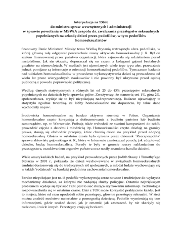 Interpelacja nr 13696 do ministra spraw wewnętrznych i administracji w sprawie powołania w MSWiA zespołu ds. zwalczania przestępstw seksualnych popełnianych na szkodę dzieci przez pedofilów, w tym pedofilów homoseksualistów Szanowny Panie Ministrze! Miesiąc temu Wielką Brytanią wstrząsnęła afera pedofilska, w której główną rolę odgrywał powszechnie znany aktywista homoseksualny J. R. Był on szefem finansowanej przez państwo organizacji, która zajmowała się udzielaniem porad nastolatkom. Jak się okazało, dopuszczał się on razem z kolegami gejami brutalnych gwałtów na niemowlętach. W mediach jest ujawnianych wiele tego typu afer, przeważnie jednak pomijane są informacje o orientacji homoseksualnej pedofilów. Tymczasem badania nad udziałem homoseksualistów w procederze wykorzystywania dzieci są prowadzone od wielu lat przez wiarygodnych naukowców i nie powinny być ukrywane przed opinią publiczną z powodu poprawności politycznej. Według danych statystycznych z różnych lat od 23 do 43% przestępstw seksualnych popełnianych na dzieciach było sprawką gejów. Zważywszy, że stanowią oni 1%, góra 2%, społeczeństwa, wydaje się to być niepokojącą nadreprezentacją. Badacze ujawniający te statystyki zgodnie twierdzą, że lobby homoseksualne nie dopuszcza, by takie dane wychodziły na jaw. Środowiska homoseksualne są bardzo aktywne również w Polsce. Organizacje homoseksualne często korzystają z dofinansowania z budżetu państwa lub budżetu samorządów, np. w Warszawie. Próbują także wchodzić ze swoimi kampaniami do szkół, prowadzić zajęcia z dziećmi i młodzieżą itp. Homoseksualiści często działają na granicy prawa, starają się obchodzić przepisy, które chronią dzieci na przykład przed adopcją homoseksualną. Głośna w ostatnim czasie była opisana przez dziennik ˝Rzeczpospolita˝ sprawa aktywisty gejowskiego A. K., który w Internecie zamieszczał porady, jak adoptować dziecko, będąc homoseksualistą. Porady te były w gruncie rzeczy nakłanianiem do przestępstwa, oszukiwaniem organów państwa oraz nosiły znamiona handlu dziećmi. Wiele amerykańskich badań, na przykład prowadzonych przez Judith Stacey i Timothy˝ego Biblarza w 2001 r., pokazało, że dzieci wychowywane w związkach homoseksualnych trudniej dostosowują się do tradycyjnych ról społecznych, a młodzi ludzie wychowujący się w takich ˝rodzinach˝ są bardziej podatni na zachowania homoseksualne. Bardzo niepokojące jest to, iż pedofile wykorzystują coraz nowsze i trudniejsze do wykrycia mechanizmy działania, za którymi nie nadążają służby policyjne. Ostatnio największym problemem wydaje się być sieć TOR. Jest to sieć służąca szyfrowaniu informacji. Technologia rozpowszechniła się w ostatnim czasie. Dziś z TOR może korzystać praktycznie każdy. Jest to miejsce, które od razu upodobali sobie przestępcy, głównie przestępcy seksualni. W sieci można znaleźć mnóstwo materiałów z pornografią dziecięcą. Pedofile wymieniają się tam informacjami, gdzie szukać dzieci, jak je omamić, jak zastraszać, by nie skarżyły się rodzicom, i wiele innych. Przestępcy czują się bezkarni. W związku z powyższym proszę Pana Ministra o odpowiedź na następujące pytania: 1. Czy jest możliwe w ramach przyznanego Policji budżetu zwiększenie środków na monitoring Internetu, mam na myśli strony z pornografią homoseksualną, blogi homoseksualistów, strony aktywistów homoseksualnych, strony propagatorów homoideologii, w tym intensyfikacja badań sieci TOR i opracowanie programów identyfikujących użytkownika? 2. Czy policja prowadzi działania rozpoznawcze polegające na identyfikacji i monitoringu lokali rozrywkowych, klubów, melin odwiedzanych przez homoseksualistów? 3. Czy prowadzone są szkolenia dla policjantów w kierunku ujawniania wśród osobników homoseksualnych pedofilów? 4. Czy prowadzone są działania pozwalające na identyfikację i rozpracowanie ośrodków i osób propagujących ˝pozytywną pedofilię˝? 5. Czy mogę otrzymać informację na temat danych z lat 1999‐2009 dotyczących ujawnionych pedofilów w Polsce z uwzględnieniem przypadków homoseksualnych? 6. Czy mogę otrzymać informacje pozyskane przez MSWiA z urzędów stanu cywilnego z lat 1999‐2009 na temat ˝gejowskich adopcji˝ ‐ przypadków zrzeczenia się przez matkę dziecka na rzecz ˝ojca˝ ‐ homoseksualisty? 7. Czy w MSWiA są prowadzone prace legislacyjne w zakresie zmiany art. 73 Kodeksu rodzinnego i opiekuńczego w kierunku wprowadzenia obligatoryjnych badań DNA ojca uznającego dziecko w przypadku zrzeczenia się praw rodzicielskich przez matkę? 8. Czy w MSWiA są prowadzone prace legislacyjne w zakresie zmiany dotyczącej przepisów w K.k., K.p.k., K.k.w. w kierunku wprowadzenia obowiązkowego informowania przez sąd penitencjarny i zakład karny rady miasta, rady gminy oraz rady osiedla lub sołtysa o zamieszkaniu na terenie danej miejscowości osoby skazanej za pedofilię? 9. Czy MSWiA opracowuje przy udziale pedagogów, psychologów i seksuologów procedury informacyjne ostrzegające dzieci przed kontaktem z pedofilami? 10. Czy MSWiA zamierza wystąpić z inicjatywą powołania ogólnopolskiej sieci placówek dla dzieci ‐ ofiar pedofilów, obejmującej poradnie psychologiczno‐pedagogiczne, centra interwencji kryzysowej, placówki pomocowe prowadzone przez organizacje pozarządowe i samorządowe? 11. Czy w MSWiA zostanie powołany zespół do spraw zwalczania przestępstw seksualnych popełnianych na szkodę dzieci obejmujący także przestępców homoseksualnych? Poseł Stanisław Pięta oraz grupa posłów Warszawa, dnia 17 grudnia 2009 r. Odpowiedź podsekretarza stanu w Ministerstwie Spraw Wewnętrznych i Administracji ‐ z upoważnienia ministra ‐ na interpelację nr 13696 w sprawie powołania w MSWiA zespołu ds. zwalczania przestępstw seksualnych popełnianych na szkodę dzieci prze