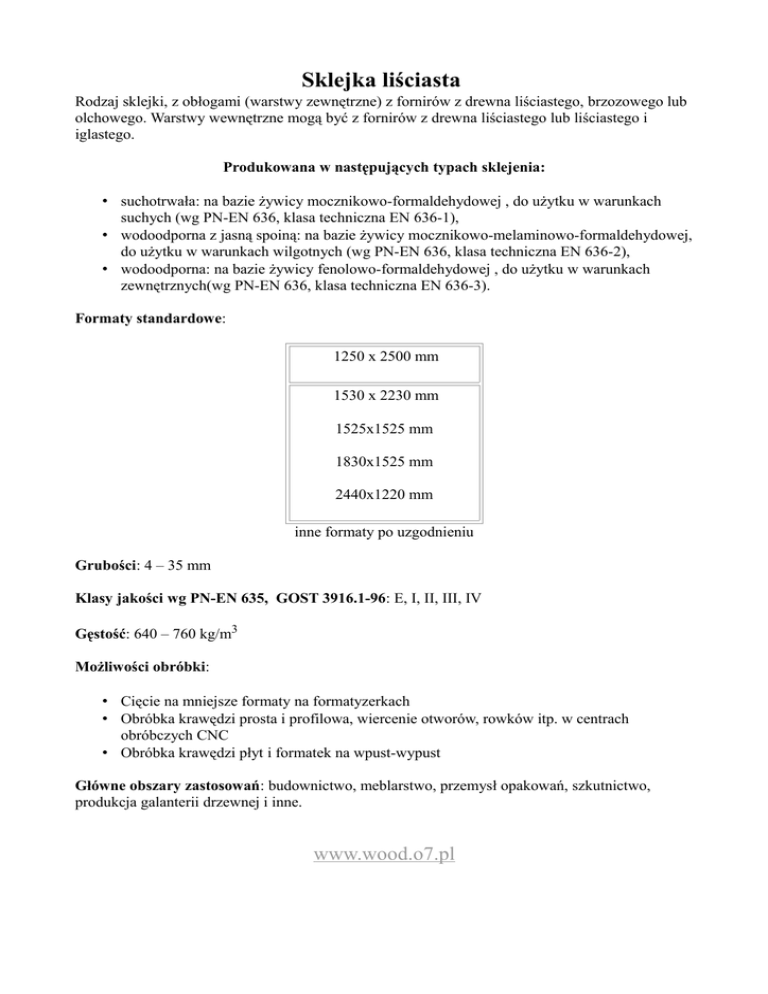 Sklejka liściasta Rodzaj sklejki, z obłogami (warstwy zewnętrzne) z fornirów z drewna liściastego, brzozowego lub olchowego. Warstwy wewnętrzne mogą być z fornirów z drewna liściastego lub liściastego i iglastego. Produkowana w następujących typach sklejenia: • suchotrwała: na bazie żywicy mocznikowo-formaldehydowej , do użytku w warunkach suchych (wg PN-EN 636, klasa techniczna EN 636-1), • wodoodporna z jasną spoiną: na bazie żywicy mocznikowo-melaminowo-formaldehydowej, do użytku w warunkach wilgotnych (wg PN-EN 636, klasa techniczna EN 636-2), • wodoodporna: na bazie żywicy fenolowo-formaldehydowej , do użytku w warunkach zewnętrznych(wg PN-EN 636, klasa techniczna EN 636-3). Formaty standardowe: 1250 x 2500 mm 1530 x 2230 mm 1525x1525 mm 1830x1525 mm 2440x1220 mm inne formaty po uzgodnieniu Grubości: 4 – 35 mm Klasy jakości wg PN-EN 635, GOST 3916.1-96: E, I, II, III, IV Gęstość: 640 – 760 kg/m3 Możliwości obróbki: • Cięcie na mniejsze formaty na formatyzerkach • Obróbka krawędzi prosta i profilowa, wiercenie otworów, rowków itp. w centrach obróbczych CNC • Obróbka krawędzi płyt i formatek na wpust-wypust Główne obszary zastosowań: budownictwo, meblarstwo, przemysł opakowań, szkutnictwo, produkcja galanterii drzewnej i inne. www.wood.o7.pl Sklejka iglasta Rodzaj sklejki z obłogami (warstwy zewnętrzne) z forniru sosnowego lub świerkowego. Warstwy wewnętrzne zbudowane są z forniru iglastego lub liściastego. Produkowana w następujących typach sklejenia: • suchotrwała: na bazie żywicy mocznikowo-formaldehydowej, do użytku w warunkach suchych (wg PN-EN 636, klasa techniczna EN 636-1) • wodoodporna z jasną spoiną: na bazie żywicy mocznikowo-melaminowoformaldehydowej, do użytku w warunkach wilgotnych (wg PN-EN 636, klasa techniczna EN 636-2), • wodoodporna: na bazie żywicy fenolowo-formaldehydowej, do użytku w warunkach zewnętrznych (wg PN-EN 636, klasa techniczna EN 636-3). Formaty standardowe: 2500 x 1250 mm 2230 x 1530 mm inne formaty po uzgodnieniu. Grubości: 4 – 35 mm. Klasy jakości: E, I, II, III, IV wg PN-EN 635 Możliwości obróbki: • Cięcie na mniejsze formaty na formatyzerkach; obróbka krawędzi prosta i profilowa, wiercenie tworów, rowków itp. w centrach obróbczych CNC. • Obróbka krawędzi płyt i formatek na wpust-wypust (min. rozstaw między frezowanymi krawędziami 300 mm, zakres obrabianych grubości 16-30mm). Główne obszary zastosowań: budownictwo, wykończenie wnętrz, meblarstwo, przemysł opakowań, szkutnictwo, produkcja galanterii drzewnej i inne. www.wood.o7.pl Sklejka bukowa Rodzaj sklejki liściastej z obłogami (warstwy zewnętrzne) z fornirów z drewna bukowego. Warstwy wewnętrzne mogą być z fornirów z drewna innego niż bukowe. Produkowana w następujących typach sklejenia: • suchotrwała: na bazie żywicy mocznikowo-formaldehydowej , do użytku w warunkach suchych (wg PN-EN 636, klasa techniczna EN 636-1), • wodoodporna z jasną spoiną: na bazie żywicy mocznikowo-melaminowo-formaldehydowej, do użytku w warunkach wilgotnych (wg PN-EN 636, klasa techniczna EN 636-2), • wodoodporna: na bazie żywicy fenolowo-formaldehydowej , do użytku w warunkach zewnętrznych(wg PN-EN 636, klasa techniczna EN 636-3). Formaty standardowe: 1250 x 1950 mm 1950 x 1250 mm 1250 x 2200 mm inne formaty po uzgodnieniu. 2200 x 1250 mm Grubości: 4 – 35 mm Klasy jakości: E, I, II, III, IV wg PN-EN 635 Gęstość: 720 – 800 kg/m3 Możliwości obróbki: • Cięcie na mniejsze formaty na formatyzerkach • Obróbka krawędzi prosta i profilowa, wiercenie otworów, rowków itp. w centrach obróbczych CNC • Obróbka krawędzi płyt i formatek na wpust-wypust Obszary głównych zastosowań: Sklejka bukowa zdobyła sobie olbrzymią popularność w meblarstwie do wytwarzania mebli z wyższej półki cenowej. Buk nadaje się doskonale do produkcji elementów profilowanych, z których wyrabia się krzesła, fotele i inne elementy o przestrzennych formach. Umożliwia to producentom oferowanie całych kompletów meblowych w pięknym i naturalnym wykończeniu. Z podobnych względów sklejka bukowa jest szeroko wykorzystywana do wykańczania wnętrz, w szkutnictwie oraz do produkcji różnego rodzaju galanterii drzewnej i ozdobnych opakowań. www.wood.o7.pl Sklejka gabonowa Sklejka, w której obłogi (warstwy zewnętrzne) tworzą forniry z drewna egzotycznego o nazwie gabon (okoumè). Warstwy wewnętrzne zbudowane są z fornirów z jednego lub wielu rodzajów drewna rodzimego. Produkowana w następujących typach sklejenia: • suchotrwała: na bazie żywicy mocznikowo-formaldehydowej , do użytku w warunkach suchych (wg PN-EN 636, klasa techniczna EN 636-1), • wodoodporna z jasną spoiną: na bazie żywicy mocznikowo-melaminowo-formaldehydowej, do użytku w warunkach wilgotnych (wg PN-EN 636, klasa techniczna EN 636-2), • wodoodporna: na bazie żywicy fenolowo-formaldehydowej , do użytku w warunkach zewnętrznych(wg PN-EN 636, klasa techniczna EN 636-3). Formaty standardowe: 2500 x 1250 mm inne formaty po uzgodnieniu. Grubość: 4 – 35 mm. Klasy jakości: I i II. Gęstość: 550-700 kg/m3 (uzależniona od rodzaju drewna warstw wewnętrznych sklejki) Możliwości obróbki: • Cięcie na mniejsze formaty na formatyzerkach; • Obróbka krawędzi prosta i profilowa, wiercenie otworów, rowków itp. w centrach obróbczych CNC. Obszar głównych zastosowań: Sklejka gabonowa łączy wysokie właściwości techniczne i dekoracyjne. Jest wykorzystywana, na przykład, na dekoracyjne powierzchnie mebli, do wykańczania wnętrz, w szkutnictwie, na elementy wyposażenia placów zabaw oraz do produkcji różnego rodzaju galanterii drzewnej i ozdobnych opakowań. Sklejka do cięcia laserem Typ sklejki o specjalnie ulepszonej budowie bez żadnych rozsunięć forniru zarówno na powierzchni jak i w rdzeniu materiału (wady takie mogą zakłócić proces cięcia promieniem lasera). Produ