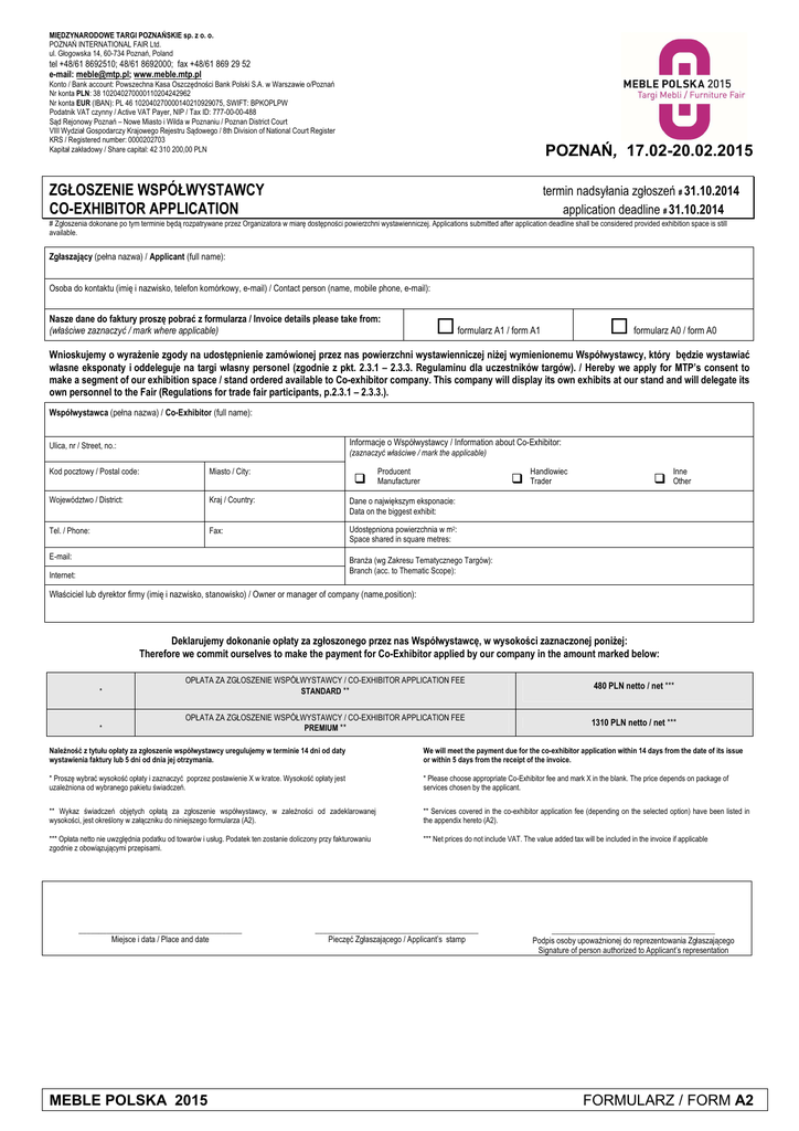 MIĘDZYNARODOWE TARGI POZNAŃSKIE sp. z o. o. POZNAŃ INTERNATIONAL FAIR Ltd. ul. Głogowska 14, 60-734 Poznań, Poland tel +48/61 8692510; 48/61 8692000; fax +48/61 869 29 52 e-mail: [email protected]; www.meble.mtp.pl Konto / Bank account: Powszechna Kasa Oszczędności Bank Polski S.A. w Warszawie o/Poznań Nr konta PLN: 38 102040270000110204242962 Nr konta EUR (IBAN): PL 46 102040270000140210929075, SWIFT: BPKOPLPW Podatnik VAT czynny / Active VAT Payer, NIP / Tax ID: 777-00-00-488 Sąd Rejonowy Poznań – Nowe Miasto i Wilda w Poznaniu / Poznan District Court VIII Wydział Gospodarczy Krajowego Rejestru Sądowego / 8th Division of National Court Register KRS / Registered number: 0000202703 Kapitał zakładowy / Share capital: 42 310 200,00 PLN POZNAŃ, 17.02-20.02.2015 ZGŁOSZENIE WSPÓŁWYSTAWCY CO-EXHIBITOR APPLICATION termin nadsyłania zgłoszeń # 31.10.2014 application deadline # 31.10.2014 # Zgłoszenia dokonane po tym terminie będą rozpatrywane przez Organizatora w miarę dostępności powierzchni wystawienniczej. Applications submitted after application deadline shall be considered provided exhibition space is still available. Zgłaszający (pełna nazwa) / Applicant (full name): Osoba do kontaktu (imię i nazwisko, telefon komórkowy, e-mail) / Contact person (name, mobile phone, e-mail): Nasze dane do faktury proszę pobrać z formularza / Invoice details please take from: (właściwe zaznaczyć / mark where applicable) formularz A1 / form A1 formularz A0 / form A0 Wnioskujemy o wyrażenie zgody na udostępnienie zamówionej przez nas powierzchni wystawienniczej niżej wymienionemu Współwystawcy, który będzie wystawiać własne eksponaty i oddeleguje na targi własny personel (zgodnie z pkt. 2.3.1 – 2.3.3. Regulaminu dla uczestników targów). / Hereby we apply for MTP’s consent to make a segment of our exhibition space / stand ordered available to Co-exhibitor company. This company will display its own exhibits at our stand and will delegate its own personnel to the Fair (Regulations for trade fair participants, p.2.3.1 – 2.3.3.). Współwystawca (pełna nazwa) / Co-Exhibitor (full name): Informacje o Współwystawcy / Information about Co-Exhibitor: Ulica, nr / Street, no.: (zaznaczyć właściwe / mark the applicable) Producent Manufacturer Handlowiec Trader Kod pocztowy / Postal code: Miasto / City: Województwo / District: Kraj / Country: Dane o największym eksponacie: Data on the biggest exhibit: Tel. / Phone: Fax: Udostępniona powierzchnia w m2: Space shared in square metres: E-mail: Inne Other Branża (wg Zakresu Tematycznego Targów): Branch (acc. to Thematic Scope): Internet: Właściciel lub dyrektor firmy (imię i nazwisko, stanowisko) / Owner or manager of company (name,position): Deklarujemy dokonanie opłaty za zgłoszonego przez nas Współwystawcę, w wysokości zaznaczonej poniżej: Therefore we commit ourselves to make the payment for Co-Exhibitor applied by our company in the amount marked below: * OPŁATA ZA ZGŁOSZENIE WSPÓŁWYSTAWCY / CO-EXHIBITOR APPLICATION FEE STANDARD ** 480 PLN netto / net *** * OPŁATA ZA ZGŁOSZENIE WSPÓŁWYSTAWCY / CO-EXHIBITOR APPLICATION FEE PREMIUM ** 1310 PLN netto / net *** Należność z tytułu opłaty za zgłoszenie współwystawcy uregulujemy w terminie 14 dni od daty wystawienia faktury lub 5 dni od dnia jej otrzymania. We will meet the payment due for the co-exhibitor application within 14 days from the date of its issue or within 5 days from the receipt of the invoice. * Proszę wybrać wysokość opłaty i zaznaczyć poprzez postawienie X w kratce. Wysokość opłaty jest uzależniona od wybranego pakietu świadczeń. * Please choose appropriate Co-Exhibitor fee and mark X in the blank. The price depends on package of services chosen by the applicant. ** Wykaz świadczeń objętych opłatą za zgłoszenie współwystawcy, w zależności od zadeklarowanej wysokości, jest określony w załączniku do niniejszego formularza (A2). ** Services covered in the co-exhibitor application fee (depending on the selected option) have been listed in the appendix hereto (A2). *** Opłata netto nie uwzględnia podatku od towarów i usług. Podatek ten zostanie doliczony przy fakturowaniu zgodnie z obowiązującymi przepisami. *** Net prices do not include VAT. The value added tax will be included in the invoice if applicable _________________________________________ Miejsce i data / Place and date MEBLE POLSKA 2015 _________________________________________ Pieczęć Zgłaszającego / Applicant’s stamp _________________________________________ Podpis osoby upoważnionej do reprezentowania Zgłaszającego Signature of person authorized to Applicant’s representation FORMULARZ / FORM A2 MIĘDZYNARODOWE TARGI POZNAŃSKIE sp. z o. o. POZNAŃ INTERNATIONAL FAIR Ltd. ul. Głogowska 14, 60-734 Poznań, Poland tel +48/61 8692510; 48/61 8692000; fax +48/61 869 29 52 e-mail: [email protected]; www.meble.mtp.pl Konto / Bank account: Powszechna Kasa Oszczędności Bank Polski S.A. w Warszawie o/Poznań Nr konta PLN: 38 102040270000110204242962 Nr konta EUR (IBAN): PL 46 102040270000140210929075, SWIFT: BPKOPLPW Podatnik VAT czynny / Active VAT Payer, NIP / Tax ID: 777-00-00-488 Sąd Rejonowy Poznań – Nowe Miasto i Wilda w Poznaniu / Poznan District Court VIII Wydział Gospodarczy Krajowego Rejestru Sądowego / 8th Division of National Court Register KRS / Registered number: 0000202703 Kapitał zakładowy / Share capital: 42 310 200,00 PLN POZNAŃ, 17.02-20.02.2015 OPŁATY ZA ZGŁOSZENIE WSPÓŁWYSTAWCY. PAKIETY ŚWIADCZEŃ. CO-EXHIBITOR APPLICATION FEES. SERVICE PACKAGES Opłata za zgłoszenie każdego współwystawcy jest obowiązkowa. Wyboru opłaty / pakietu świadczeń dokonuje się na formularzu A2. Application fee is obligatory for each co-exhibitor. A relevant fee / service package should be selected in Form A2. 1. OPŁATA ZA ZGŁOSZENIE WSPÓŁWYSTAWCY STANDARD w wysokości 480 PLN netto*: obejmuje koszty man