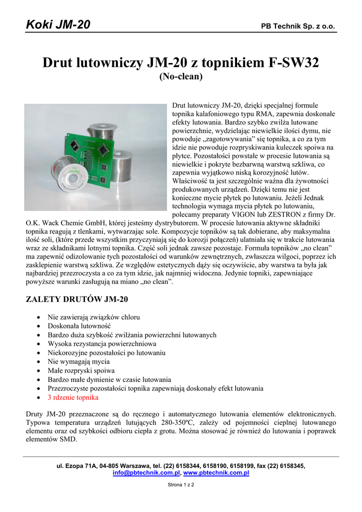 Koki JM-20 PB Technik Sp. z o.o. Drut lutowniczy JM-20 z topnikiem F-SW32 (No-clean) Drut lutowniczy JM-20, dzięki specjalnej formule topnika kalafoniowego typu RMA, zapewnia doskonałe efekty lutowania. Bardzo szybko zwilża lutowane powierzchnie, wydzielając niewielkie ilości dymu, nie powoduje „zagotowywania” się topnika, a co za tym idzie nie powoduje rozpryskiwania kuleczek spoiwa na płytce. Pozostałości powstałe w procesie lutowania są niewielkie i pokryte bezbarwną warstwą szkliwa, co zapewnia wyjątkowo niską korozyjność lutów. Właściwość ta jest szczególnie ważna dla żywotności produkowanych urządzeń. Dzięki temu nie jest konieczne mycie płytek po lutowaniu. Jeżeli Jednak technologia wymaga mycia płytek po lutowaniu, polecamy preparaty VIGON lub ZESTRON z firmy Dr. O.K. Wack Chemie GmbH, której jesteśmy dystrybutorem. W procesie lutowania aktywne składniki topnika reagują z tlenkami, wytwarzając sole. Kompozycje topników są tak dobierane, aby maksymalna ilość soli, (które przede wszystkim przyczyniają się do korozji połączeń) ulatniała się w trakcie lutowania wraz ze składnikami lotnymi topnika. Część soli jednak zawsze pozostaje. Formuła topników „no clean” ma zapewnić odizolowanie tych pozostałości od warunków zewnętrznych, zwłaszcza wilgoci, poprzez ich zasklepienie warstwą szkliwa. Ze względów estetycznych dąży się oczywiście, aby warstwa ta była jak najbardziej przezroczysta a co za tym idzie, jak najmniej widoczna. Jedynie topniki, zapewniające powyższe warunki zasługują na miano „no clean”. ZALETY DRUTÓW JM-20 • • • • • • • • • • Nie zawierają związków chloru Doskonała lutowność Bardzo duża szybkość zwilżania powierzchni lutowanych Wysoka rezystancja powierzchniowa Niekorozyjne pozostałości po lutowaniu Nie wymagają mycia Małe rozpryski spoiwa Bardzo małe dymienie w czasie lutowania Przezroczyste pozostałości topnika zapewniają doskonały efekt lutowania 3 rdzenie topnika Druty JM-20 przeznaczone są do ręcznego i automatycznego lutowania elementów elektronicznych. Typowa temperatura urządzeń lutujących 280-350ºC, zależy od pojemności cieplnej lutowanego elementu oraz od szybkości odbioru ciepła z grotu. Można stosować je również do lutowania i poprawek elementów SMD. ul. Ezopa 71A, 04-805 Warszawa, tel. (22) 6158344, 6158190, 6158199, fax (22) 6158345, [email protected], www.pbtechnik.com.pl Strona 1 z 2 Koki JM-20 PB Technik Sp. z o.o. DANE TECHNICZNE : PARAMETR JM-20 Sn 60, Pb 40 2,2% F-SW32 3 rdzenie 0,0% 90% < 0,5 sek Spełnia 0,5 0,6 0,8 1,0 1,2mm Szpule 500g Szpule 1,0kg Stop Zawartość topnika Typ topnika Wypełnienie topnika Zawartość związków chloru Zdolność rozpływu przy lutowaniu Prędkość zwilżania Odporność na korozję Dostępne średnice drutu Opakowanie dla drutów 0,5 i 0,6mm Opakowanie dla drutów 0,8 1,0 i 1,2mm PRZYKŁADOWE LUTY Drut JM-20 Standardowy drut ul. Ezopa 71A, 04-805 Warszawa, tel. (22) 6158344, 6158190, 6158199, fax (22) 6158345, [email protected], www.pbtechnik.com.pl Strona 2 z 2 Rev. 16.09.03