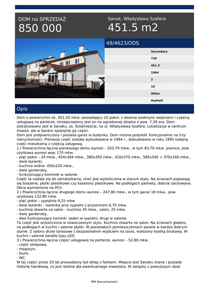 DOM na SPRZEDAŻ 850 000 Sanok, Władysława Szafera 451.5 m2 48/4623/ODS Secondary 739 451.5 1964 2 10 Other Asphalt Opis Dom o powierzchni ok. 451,50 mkw. posiadający 10 pokoi, z dwoma osobnymi wejściami i częścią usługową na parterze. Umiejscowiony jest on na ogrodzonej działce o pow. 7,39 ara. Dom zlokalizowany jest w Sanoku, os. Śródmieście, na ul. Władysława Szafera. Lokalizacja w centrum miasta, ale w bardzo spokojnej jej części. Dom jest podpiwniczony i posiada garaż w budynku. Dom można podzielić funkcjonalnie na trzy nieruchomości. Pierwsza część została wybudowana w 1964 r., dobudowano w roku 1995 kolejną część mieszkalną z częścią usługową. 1.) Powierzchnia łączna pierwszego domu wynosi – 203,70 mkw., w tym 83,70 mkw. piwnice, pow. użytkowa wynosi więc 170 mkw. - pięć pokoi – 24 mkw., 454x384 mkw., 380x350 mkw., 410x370 mkw., 585x340 + 370x160 mkw., - dwie łazienki, - kuchnia widna- 450x220 mkw., - dwie garderoby, - funkcjonujący kominek w salonie. Część ta nadaje się do zamieszkania, choć jest wykończona w starym stylu. Na ścianach pojawiają się boazerie, płytki plastikowe czy kasetony plastikowe. Na podłogach parkiety, dobrze zachowane. Okna wymienione na PCV. 2.) Powierzchnia łączna drugiego domu wynosi – 247,80 mkw., w tym garaż 18 mkw., pow. użytkowa 132,80 mkw. - pięć pokoi – sypialnia 9,25 mkw - dwie łazienki – łazienka przy sypialni z prysznicem 6,75 mkw. - kuchnia otwarta na salon – kuchnia 35 mkw., salon, 25 mkw. - dwie garderoby, - dwa funkcjonujące kominki -jeden w sypialni, drugi w salonie. Ta część jest wykończona w nowoczesnym stylu. Kuchnia otwarta na salon. Na ścianach gładzie, na podłogach w kuchni i salonie płytki. W pozostałych pomieszczeniach panele w bardzo dobrym stanie. Z salonu drzwi tarasowe z bezpośrednim wyjściem na taras, wyłożony kostką brukową. W kuchni i salonie światła typu LED. 3.) Powierzchnia łączna części usługowej na parterze, wynosi – 52,90 mkw. - część sklepowa, - magazyn, - biuro, - WC. W tej części przez 20 lat prowadzony był sklep z farbami. Miejsce jest Sanoku znane i posiada historię handlową, co jest istotne dla ewentualnego inwestora. W związku z powyższym obok MM Nieruchomości budynku zostało przydzielone miejsce do parkowania wyłożone kostką brukową, w celach chociażby zaopatrzeniowych jak również dla Klientów sklepu. Dom ogrzewany piecem gazowym. Gaz doprowadzony do domu. Dom dobrze ocieplony z elewacją. Budynek posiada wiele możliwości dla ewentualnego inwestora. Możliwość zamieszkania dwóch rodzin i prowadzenie działalności usługowej. Dwa osobne wejścia, budynki na nowo można rozdzielić. Idealna inwestycja dla dużej rodziny prowadzącej swój własny biznes, pod rodzinny dom dziecka, dom spokojnej starości czy pod motel dla pracowników. Polecam do obejrzenia na miejscu! Chcesz wziąć kredyt hipoteczny, lub gotówkowy? OFERTA PONAD 40 BANKÓW W JEDNYM MIEJSCU U Nas kupisz nieruchomość i weźmiesz kredyt. ZADZWOŃ JUŻ TERAZ I ZAPYTAJ MNIE O SZCZEGÓŁY! MM Nieruchomości oddział w Sanoku tel. +48 13 492 41 61 +48 881-799-704 ZAPŁACISZ TYLKO WTEDY, KIEDY OKAŻEMY SIĘ SKUTECZNI! MM 360 tel. +48 881 799 704; +48 13 492 41 61 email: [email protected] MM Nieruchomości Powered by TCPDF (www.tcpdf.org)