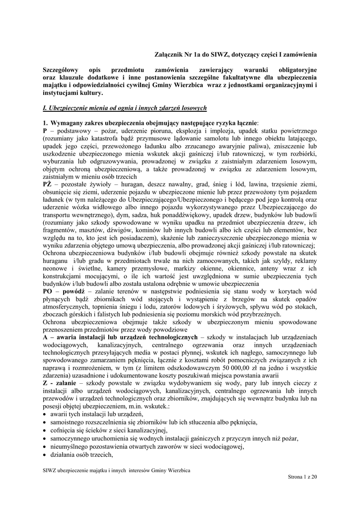 Załącznik Nr 1a do SIWZ, dotyczący części I zamówienia Szczegółowy opis przedmiotu zamówienia zawierający warunki obligatoryjne oraz klauzule dodatkowe i inne postanowienia szczególne fakultatywne dla ubezpieczenia majątku i odpowiedzialności cywilnej Gminy Wierzbica wraz z jednostkami organizacyjnymi i instytucjami kultury. I. Ubezpieczenie mienia od ognia i innych zdarzeń losowych 1. Wymagany zakres ubezpieczenia obejmujący następujące ryzyka łącznie: P – podstawowy – pożar, uderzenie pioruna, eksplozja i implozja, upadek statku powietrznego (rozumiany jako katastrofa bądź przymusowe lądowanie samolotu lub innego obiektu latającego, upadek jego części, przewożonego ładunku albo zrzucanego awaryjnie paliwa), zniszczenie lub uszkodzenie ubezpieczonego mienia wskutek akcji gaśniczej i/lub ratowniczej, w tym rozbiórki, wyburzania lub odgruzowywania, prowadzonej w związku z zaistniałym zdarzeniem losowym, objętym ochroną ubezpieczeniową, a także prowadzonej w związku ze zdarzeniem losowym, zaistniałym w mieniu osób trzecich PŻ – pozostałe żywioły – huragan, deszcz nawalny, grad, śnieg i lód, lawina, trzęsienie ziemi, obsunięcie się ziemi, uderzenie pojazdu w ubezpieczone mienie lub przez przewożony tym pojazdem ładunek (w tym należącego do Ubezpieczającego/Ubezpieczonego i będącego pod jego kontrolą oraz uderzenie wózka widłowego albo innego pojazdu wykorzystywanego przez Ubezpieczającego do transportu wewnętrznego), dym, sadza, huk ponaddźwiękowy, upadek drzew, budynków lub budowli (rozumiany jako szkody spowodowane w wyniku upadku na przedmiot ubezpieczenia drzew, ich fragmentów, masztów, dźwigów, kominów lub innych budowli albo ich części lub elementów, bez względu na to, kto jest ich posiadaczem), skażenie lub zanieczyszczenie ubezpieczonego mienia w wyniku zdarzenia objętego umową ubezpieczenia, albo prowadzonej akcji gaśniczej i/lub ratowniczej; Ochrona ubezpieczeniowa budynków i/lub budowli obejmuje również szkody powstałe na skutek huraganu i/lub gradu w przedmiotach trwale na nich zamocowanych, takich jak szyldy, reklamy neonowe i świetlne, kamery przemysłowe, markizy okienne, okiennice, anteny wraz z ich konstrukcjami mocującymi, o ile ich wartość jest uwzględniona w sumie ubezpieczenia tych budynków i/lub budowli albo została ustalona odrębnie w umowie ubezpieczenia PO – powódź – zalanie terenów w następstwie podniesienia się stanu wody w korytach wód płynących bądź zbiornikach wód stojących i wystąpienie z brzegów na skutek opadów atmosferycznych, topnienia śniegu i lodu, zatorów lodowych i śryżowych, spływu wód po stokach, zboczach górskich i falistych lub podniesienia się poziomu morskich wód przybrzeżnych. Ochrona ubezpieczeniowa obejmuje także szkody w ubezpieczonym mieniu spowodowane przenoszeniem przedmiotów przez wody powodziowe A – awaria instalacji lub urządzeń technologicznych – szkody w instalacjach lub urządzeniach wodociągowych, kanalizacyjnych, centralnego ogrzewania oraz innych urządzeniach technologicznych przesyłających media w postaci płynnej, wskutek ich nagłego, samoczynnego lub spowodowanego zamarzaniem pęknięcia, łącznie z kosztami robót pomocniczych związanych z ich naprawą i rozmrożeniem, w tym (z limitem odszkodowawczym 50 000,00 zł na jedno i wszystkie zdarzenia) uzasadnione i udokumentowane koszty poszukiwań miejsca powstania awarii Z - zalanie – szkody powstałe w związku wydobywaniem się wody, pary lub innych cieczy z instalacji albo urządzeń wodociągowych, kanalizacyjnych, centralnego ogrzewania lub innych przewodów i urządzeń technologicznych oraz zbiorników, znajdujących się wewnątrz budynku lub na posesji objętej ubezpieczeniem, m.in. wskutek.: awarii tych instalacji lub urządzeń, samoistnego rozszczelnienia się zbiorników lub ich stłuczenia albo pęknięcia, cofnięcia się ścieków z sieci kanalizacyjnej, samoczynnego uruchomienia się wodnych instalacji gaśniczych z przyczyn innych niż pożar, nieumyślnego pozostawienia otwartych zaworów w sieci wodociągowej, działania osób trzecich, SIWZ ubezpieczenie majątku i innych interesów Gminy Wierzbica Strona 1 z 20 a także (z limitem odszkodowawczym 50 000,00 zł na jedno i wszystkie zdarzenia) szkody w ubezpieczonym mieniu przez wodę pochodzącą z topnienia śniegu i/lub lodu, pokrywającego dach lub inne elementy budynków lub budowli, jeżeli nieszczelność dachu lub innych elementów powstała wyłącznie w wyniku działania mrozu PE – przepięcia – szkody spowodowane działaniem prądu elektrycznego, w tym również powstałe w wyniku wyładowań atmosferycznych, na skutek niezachowania parametrów prądu tj. przepięcia, wzbudzania się niszczących sił elektromagnetycznych w obwodach elektrycznych odbiorników i instalacjach, zwarcia, uszkodzenia izolacji, nadmiernego wzrostu, obniżenia lub zaniku napięcia, a także wskutek wzrostu natężenia prądu ponad roboczą wartość znamionową (przetężenie) itp. Limit odszkodowawczy na ryzyko przepięcia: 100 000,00 zł we wszystkich jednostkach organizacyjnych łącznie, na każdą jednostkę i na wszystkie jednostki organizacyjne; dotyczy wszystkich grup mienia. System pierwszego ryzyka Ochrona ubezpieczeniowa, do limitu odszkodowawczego 100 000,00 zł na jedno i wszystkie zdarzenia, obowiązuje również wtedy, jeśli do szkody w ubezpieczonym mieniu doszło w momencie, gdy w związku z remontem, naprawą, wypożyczeniem, adaptacją, ekspozycją, koncertem lub imprezą plenerową mienie to czasowo znajdowało się poza miejscem ubezpieczenia, na terytorium RP. Za jedno zdarzenie uważa się wszystkie szkody w wyniku huraganu, gradu, powodzi, deszczu nawalnego, trzęsienia ziemi, obsunięcia się ziemi, lawiny, śniegu i lodu, które powstały z tej samej przyczyny w ciągu 72 godzin, a w wyniku pozostałych ryzyk – dodatkowo w obrębie tego samego miejsca