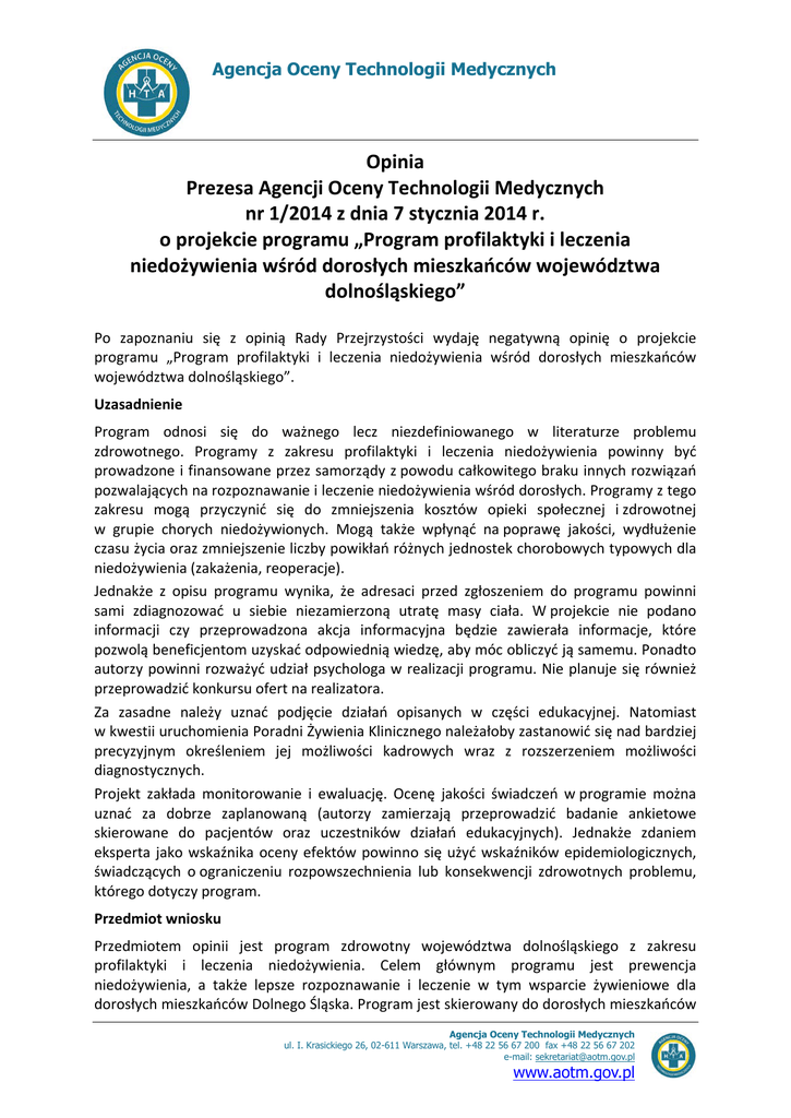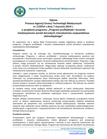 Agencja Oceny Technologii Medycznych Opinia Prezesa Agencji Oceny Technologii Medycznych nr 1/2014 z dnia 7 stycznia 2014 r. o projekcie programu „Program profilaktyki i leczenia niedożywienia wśród dorosłych mieszkańców województwa dolnośląskiego” Po zapoznaniu się z opinią Rady Przejrzystości wydaję negatywną opinię o projekcie programu „Program profilaktyki i leczenia niedożywienia wśród dorosłych mieszkańców województwa dolnośląskiego”. Uzasadnienie Program odnosi się do ważnego lecz niezdefiniowanego w literaturze problemu zdrowotnego. Programy z zakresu profilaktyki i leczenia niedożywienia powinny być prowadzone i finansowane przez samorządy z powodu całkowitego braku innych rozwiązań pozwalających na rozpoznawanie i leczenie niedożywienia wśród dorosłych. Programy z tego zakresu mogą przyczynić się do zmniejszenia kosztów opieki społecznej i zdrowotnej w grupie chorych niedożywionych. Mogą także wpłynąć na poprawę jakości, wydłużenie czasu życia oraz zmniejszenie liczby powikłań różnych jednostek chorobowych typowych dla niedożywienia (zakażenia, reoperacje). Jednakże z opisu programu wynika, że adresaci przed zgłoszeniem do programu powinni sami zdiagnozować u siebie niezamierzoną utratę masy ciała. W projekcie nie podano informacji czy przeprowadzona akcja informacyjna będzie zawierała informacje, które pozwolą beneficjentom uzyskać odpowiednią wiedzę, aby móc obliczyć ją samemu. Ponadto autorzy powinni rozważyć udział psychologa w realizacji programu. Nie planuje się również przeprowadzić konkursu ofert na realizatora. Za zasadne należy uznać podjęcie działań opisanych w części edukacyjnej. Natomiast w kwestii uruchomienia Poradni Żywienia Klinicznego należałoby zastanowić się nad bardziej precyzyjnym określeniem jej możliwości kadrowych wraz z rozszerzeniem możliwości diagnostycznych. Projekt zakłada monitorowanie i ewaluację. Ocenę jakości świadczeń w programie można uznać za dobrze zaplanowaną (autorzy zamierzają przeprowadzić badanie ankietowe skierowane do pacjentów oraz uczestników działań edukacyjnych). Jednakże zdaniem eksperta jako wskaźnika oceny efektów powinno się użyć wskaźników epidemiologicznych, świadczących o ograniczeniu rozpowszechnienia lub konsekwencji zdrowotnych problemu, którego dotyczy program. Przedmiot wniosku Przedmiotem opinii jest program zdrowotny województwa dolnośląskiego z zakresu profilaktyki i leczenia niedożywienia. Celem głównym programu jest prewencja niedożywienia, a także lepsze rozpoznawanie i leczenie w tym wsparcie żywieniowe dla dorosłych mieszkańców Dolnego Śląska. Program jest skierowany do dorosłych mieszkańców Agencja Oceny Technologii Medycznych ul. I. Krasickiego 26, 02-611 Warszawa, tel. +48 22 56 67 200 fax +48 22 56 67 202 e-mail: [email protected] www.aotm.gov.pl Opinia Prezesa AOTM nr 1/2014 z dnia 7 stycznia 2014 r. Dolnego Śląska z niezamierzonym spadkiem masy ciała (co najmniej 10% wyjściowej wagi), niezależnie od przyczyny, którzy mogą jeść w sposób naturalny i nie przebywają w szpitalu. Planuje się, że rocznie do programu będzie się zgłaszać 1000 osób. Planowana liczba przeszkolonych to około 2500 osób w ciągu trzech lat trwania programu. Program ma być realizowany w latach 2013-2015. Planowane koszty całkowite realizacji programu wynoszą 672 000 zł. Problem zdrowotny Światowa Organizacja Zdrowia (WHO) definiuje niedożywienie jako występujący na poziomie komórkowym brak równowagi pomiędzy zapotrzebowaniem na składniki pokarmowe i energię a podażą, której zaspokojenie pozwala na wzrost, podtrzymywanie funkcji życiowych oraz pełnienie określonych funkcji. Niedożywienie u osób chorych przyjmowanych do szpitala najczęściej jest nierozpoznawalne i nieleczone. Prowadzi to do tak zwanego niedożywienia szpitalnego, które obserwuje się u 30% chorych prawidłowo odżywionych. U 70% chorych niedożywionych ulega ono pogłębieniu w ciągu 14 dni pobytu w szpitalu. Szacuje się, że niedożywienie w momencie przyjęcia do szpitala występuje u 35% - 55% przewlekle chorych na choroby nienowotworowe i u 40%-90% chorych na nowotwory. Jest bezpośrednią przyczyną zwiększonej chorobowości, śmiertelności, przedłużonego pobytu w szpitalu i zwiększonych kosztów leczenia. Przyczynia się do zmniejszenia skuteczności leczenia farmakologicznego i operacyjnego, zwiększa częstość powikłań septycznych. Niezamierzona utrata masy ciała występuje u 15-20% osób starszych powyżej 65 roku życia i również jest związana z większą zachorowalnością i śmiertelnością. Alternatywne świadczenia Rozporządzenie Ministra Zdrowia z dnia 15 września 2011 roku zmieniające rozporządzenie w sprawie świadczeń gwarantowanych z zakresu lecznictwa szpitalnego wprowadziło obowiązek oceny stanu odżywienia wszystkich chorych przyjmowanych do szpitali w trybie hospitalizacji i hospitalizacji planowej (z wyjątkiem pacjentów oddziałów ratunkowych) za pomocą kwestionariuszy SGA lub NRS 2002 u dorosłych i na siatkach wzrastania u dzieci i młodzieży. Świadczeniobiorcy, u których stwierdzono na podstawie ww. oceny zwiększone ryzyko związane ze stanem odżywienia, powinni być poddani ocenie żywieniowej. Wnioski z oceny przeprowadzonej przez Agencję Rekomendacje zwracają uwagę na konieczność wczesnego wykrywania i leczenia niedożywienia. Niedożywienie u osób dorosłych rozpoznaje się na podstawie niezamierzonej utraty masy ciała >10% w ciągu 6 miesięcy albo >5% w ciągu 3 miesięcy. Dodatkowym kryterium rozpoznania jest BMI <18,5 kg/m2. Niedożywienie u osób starszych (> 65 roku życia) rozpoznaje się na podstawie niezamierzonej utraty masy ciała >10% w ciągu 6 miesięcy albo >5% w ciągu 3 miesięcy i/lub BMI <20 kg/m2. Celem badania przesiewowego jest wczesne wyodrębnienie chorych niedożywionych lub zagrożonyc