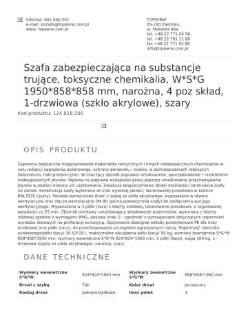 infolinia: 801 000 501 e-mail: [email protected] www: topserw.com.pl TOPSERW 05-220 Zielonka, ul. Marecka 66a tel. +48 22 771 04 56 tel. +48 22 761 11 80 fax +48 22 771 93 80 [email protected] Szafa zabezpieczająca na substancje trujące, toksyczne chemikalia, W*S*G 1950*858*858 mm, narożna, 4 poz skład, 1-drzwiowa (szkło akrylowe), szary Kod produktu: 124.818.200 OPIS PRODUKTU Zapewnia bezpieczne magazynowanie materiałów toksycznych i innych niebezpiecznych chemikaliów w celu redukcji zagrożenia pożarowego, ochrony personelu i mienia, w pomieszczeniach roboczych (laboratoria, hale produkcyjne). W znaczący sposób poprawia oznakowanie, uporządkowanie i rozdzielenie niebezpiecznych płynów. Wpływa na poprawę wydajności pracy poprzez umożliwienie przechowywania płynów w pobliżu miejsca ich użytkowania. Zwiększa bezpieczeństwo dzięki możliwości zamknięcia szafy na zamek. Konstrukcja szafy wykonana ze stali wysokiej jakości, lakierowanej proszkowo w kolorze RAL7035 (szary). Posiada wzmocnione drzwi z szybą ze szkła akrylowego, wyposażone w otwory wentylacyjne oraz złącze wentylacyjne DN 80 (górna powierzchnia szafy) do podłączenia wyciągu wentylacyjnego. Wyposażona w 3 półki (tace) z blachy stalowej, lakierowane proszkowo, o regulowanej wysokości co 25 mm. Zbiornik ociekowy umożliwiający składowanie pojemników, wykonany z blachy stalowej zgodnie z wymogami WHG, posiada znak Ü - zgodność z wymaganiami dotyczącymi odporności wyrobów stalowych na perforację korozyjną. Opcjonalnie dostępne wkłady polietylenowe PE dla misy ociekowej oraz półki (tacy), do przechowywania szczególnie agresywnych cieczy. Pojemność zbiornika ociekowego/półki (tacy) 30 l/3*20 l, maksymalne obciążenia półki (tacy) 50 kg, wymiary zewnętrzne S*G*W 858*858*1950 mm, wymiary wewnętrzne S*G*W 824*824*1903 mm, 3 półki (tace), waga 100 kg, 1drzwiowa (szyba ze szkła akrylowego), narożna, szary. DANE TECHNICZNE Wymiery wewnetrzne S*G*W 824*824*1903 mm Wymiary zewnetrzne S*G*W 858*858*1950 mm Drzwi z szybą Tak Kolor drzwi Jasnoszary Rodzaj drzwi Jednoskrzydłowe Ilość półek 3 Waga 100 kg POWIĄZANE Produkt Szafa zabezpieczająca na substancje trujące, toksyczne chemikalia, W*S*G 1950*858*858 mm, narożna, 4 poz skład, 1-drzwiowa (szkło akrylowe), jasnozielony Szafa zabezpieczająca na substancje trujące, toksyczne chemikalia, W*S*G 1950*858*858 mm, narożna, 4 poz skład, 1-drzwiowa (szkło akrylowe), czerwony Szafa zabezpieczająca na substancje trujące, toksyczne chemikalia, W*S*G 1950*858*858 mm, narożna, 4 poz skład, 1-drzwiowa (szkło akrylowe), zielony Szafa zabezpieczająca na substancje trujące, toksyczne chemikalia, W*S*G 1950*858*858 mm, narożna, 4 poz skład, 1-drzwiowa (szkło akrylowe), żółty Szafa zabezpieczająca na substancje trujące, toksyczne chemikalia, W*S*G 1950*858*858 mm, narożna, 4 poz skład, 1-drzwiowa (szkło akrylowe), niebieski Szafa zabezpieczająca na substancje trujące, toksyczne chemikalia, W*S*G 1950*858*858 mm, narożna, 4 poz skład, 1-drzwiowa (szkło akrylowe), szary