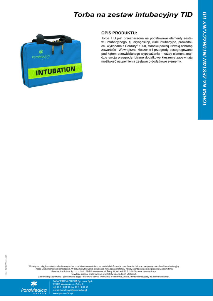 OPIS PRODUKTU: TID: 1213WER.02 Torba TID jest przeznaczona na podstawowe elementy zestawu intubacyjnego, tj. laryngoskop, rurki intubacyjne, prowadnice. Wykonana z Cordury® 1000, stanowi pewną i trwałą ochronę zawartości. Wewnętrzne kieszenie i przegrody posegregowane pod kątem przewidzianego wyposażenia – każdy element znajdzie swoją przegrodę. Liczne dodatkowe kieszenie zapewniają możliwość uzupełnienia zestawu o dodatkowe elementy. W związku z ciągłym udoskonalaniem wyrobów, przedstawione w niniejszym materiale informacje oraz dane techniczne mają wyłącznie charakter orientacyjny i mogą ulec zmianie bez uprzedzenia. W celu zweryfikowania aktualności niniejszego materiału należy skontaktować się z przedstawicielem firmy Paramedica Polska Sp. z o.o. Sp.k. 02-815 Warszawa; ul. Żołny 11; tel: +48 22 313 09 39; www.paramedica.pl Powyższe zdjęcia, znaki firmowe oraz teksty należą do ich właścicieli. Zabrania się kopiowania i publikowania zdjęć i tekstów w całości i/lub części w internecie, prasie, mediach bez zgody na piśmie właścicieli. PARAMEDICA POLSKA Sp. z o.o. Sp.k. 02-815 Warszawa, ul. Żołny 11 tel. 22 313 09 39, fax 22 313 09 59 e-mail: [email protected] www.paramedica.pl TORBA NA ZESTAW INTUBACYJNY TID Torba na zestaw intubacyjny TID