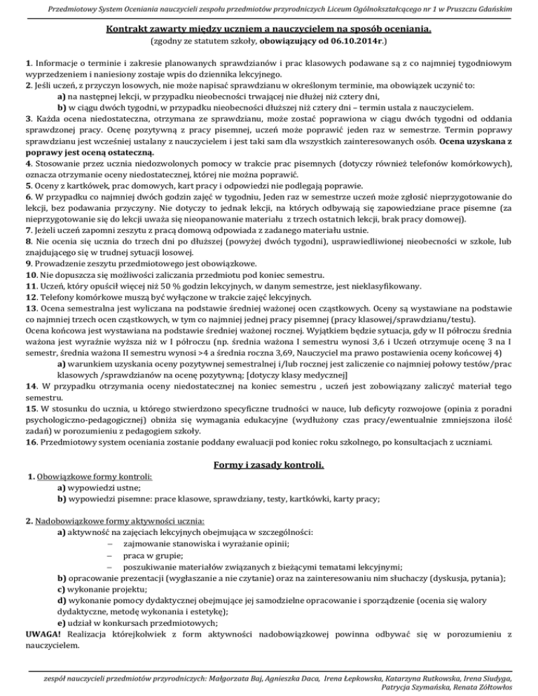 Przedmiotowy System Oceniania nauczycieli zespołu przedmiotów przyrodniczych Liceum Ogólnokształcącego nr 1 w Pruszczu Gdańskim Kontrakt zawarty między uczniem a nauczycielem na sposób oceniania. (zgodny ze statutem szkoły, obowiązujący od 06.10.2014r.) 1. Informacje o terminie i zakresie planowanych sprawdzianów i prac klasowych podawane są z co najmniej tygodniowym wyprzedzeniem i naniesiony zostaje wpis do dziennika lekcyjnego. 2. Jeśli uczeń, z przyczyn losowych, nie może napisać sprawdzianu w określonym terminie, ma obowiązek uczynić to: a) na następnej lekcji, w przypadku nieobecności trwającej nie dłużej niż cztery dni, b) w ciągu dwóch tygodni, w przypadku nieobecności dłuższej niż cztery dni – termin ustala z nauczycielem. 3. Każda ocena niedostateczna, otrzymana ze sprawdzianu, może zostać poprawiona w ciągu dwóch tygodni od oddania sprawdzonej pracy. Ocenę pozytywną z pracy pisemnej, uczeń może poprawić jeden raz w semestrze. Termin poprawy sprawdzianu jest wcześniej ustalany z nauczycielem i jest taki sam dla wszystkich zainteresowanych osób. Ocena uzyskana z poprawy jest oceną ostateczną. 4. Stosowanie przez ucznia niedozwolonych pomocy w trakcie prac pisemnych (dotyczy również telefonów komórkowych), oznacza otrzymanie oceny niedostatecznej, której nie można poprawić. 5. Oceny z kartkówek, prac domowych, kart pracy i odpowiedzi nie podlegają poprawie. 6. W przypadku co najmniej dwóch godzin zajęć w tygodniu, Jeden raz w semestrze uczeń może zgłosić nieprzygotowanie do lekcji, bez podawania przyczyny. Nie dotyczy to jednak lekcji, na których odbywają się zapowiedziane prace pisemne (za nieprzygotowanie się do lekcji uważa się nieopanowanie materiału z trzech ostatnich lekcji, brak pracy domowej). 7. Jeżeli uczeń zapomni zeszytu z pracą domową odpowiada z zadanego materiału ustnie. 8. Nie ocenia się ucznia do trzech dni po dłuższej (powyżej dwóch tygodni), usprawiedliwionej nieobecności w szkole, lub znajdującego się w trudnej sytuacji losowej. 9. Prowadzenie zeszytu przedmiotowego jest obowiązkowe. 10. Nie dopuszcza się możliwości zaliczania przedmiotu pod koniec semestru. 11. Uczeń, który opuścił więcej niż 50 % godzin lekcyjnych, w danym semestrze, jest nieklasyfikowany. 12. Telefony komórkowe muszą być wyłączone w trakcie zajęć lekcyjnych. 13. Ocena semestralna jest wyliczana na podstawie średniej ważonej ocen cząstkowych. Oceny są wystawiane na podstawie co najmniej trzech ocen cząstkowych, w tym co najmniej jednej pracy pisemnej (pracy klasowej/sprawdzianu/testu). Ocena końcowa jest wystawiana na podstawie średniej ważonej rocznej. Wyjątkiem będzie sytuacja, gdy w II półroczu średnia ważona jest wyraźnie wyższa niż w I półroczu (np. średnia ważona I semestru wynosi 3,6 i Uczeń otrzymuje ocenę 3 na I semestr, średnia ważona II semestru wynosi >4 a średnia roczna 3,69, Nauczyciel ma prawo postawienia oceny końcowej 4) a) warunkiem uzyskania oceny pozytywnej semestralnej i/lub rocznej jest zaliczenie co najmniej połowy testów/prac klasowych /sprawdzianów na ocenę pozytywną; [dotyczy klasy medycznej] 14. W przypadku otrzymania oceny niedostatecznej na koniec semestru , uczeń jest zobowiązany zaliczyć materiał tego semestru. 15. W stosunku do ucznia, u którego stwierdzono specyficzne trudności w nauce, lub deficyty rozwojowe (opinia z poradni psychologiczno-pedagogicznej) obniża się wymagania edukacyjne (wydłużony czas pracy/ewentualnie zmniejszona ilość zadań) w porozumieniu z pedagogiem szkoły. 16. Przedmiotowy system oceniania zostanie poddany ewaluacji pod koniec roku szkolnego, po konsultacjach z uczniami. Formy i zasady kontroli. 1. Obowiązkowe formy kontroli: a) wypowiedzi ustne; b) wypowiedzi pisemne: prace klasowe, sprawdziany, testy, kartkówki, karty pracy; 2. Nadobowiązkowe formy aktywności ucznia: a) aktywność na zajęciach lekcyjnych obejmująca w szczególności: zajmowanie stanowiska i wyrażanie opinii; praca w grupie; poszukiwanie materiałów związanych z bieżącymi tematami lekcyjnymi; b) opracowanie prezentacji (wygłaszanie a nie czytanie) oraz na zainteresowaniu nim słuchaczy (dyskusja, pytania); c) wykonanie projektu; d) wykonanie pomocy dydaktycznej obejmujące jej samodzielne opracowanie i sporządzenie (ocenia się walory dydaktyczne, metodę wykonania i estetykę); e) udział w konkursach przedmiotowych; UWAGA! Realizacja którejkolwiek z form aktywności nadobowiązkowej powinna odbywać się w porozumieniu z nauczycielem. zespół nauczycieli przedmiotów przyrodniczych: Małgorzata Baj, Agnieszka Daca, Irena Łepkowska, Katarzyna Rutkowska, Irena Siudyga, Patrycja Szymańska, Renata Zółtowłos Przedmiotowy System Oceniania nauczycieli zespołu przedmiotów przyrodniczych Liceum Ogólnokształcącego nr 1 w Pruszczu Gdańskim Kryteria oceny. 1. Wypowiedzi ustne: oceniane są zgodnie z wymaganiami określonymi w rozkładzie materiału. 2. Wypowiedzi pisemne: a) sprawdziany: kryteria i skalę punktową poszczególnych zadań ustala nauczyciel; b) test: poszczególne pytania ocenia się wg skali: dystraktor wskazany: 1pkt.; wybór nieprawidłowy lub rezygnacja z odpowiedzi: 0pkt. sprawdzian / test / praca klasowa % minimum ocena na ocenę Celujący 96 – 100 bardzo dobry 86 – 95 Dobry 71 – 85 dostateczny 51 – 70 dopuszczający 31 – 50 niedostateczny 0 – 30 Kartkówka ocena celujący bardzo dobry dobry dostateczny dopuszczający niedostateczny % minimum na ocenę 96 - 100 86 – 95 71 – 85 51 – 70 40 – 50 0 – 39 sprawdzian / test / praca klasowa * % minimum ocena na ocenę Celujący 96 – 100 bardzo dobry 86 – 95 Dobry 76 – 85 dostateczny 56 – 75 dopuszczający 41 – 55 niedostateczny 0 – 40 kartkówka* ocena celujący bardzo dobry dobry dostateczny dopuszczający niedostateczny % minimum na ocenę 100 90 – 99 80 – 89 66 – 79 50 – 65 0 – 49 * dotyczy klas I