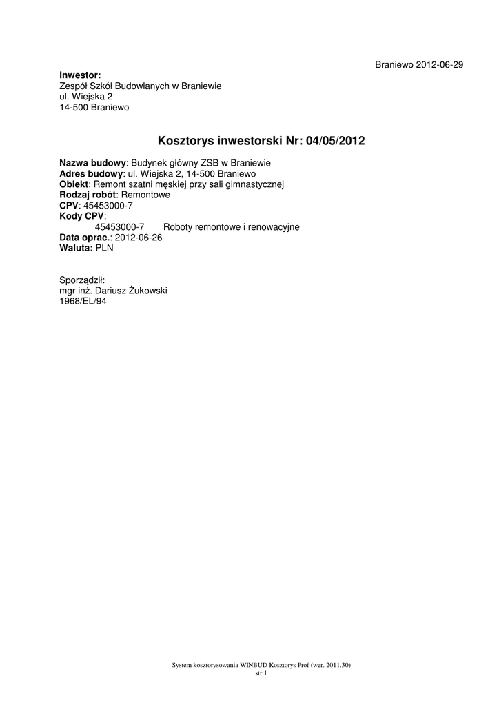 Braniewo 2012-06-29 Inwestor: Zespół Szkół Budowlanych w Braniewie ul. Wiejska 2 14-500 Braniewo Kosztorys inwestorski Nr: 04/05/2012 Nazwa budowy: Budynek główny ZSB w Braniewie Adres budowy: ul. Wiejska 2, 14-500 Braniewo Obiekt: Remont szatni męskiej przy sali gimnastycznej Rodzaj robót: Remontowe CPV: 45453000-7 Kody CPV: 45453000-7 Roboty remontowe i renowacyjne Data oprac.: 2012-06-26 Waluta: PLN Sporządził: mgr inż. Dariusz Żukowski 1968/EL/94 System kosztorysowania WINBUD Kosztorys Prof (wer. 2011.30) str 1 Charakterystyka robót: Roboty polegają na remoncie szatni męskiej w budynku ZSB w Braniewie. 1. Należ rozebrać istniejące ścianki działowe drewniane. 2. Należy rozebrać wykładzinę podłogową z terakoty. 3. Należy wykuć z muru ościeżnice stalową drzwi głównych wejściowych do szatni. 4. Należy przygotować ściany do ułożenia okładziny z glazury. 5. Należy wykonać ścianki działowe z betonu komórkowego gr. 12 cm w miejsce rozebranych ścianek działowych drewnianych, i wykonać obustronny tynk cementowo-wapienny kat. II. 6. Należy wymurować siedziska z betonu komórkowego szer. 38 i wys. 50 cm. 7. Należy wykonać okładzinę ścienną z glazury na całej wysokości ściany w obu szatniach męskich. 8. Należy wykonać posadzkę z terakoty w obu szatniach i przedsionku. 9. Należy wykonać budowę z płyt gipsowo-kartonowych rur w przedsionku na ruszcie metalowym. 10. Należy zamontować drzwi aluminiowe: pełne do obu szatni i częściowo przeszklone do przedsionka. 11. Należy wykonać wymianę grzejników żeliwnych, żeberkowych na grzejniki stalowe 2-płytowe typu Convector o dł. 2000 mm. 12. Należy zamontować 3 oprawy oświetleniowe jarzeniowe 2x36W. System kosztorysowania WINBUD Kosztorys Prof (wer. 2011.30) str 2 Przedmiar robót Obiekt: Rodzaj robót: Adres budowy: Remont szatni męskiej przy sali gimnastycznej Remontowe ul. Wiejska 2, 14-500 Braniewo Lp Secyfikacja . techniczna 1 Podstawa ustalenia Opis robót Jedn. miary Obmiar 3 4 5 2 1. Remont szatni 1 KNR 4-040404-07050 Rozebranie ścianek działowych drewnianych z dwóch warstw desek nie tynkowanych m2 19,74 krotność= 1,00 1. 2,81*2,72-0,7*2,05 2. (2,48+2,77)/2*5,7-0,7*2,05 3. 4. Suma 2 KNR 4-010811-07050 Rozebranie posadzki z płytek na zaprawie cementowej 6,21 13,53 ------------19,74 m2 34,24 krotność= 1,00 1. 5,7*2,95+2,81*4,71+4,65*0,9 3 KNR 4-010354-07020 Wykucie z muru ościeżnic stalowych lub krat okiennych o powierzchni do 2 m2 34,24 szt 1,00 m2 125,78 krotność= 1,00 4 KNR K-0410101050 Oczyszczenie i zmycie podłoża analogia krotność= 1,00 1. (2,48+2,77)/2*5,7+2,95*2,77+4,65*2,77+1,05*2, 75+1,69*2,74+(2,48+2,72+2,48*2,95+2,81*2,48 )*4,71-0,9*2,05*2-0,7*2,05-2,59*0,85*2 5 KNR 2-020121-03050 Ścianki działowe z płytek pianobetonowych lub gazobetonowych,o grubości 12 cm. 125,78 m2 23,52 krotność= 1,00 1. (2,48+2,77)/2*5,7+(2,48+2,72)/2*4,710,9*2,05*2 6 KNR 2-020107-02050 Ściany budynków jednokondygnacyjnych z bloczków z betonu komórkowego,o wysokości 4,5 m i grubości 37 cm. 23,52 m2 9,71 m2 47,04 m2 172,82 krotność= 1,00 1. (5,7+4,57*3)*0,5 7 KNR 2-020803-03050 9,71 Tynki zwykłe III kategorii,ścian i słupów,wykonywane ręcznie. krotność= 1,00 1. 8 Pozycja nr.: 5 *2 KNR 2-020829-06050 47,04 Licowanie ścian płytkami o wymiarach 20x20 cm,na klej metodą zwykłą (B.I.nr 8/96) krotność= 1,00 1. Pozycja nr.: 4 + Pozycja nr.: 5 *2 System kosztorysowania WINBUD Kosztorys Prof (wer. 2011.30) str 3 172,82 9 KNR 2-02U11300201-050 Warstwy wyrównujące i wygładzające z zaprawy samopoziomującej "CERESIT CN 72" grub.5 mm wykonywane w pomieszczeniach o powierzchni ponad 8,0 m2 (Orgbud W-wa) m2 34,24 m2 34,24 m2 34,24 m2 34,24 m2 3,19 m2 1,84 m2 3,69 m2 34,24 krotność= 1,00 1. 10 Pozycja nr.: 2 KNR 2-02U113401-050 34,24 Gruntowanie powierzchni poziomych preparatami gruntującymi "CERESIT CT 17" (Orgbud W-wa) krotność= 1,00 1. 11 Pozycja nr.: 2 34,24 KNR 2 02I1118-09- Posadzki płytkowe z kamieni 050 sztucznych, o wymiarach 30x30 cm układanych na klej metodą kombinowaną krotność= 1,00 12 KNR 2 02I2007-03- Konstrukcje rusztów pod okładziny z 050 płyt gipsowych na stropach z pojedynczych kształtowników metalowych krotność= 1,00 13 KNR 2 02I20060301-050 Okładziny pojedyncze z płyt gipsowokartonowych grubości 12,5 mm na ścianach na gotowym ruszcie krotność= 1,00 1. 0,7*4,56 14 3,19 KNR 00-1910240701-050 Drzwi aluminiowe jednoskrzydłowe obsadzone na dyblach stalowych szklone fabrycznie krotność= 1,00 1. 0,9*2,05 15 1,84 KNR 00-1910240701-050 Drzwi aluminiowe jednoskrzydłowe obsadzone na dyblach stalowych pełne krotność= 1,00 1. 0,9*2,05*2 16 3,69 KNR 4-01I1204-01- Dwukrotne malowanie farbami 050 emulsyjnymi starych tynków wewnętrznych sufitów krotność= 1,00 1. 17 Pozycja nr.: 2 KNR 4-020520-01090 34,24 Demontaż grzejnika żeliwnego członowego o powierzchni ogrzewalnej do 2,5 m2 kpl 2,00 szt 4,00 krotność= 1,00 18 KNR 4-01I0321-02- Obsadzenie siedzisk drewniwnych 020 ławek gr. 40mm i szer. 45 cm krotność= 1,00 System kosztorysowania WINBUD Kosztorys Prof (wer. 2011.30) str 4 19 KNR 2-15W041802-020 Grzejniki stalowe jednopłytowe o wysokości 300-500 mm i długości do 3000 mm szt 2,00 szt 3,00 krotność= 1,00 20 KNR 5-080511-12020 Montaż na gotowym podłożu opraw świetlówkowych z blachy stalowej z kloszem z tworzyw sztucznych lub rasterem metalowym,zawieszanych 2x36 W z podłączeniem - analogia krotność= 1,00 System kosztorysowania WINBUD Kosztorys Prof (wer. 2011.30) str 5 Kosztorys inwestorski szczegółowy Lp. Podstawa wyceny 1 2 Opis pozycji kosztorysowych Jedn. miary Nakłady na jedn. Wsp. zagre g Cena Cena jedn. Obmiar Cc 3 4 5 6 7 8 9 10 r-g 0,440 0,95 0 kg m3 0,160 0,005 1,00 1,00 0 0 m3 0,003 1,00 0 1 Remont szatni 1 KNR 4-04 0404-07-050 Rozebranie ścianek działowych drewnianych z dwóch warstw desek nie tynkowanych Krotność = 1,00 Robocizna: Robocizna łącznie Materiały: Gwoździe budow