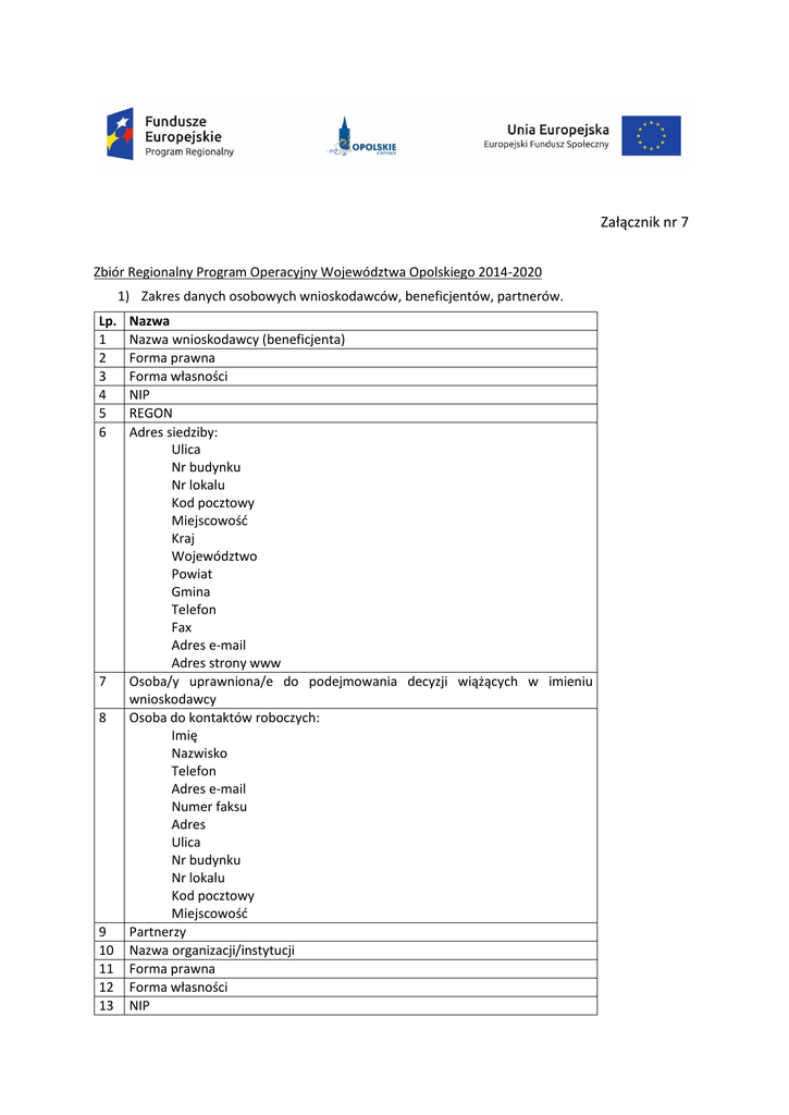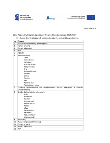 Załącznik nr 7 Zbiór Regionalny Program Operacyjny Województwa Opolskiego 2014-2020 1) Zakres danych osobowych wnioskodawców, beneficjentów, partnerów. Lp. 1 2 3 4 5 6 7 8 9 10 11 12 13 Nazwa Nazwa wnioskodawcy (beneficjenta) Forma prawna Forma własności NIP REGON Adres siedziby: Ulica Nr budynku Nr lokalu Kod pocztowy Miejscowość Kraj Województwo Powiat Gmina Telefon Fax Adres e-mail Adres strony www Osoba/y uprawniona/e do podejmowania decyzji wiążących w imieniu wnioskodawcy Osoba do kontaktów roboczych: Imię Nazwisko Telefon Adres e-mail Numer faksu Adres Ulica Nr budynku Nr lokalu Kod pocztowy Miejscowość Partnerzy Nazwa organizacji/instytucji Forma prawna Forma własności NIP 14 15 16 17 REGON Adres siedziby: Ulica Nr budynku Nr lokalu Kod pocztowy Miejscowość Kraj Województwo Powiat Gmina Telefon Fax Adres e-mail Adres strony www Osoba/y uprawniona/e do podejmowania decyzji wiążących w imieniu partnera Symbol partnera 2) Dane związane z badaniem kwalifikowalności wydatków w projekcie 1 Kwalifikowalność środków w projekcie zgodnie z wytycznymi w zakresie kwalifikowalności wydatków w ramach Europejskiego Funduszu Rozwoju Regionalnego, Europejskiego Funduszu Społecznego oraz Funduszu Spójności na lata 2014-2020 3) Dane uczestników instytucjonalnych (osób fizycznych prowadzących jednoosobową działalność gospodarczą). Szczegółowy zakres danych odwzorowany jest w Wytycznych w zakresie warunków gromadzenia i przekazywania danych w postaci elektronicznej na lata 2014-2020 . Dodatkowo: 1 Przynależność do grupy docelowej zgodnie ze Szczegółowym Opisem Priorytetów Regionalnego Programu Operacyjnego Województwa Opolskiego 2014-2020/zatwierdzonym do realizacji Planem Działania/zatwierdzonym do realizacji wnioskiem o dofinansowanie projektu 4) Dane uczestników indywidualnych. Szczegółowy zakres danych odwzorowany jest w Wytycznych w zakresie warunków gromadzenia i przekazywania danych w postaci elektronicznej na lata 2014-2020. Dodatkowo: 1 Przynależność do grupy docelowej zgodnie ze Szczegółowym Opisem Priorytetów Regionalnego Programu Operacyjnego Województwa Opolskiego 2014-2020/zatwierdzonym do realizacji Planem Działania/zatwierdzonym do realizacji wnioskiem o dofinansowanie projektu 5) Dane pracowników zaangażowanych w przygotowanie i realizację projektów oraz dane pracowników instytucji zaangażowanych we wdrażanie RPO WO 2014-2020, współfinansowanego z EFS, którzy zajmują się obsługą projektów. Lp. 1 2 3 4 5 6 7 8 Nazwa Imię Nazwisko Identyfikator użytkownika Adres e-mail Rodzaj użytkownika Miejsce pracy Telefon Nazwa wnioskodawcy/beneficjenta 6) Dane dotyczące personelu projektu. Szczegółowy zakres danych odwzorowany jest w Wytycznych w zakresie warunków gromadzenia i przekazywania danych w postaci elektronicznej na lata 2014-2020. 7) Uczestnicy szkoleń, konkursów i konferencji (osoby biorące udział w szkoleniach, konkursach i konferencjach w związku z realizacją RPO WO 2014-2020, inne niż uczestnicy w rozumieniu definicji uczestnika określonej w Wytycznych w zakresie monitorowania postępu rzeczowego realizacji programów operacyjnych na lata 2014-2020). Lp. 1 2 3 4 5 6 Nazwa Imię Nazwisko Nazwa instytucji/organizacji Adres e-mail Telefon Specjalne potrzeby Zbiór centralny system teleinformatyczny wspierający realizację programów operacyjnych 1) Użytkownicy Centralnego system teleinformatycznego ze strony beneficjentów/partnerów projektów (osoby uprawnione do podejmowania decyzji wiążących w imieniu beneficjenta/partnera) Lp. 1 2 3 4 5 6 Nazwa Imię Nazwisko Telefon Adres e-mail Kraj PESEL 2) Zakres danych osobowych wnioskodawców, beneficjentów, partnerów. Szczegółowy zakres danych odwzorowany jest w Wytycznych w zakresie warunków gromadzenia i przekazywania danych w postaci elektronicznej na lata 2014-2020. 3) Dane uczestników instytucjonalnych (w tym osób fizycznych prowadzących jednoosobową działalność gospodarczą). Szczegółowy zakres danych odwzorowany jest w Wytycznych w zakresie warunków gromadzenia i przekazywania danych w postaci elektronicznej na lata 2014-2020. 4) Dane uczestników indywidualnych. Szczegółowy zakres danych odwzorowany jest w Wytycznych w zakresie warunków gromadzenia i przekazywania danych w postaci elektronicznej na lata 2014-2020. 5) Dane dotyczące personelu projektu. Szczegółowy zakres danych odwzorowany jest w Wytycznych w zakresie warunków gromadzenia i przekazywania danych w postaci elektronicznej na lata 2014-2020. 6) Wykonawcy realizujący umowy o zamówienia publiczne, których dane przetwarzane będą w związku z badaniem kwalifikowalności środków w projekcie (osoby fizyczne prowadzące działalność gospodarczą). Lp. 1 2 3 Nazwa Nazwa wykonawcy Kraj NIP wykonawcy