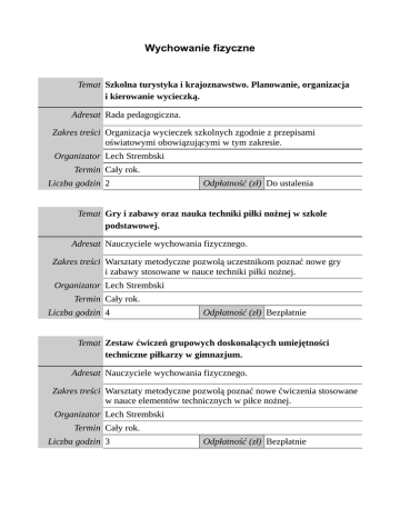 Wychowanie fizyczne Temat Szkolna turystyka i krajoznawstwo. Planowanie, organizacja i kierowanie wycieczką. Adresat Rada pedagogiczna. Zakres treści Organizacja wycieczek szkolnych zgodnie z przepisami oświatowymi obowiązującymi w tym zakresie. Organizator Lech Strembski Termin Cały rok. Liczba godzin 2 Odpłatność (zł) Do ustalenia Temat Gry i zabawy oraz nauka techniki piłki nożnej w szkole podstawowej. Adresat Nauczyciele wychowania fizycznego. Zakres treści Warsztaty metodyczne pozwolą uczestnikom poznać nowe gry i zabawy stosowane w nauce techniki piłki nożnej. Organizator Lech Strembski Termin Cały rok. Liczba godzin 4 Odpłatność (zł) Bezpłatnie Temat Zestaw ćwiczeń grupowych doskonalących umiejętności techniczne piłkarzy w gimnazjum. Adresat Nauczyciele wychowania fizycznego. Zakres treści Warsztaty metodyczne pozwolą poznać nowe ćwiczenia stosowane w nauce elementów technicznych w piłce nożnej. Organizator Lech Strembski Termin Cały rok. Liczba godzin 3 Odpłatność (zł) Bezpłatnie Temat Piłka ręczna w szkole. Adresat Nauczyciele wychowania fizycznego. Zakres treści Warsztaty pozwolą poznać najnowsze metody i formy stosowane w nauczaniu piłki ręcznej w szkole. Organizator Lech Strembski Termin Cały rok. Liczba godzin 3 Odpłatność (zł) Bezpłatnie Temat Piłka siatkowa w szkole. Adresat Nauczyciele wychowania fizycznego. Zakres treści Warsztaty pozwolą poznać najnowsze metody i formy stosowane w nauczaniu piłki siatkowej w szkole. Organizator Lech Strembski Termin Cały rok. Liczba godzin 3 Odpłatność (zł) Bezpłatnie Temat Koszykówka w szkole. Adresat Nauczyciele wychowania fizycznego. Zakres treści Warsztaty pozwolą poznać najnowsze metody i formy stosowane w nauczaniu piłki koszykowej w szkole. Organizator Lech Strembski Termin Cały rok. Liczba godzin 3 Odpłatność (zł) Bezpłatnie Temat Moda na bieganie – zaczynam biegać w szkole. Adresat Nauczyciele wychowania fizycznego. Zakres treści Uczestnicy warsztatów poznają nowe tendencje stosowane w bezpiecznym treningu wytrzymałości tlenowej z użyciem nowoczesnych urządzeń teleinformatycznych. Organizator Lech Strembski Termin Wiosna 2017 r. Liczba godzin 4 Odpłatność (zł) Bezpłatnie Temat Konstruowanie programu nauczania z wychowania fizycznego. Adresat Nauczyciele wychowania fizycznego. Zakres treści Konsultacje pomogą skonstruować własny program nauczania. Organizator Lech Strembski Termin Cały rok. Liczba godzin Odpłatność (zł) Bezpłatnie Temat Edukacja zdrowotna w wychowaniu fizycznym w III i IV etapie edukacyjnym Adresat Nauczyciele wychowania fizycznego. Zakres treści Konsultacje umożliwią realizację edukacji zdrowotnej zgodnie z zaleceniami. Organizator Lech Strembski Termin Cały rok. Liczba godzin Odpłatność (zł) Bezpłatnie Temat Zasady bezpieczeństwa na lekcji wychowania fizycznego. Adresat Nauczyciele wychowania fizycznego. Zakres treści Konsultacje wskażą właściwe przepisy prawa, które obowiązują w czasie zajęć wychowania fizycznego i sportu szkolnego. Organizator Lech Strembski Termin Cały rok. Liczba godzin Odpłatność (zł) Bezpłatnie
