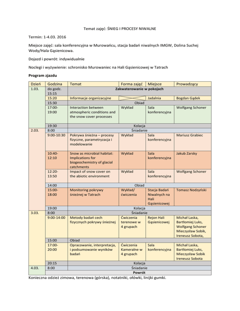 Temat zajęć: ŚNIEG I PROCESY NIWALNE Termin: 1-4.03. 2016 Miejsce zajęć: sala konferencyjna w Murowańcu, stacja badań niwalnych IMGW, Dolina Suchej Wody/Hala Gąsienicowa. Dojazd i powrót: indywidualnie Noclegi i wyżywienie: schronisko Murowaniec na Hali Gąsienicowej w Tatrach Program zjazdu Dzień Godzina 1.03. do godz. 15:15 15:20 15:30 17:0019:00 2.03. 19:30 8:00 9:00-10:30 10:4012:10 3.03. Informacje organizacyjne Interaction between atmospheric conditions and the snow cover processes Pokrywa śnieżna – procesy fizyczne, parametryzacja i modelowanie 14:00 15:0018:00 Monitoring pokrywy śnieżnej w Tatrach 20:15 8:00 Miejsce Prowadzący Jadalnia Bogdan Gądek Sala konferencyjna Wolfgang Schoner Obiad 12:2013:50 19:00 8:00 9:00-14:00 Forma zajęć Zakwaterowanie w pokojach Snow as microbial habitat: Implications for biogeochemistry of glacial catchments Impact of snow cover on the abiotic environment 15:00 17:0020:00 4.03. Temat Metody badań cech fizycznych pokrywy śnieżnej Obiad Opracowanie, interpretacja, i podsumowanie wyników badań Wykład Kolacja Śniadanie Wykład Sala konferencyjna Mariusz Grabiec Wykład Sala konferencyjna Jakub Zarsky Wykład Sala konferencyjna Wolfgang Schoner Obiad Wykład/ Stacja Badań ćwiczenia Niwalnych na Hali Gąsienicowej Kolacja Śniadanie Ćwiczenia Rejon Hali terenowe w Gąsienicowej 4 grupach Ćwiczenia Kameralne w 4 grupach Sala konferencyjna Kolacja Śniadanie Powrót Konieczna odzież zimowa, terenowa (górska), notatniki, ołówki, linijki gumki. Tomasz Nodzyński Michał Laska, Bartłomiej Luks, Wolfgang Schoner Mieczysław Sobik, Ireneusz Sobota, Michał Laska, Bartłomiej Luks, Mieczysław Sobik Ireneusz Sobota