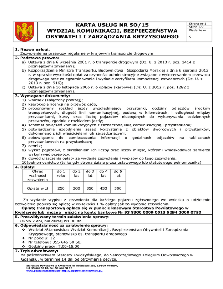 KARTA USŁUG NR SO/15 WYDZIAŁ KOMUNIKACJI, BEZPIECZEŃSTWA OBYWATELI I ZARZĄDZANIA KRYZYSOWEGO Strona nr 1 Stron 1/2 Wydanie nr 5 1. Nazwa usługi: Zezwolenie na przewozy regularne w krajowym transporcie drogowym. 2. Podstawa prawna: a) Ustawa z dnia 6 września 2001 r. o transporcie drogowym (Dz. U. z 2013 r. poz. 1414 z późniejszymi zmianami); b) Rozporządzenie Ministra Transportu, Budownictwa i Gospodarki Morskiej z dnia 6 sierpnia 2013 r. w sprawie wysokości opłat za czynności administracyjne związane z wykonywaniem przewozu drogowego oraz za egzaminowanie i wydanie certyfikatu kompetencji zawodowych (Dz. U. z 2013 r. poz. 916); c) Ustawa z dnia 16 listopada 2006 r. o opłacie skarbowej (Dz. U. z 2012 r. poz. 1282 z późniejszymi zmianami). 3. Wymagane dokumenty: 1) wniosek (załączony poniżej); 2) kserokopia licencji na przewóz osób, 3) proponowany rozkład jazdy uwzględniający przystanki, godziny odjazdów środków transportowych, długość linii komunikacyjnej, podaną w kilometrach, i odległości między przystankami, kursy oraz liczbę pojazdów niezbędnych do wykonywania codziennych przewozów, zgodnie z rozkładem jazdy; 4) schemat połączeń komunikacyjnych z zaznaczoną linią komunikacyjną i przystankami; 5) potwierdzenie uzgodnienia zasad korzystania z obiektów dworcowych i przystanków, dokonanego z ich właścicielami lub zarządzającymi; 6) zobowiązanie do zamieszczania informacji o godzinach odjazdów na tabliczkach przystankowych na przystankach; 7) cennik; 8) wykaz pojazdów, z określeniem ich liczby oraz liczby miejsc, którymi wnioskodawca zamierza wykonywać przewozy, 9) dowód uiszczenia opłaty za wydanie zezwolenia i wypisów do tego zezwolenia, 10) pełnomocnictwo (tylko gdy strona działa przez ustawowego lub statutowego pełnomocnika). 4. Opłaty: do 1 do 2 do 3 do 4 do 5 Okres ważności roku lat lat lat lat zezwolenia Opłata w zł 250 300 350 450 500 Za wydanie wypisu z zezwolenia dla każdego pojazdu zgłoszonego we wniosku o udzielenie zezwolenia pobiera się opłatę w wysokości 1 % opłaty jak za wydanie zezwolenia. Opłatę transportową opłaca się w punkcie kasowym Starostwa Powiatowego w Kwidzynie lub można uiścić na konto bankowe Nr 53 8300 0009 0013 5294 2000 0750 5. Przewidywany termin załatwienia sprawy: Około 7 dni, nie dłużej niż 30 dni 6. Odpowiedzialność za załatwienie sprawy: Wydział /Stanowiska: Wydział Komunikacji, Bezpieczeństwa Obywateli i Zarządzania Kryzysowego, stanowisko ds. transportu drogowego Nr pokoju: 12 Nr telefonu: 055 646 50 58, Godziny pracy: 7.00-15.00 7. Tryb odwoławczy: za pośrednictwem Starosty Kwidzyńskiego, do Samorządowego Kolegium Odwoławczego w Gdańsku, w terminie 14 dni od otrzymania decyzji. Starostwo Powiatowe w Kwidzynie, ul. Kościuszki 29b, 82-500 Kwidzyn, tel. 55 646 50 00, fax. 55 646 50 02 www.powiatkwidzynski.pl; http://bip.powiatkwidzynski.pl/ KARTA USŁUG NR SO/15 WYDZIAŁ KOMUNIKACJI, BEZPIECZEŃSTWA OBYWATELI I ZARZĄDZANIA KRYZYSOWEGO Strona nr 2 Stron 2/2 Wydanie nr 5 8. Uwagi: Pełnomocnictwo podlega opłacie skarbowej w wysokości 17 zł, która jest wpłacana na konto Urzędu Miejskiego w Kwidzynie lub na konto bankowe Nr 66 8300 0009 0008 2107 2000 0020. Z powyżej opłaty zwolnione są: małżonek, krewny wstępny, krewny zstępny, rodzeństwo. Do wglądu dowody osobiste. 9. Miejsce na notatki: Starostwo Powiatowe w Kwidzynie, ul. Kościuszki 29b, 82-500 Kwidzyn, tel. 55 646 50 00, fax. 55 646 50 02 www.powiatkwidzynski.pl; http://bip.powiatkwidzynski.pl/ Numer sprawy SO.III.7252…..201.. WNIOSEK o wydanie zezwolenia na wykonywanie regularnych przewozów osób w krajowym transporcie drogowym ................................................................... ................................................................................... (miejscowość, data) ................................................................... (oznaczenie przedsiębiorcy – nazwa) ................................................................... Starostwo Powiatowe ................................................................... (siedziba przedsiębiorcy – adres) w Kwidzynie ................................................................... (numer identyfikacji podatkowej (NIP)) ................................................................... (numer w rejestrze przedsiębiorców) ……………………………………………………………….…………. (numer telefonu) Proszę o wydanie zezwolenia na regularny przewóz osób w krajowym transporcie drogowym w ramach linii regularnej: …………………………….……..……………….. Na okres …………………… Autobus - Sztuk …… Do wniosku dołączam: 1. 2. 3. 4. 5. 6. 7. 8. kserokopię licencji, wykaz pojazdów samochodowych wraz z dowodami rejestracyjnymi, schemat połączeń komunikacyjnych z zaznaczoną linią komunikacyjną i przystankami, potwierdzenie uzgodnienia zasad korzystania z przystanków, dokonanego z ich właścicielami lub zarządzającymi, zobowiązanie do zamieszczenia informacji o godzinach odjazdów, proponowany rozkład jazdy uwzględniający przystanki, godziny odjazdów, długość linii komunikacyjnej, podanej w kilometrach, i odległości między przystankami, kursy oraz liczbę pojazdów niezbędnych do wykonywania codziennych przewozów, zgodnie z rozkładem jazdy, cennik, dowód wpłaty za wydanie zaświadczenia. ................................................................... ............................................................................................ (data, pieczęć i podpis przyjmującego wniosek) (czytelny podpis wnioskodawcy – pełnym imieniem i nazwiskiem) 3/P/U18/wydanie3/16.08.13 Starostwo Powiatowe w Kwidzynie, ul. Kościuszki 29b, 82-500 Kwidzyn, tel. 55 646 50 00, fax. 55 646 50 02 www.powiatkwidzynski.pl; http://bip.powiatkwidzynski.pl/ KARTA USŁUG NR SO/15 WYDZIAŁ KOMUNIKACJI, BEZPIECZEŃSTWA OBYW