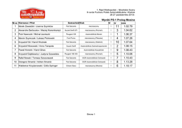 1. Rajd Wielkopolski – Mosińskie Szutry 9 runda Pucharu Polski Automobilklubów i Klubów 26-27 października 2013r. Wyniki PS-1 Prolog Mosina M-ce Kierowca / Pilot 1 Marek Zawadzki / Joanna Szymków 2 Alexandre Barboukov / Maciej Kieremkampt 3 Piotr Nawrocki / Michał Jacniacki 4 Marcin Szymczak / Łukasz Piotrowski 5 Samochód Klub kl nr Fiat Seicento niezrzeszony 1 Suzuki Swift GTi niezrzeszony (Poznań) 1 Peugeot 106 Automobilklub Morski 1 Ford Puma niezrzeszony (Pleszew) 1 Krzysztof Gil / Kamil Woźniak Fiat Seicento niezrzeszony (Gdańsk) 1 6 Krzysztof Kłosowski / Anna Tarapata Suzuki Swift Automobilklub Zachodniopomorski 1 7 Paweł Horanin / Karol Gliwa Fiat Seicento Automobilklub Koszaliński 1 8 Krzysztof Dąbkiewicz / Justyna Szawelska Peugeot 106 XSI niezrzeszony (Poznań) 1 9 Rafał Nowak / Tomasz Szczuraszek Fiat Seicento OGR Automobilklub Ostrowski 1 10 Grzegorz Smardz / Adrian Smardz Fiat Seicento OGR Automobilklub Ostrowski 1 11 Waldemar Krzyżanowski / Zofia Springer Citroen Saxo niezrzeszony (Mosina) 1 Strona 1 11 3 1 4 10 2 9 5 7 8 6 czas 1.02.79 1.04.62 1.06.37 1.07.26 1.07.64 1.08.15 1.08.43 1.10.06 1.10.43 1.13.28 1.18.17