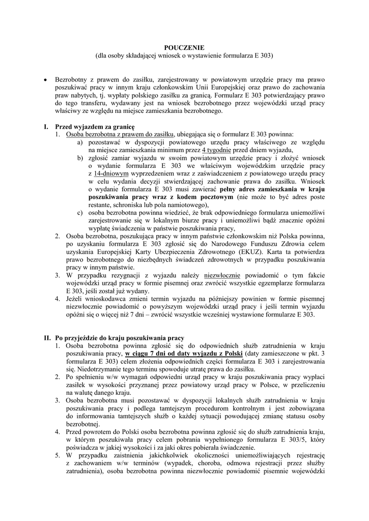 POUCZENIE (dla osoby składającej wniosek o wystawienie formularza E 303) Bezrobotny z prawem do zasiłku, zarejestrowany w powiatowym urzędzie pracy ma prawo poszukiwać pracy w innym kraju członkowskim Unii Europejskiej oraz prawo do zachowania praw nabytych, tj. wypłaty polskiego zasiłku za granicą. Formularz E 303 potwierdzający prawo do tego transferu, wydawany jest na wniosek bezrobotnego przez wojewódzki urząd pracy właściwy ze względu na miejsce zamieszkania bezrobotnego. I. Przed wyjazdem za granicę 1. Osoba bezrobotna z prawem do zasiłku, ubiegająca się o formularz E 303 powinna: a) pozostawać w dyspozycji powiatowego urzędu pracy właściwego ze względu na miejsce zamieszkania minimum przez 4 tygodnie przed dniem wyjazdu, b) zgłosić zamiar wyjazdu w swoim powiatowym urzędzie pracy i złożyć wniosek o wydanie formularza E 303 we właściwym wojewódzkim urzędzie pracy z 14-dniowym wyprzedzeniem wraz z zaświadczeniem z powiatowego urzędu pracy w celu wydania decyzji stwierdzającej zachowanie prawa do zasiłku. Wniosek o wydanie formularza E 303 musi zawierać pełny adres zamieszkania w kraju poszukiwania pracy wraz z kodem pocztowym (nie może to być adres poste restante, schroniska lub pola namiotowego), c) osoba bezrobotna powinna wiedzieć, że brak odpowiedniego formularza uniemożliwi zarejestrowanie się w lokalnym biurze pracy i uniemożliwi bądź znacznie opóźni wypłatę świadczenia w państwie poszukiwania pracy, 2. Osoba bezrobotna, poszukująca pracy w innym państwie członkowskim niż Polska powinna, po uzyskaniu formularza E 303 zgłosić się do Narodowego Funduszu Zdrowia celem uzyskania Europejskiej Karty Ubezpieczenia Zdrowotnego (EKUZ). Karta ta potwierdza prawo bezrobotnego do niezbędnych świadczeń zdrowotnych w przypadku poszukiwania pracy w innym państwie. 3. W przypadku rezygnacji z wyjazdu należy niezwłocznie powiadomić o tym fakcie wojewódzki urząd pracy w formie pisemnej oraz zwrócić wszystkie egzemplarze formularza E 303, jeśli został już wydany. 4. Jeżeli wnioskodawca zmieni termin wyjazdu na późniejszy powinien w formie pisemnej niezwłocznie powiadomić o powyższym wojewódzki urząd pracy i jeśli termin wyjazdu opóźni się o więcej niż 7 dni – zwrócić wszystkie wcześniej wystawione formularze E 303. II. Po przyjeździe do kraju poszukiwania pracy 1. Osoba bezrobotna powinna zgłosić się do odpowiednich służb zatrudnienia w kraju poszukiwania pracy, w ciągu 7 dni od daty wyjazdu z Polski (daty zamieszczone w pkt. 3 formularza E 303) celem złożenia odpowiednich części formularza E 303 i zarejestrowania się. Niedotrzymanie tego terminu spowoduje utratę prawa do zasiłku. 2. Po spełnieniu w/w wymagań odpowiedni urząd pracy w kraju poszukiwania pracy wypłaci zasiłek w wysokości przyznanej przez powiatowy urząd pracy w Polsce, w przeliczeniu na walutę danego kraju. 3. Osoba bezrobotna musi pozostawać w dyspozycji lokalnych służb zatrudnienia w kraju poszukiwania pracy i podlega tamtejszym procedurom kontrolnym i jest zobowiązana do informowania tamtejszych służb o każdej sytuacji powodującej zmianę statusu osoby bezrobotnej. 4. Przed powrotem do Polski osoba bezrobotna powinna zgłosić się do służb zatrudnienia kraju, w którym poszukiwała pracy celem pobrania wypełnionego formularza E 303/5, który poświadcza w jakiej wysokości i za jaki okres pobierała świadczenie. 5. W przypadku zaistnienia jakichkolwiek okoliczności uniemożliwiających rejestrację z zachowaniem w/w terminów (wypadek, choroba, odmowa rejestracji przez służby zatrudnienia), osoba bezrobotna powinna niezwłocznie powiadomić pisemnie wojewódzki urząd pracy o zaistniałych okolicznościach i powrócić do Polski w terminie nie przekraczającym 30 dni od dnia wyjazdu. W przeciwnym razie utraci prawo do zasiłku dla bezrobotnych zgodnie z art. 75 ust. 3 ustawy z dnia 20 kwietnia 2004 r. o promocji zatrudnienia i instytucjach rynku pracy (Dz. U. z 2004 r. Nr 99, poz. 1001 z późn. zm.) Jeśli powróci do kraju najpóźniej w 29-tym dniu licząc od dnia wyjazdu z Polski, zachowa status osoby bezrobotnej i prawo do zasiłku – zasiłek nie będzie przysługiwał tylko za okres, w którym bezrobotny przebywał za granicą. 6. W przypadku podjęcia pracy przed zarejestrowaniem się w odpowiednich służbach zatrudnienia kraju poszukiwania pracy w w/w terminie, osoba bezrobotna zobowiązana jest w ciągu 7 dni od zdarzenia powiadomić pisemnie o tym fakcie wojewódzki urząd pracy oraz zwrócić wszystkie wydane jej formularze E 303. 7. W przypadku, gdy transfer zasiłku dla bezrobotnych został zrealizowany tylko za część okresu transferowego, w celu kontynuacji zasiłku bezrobotny powinien zgłosić się do powiatowego urzędu pracy niezwłocznie po tym, jak przestał pozostawać w dyspozycji służb zatrudnienia państwa poszukiwania pracy. Powyższe oznacza, że okres, w którym bezrobotny przestał pozostawać w dyspozycji służb zatrudnienia państwa poszukiwania pracy do chwili stawienia się w PUP nie powinien być dłuższy niż przeciętny czas niezbędny do przemieszczenia się z państwa poszukiwania pracy do właściwego powiatowego urzędu pracy. III. Po powrocie do kraju 1. Bezrobotny, który pobierał transferowany zasiłek dla bezrobotnych i poszukiwał pracy w innym państwie członkowskim i powrócił do Polski, zachowuje prawo do kontynuowania wypłaty zasiłku na podstawie polskiego ustawodawstwa ( o ile nie wykorzystał już całego okresu zasiłkowego), gdy: a) zgłosi się w powiatowym urzędzie pracy przed upływem 3 miesięcy (maksymalny okres na jaki przyznano prawo do transferu zasiłku). Jeśli ostatnim dniem tego okresu jest sobota, dzień świąteczny lub inny dzień, w którym powiatowy urząd pracy jest nieczynny, bezrobotny ma prawo zgłosić się w pierwszym dniu roboczym po nim następującym (data określona w pkt. 4 formularza E 303), b) przedst