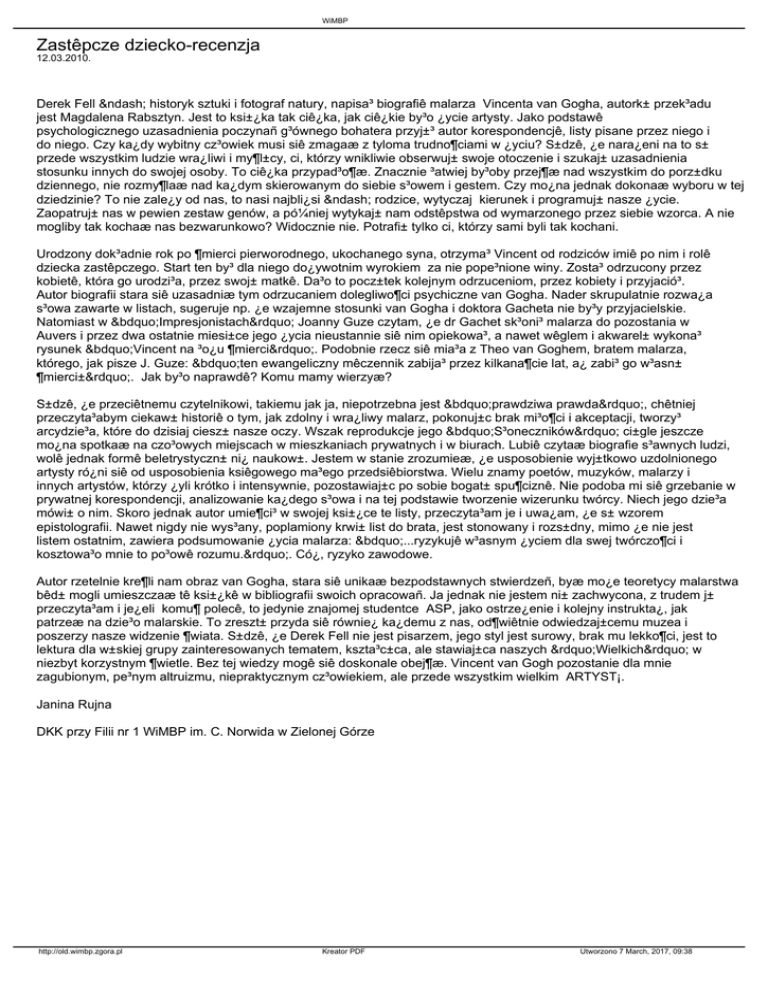 WiMBP Zastêpcze dziecko-recenzja 12.03.2010. Derek Fell – historyk sztuki i fotograf natury, napisa³ biografiê malarza Vincenta van Gogha, autork± przek³adu jest Magdalena Rabsztyn. Jest to ksi±¿ka tak ciê¿ka, jak ciê¿kie by³o ¿ycie artysty. Jako podstawê psychologicznego uzasadnienia poczynañ g³ównego bohatera przyj±³ autor korespondencjê, listy pisane przez niego i do niego. Czy ka¿dy wybitny cz³owiek musi siê zmagaæ z tyloma trudno¶ciami w ¿yciu? S±dzê, ¿e nara¿eni na to s± przede wszystkim ludzie wra¿liwi i my¶l±cy, ci, którzy wnikliwie obserwuj± swoje otoczenie i szukaj± uzasadnienia stosunku innych do swojej osoby. To ciê¿ka przypad³o¶æ. Znacznie ³atwiej by³oby przej¶æ nad wszystkim do porz±dku dziennego, nie rozmy¶laæ nad ka¿dym skierowanym do siebie s³owem i gestem. Czy mo¿na jednak dokonaæ wyboru w tej dziedzinie? To nie zale¿y od nas, to nasi najbli¿si – rodzice, wytyczaj kierunek i programuj± nasze ¿ycie. Zaopatruj± nas w pewien zestaw genów, a pó¼niej wytykaj± nam odstêpstwa od wymarzonego przez siebie wzorca. A nie mogliby tak kochaæ nas bezwarunkowo? Widocznie nie. Potrafi± tylko ci, którzy sami byli tak kochani. Urodzony dok³adnie rok po ¶mierci pierworodnego, ukochanego syna, otrzyma³ Vincent od rodziców imiê po nim i rolê dziecka zastêpczego. Start ten by³ dla niego do¿ywotnim wyrokiem za nie pope³nione winy. Zosta³ odrzucony przez kobietê, która go urodzi³a, przez swoj± matkê. Da³o to pocz±tek kolejnym odrzuceniom, przez kobiety i przyjació³. Autor biografii stara siê uzasadniæ tym odrzucaniem dolegliwo¶ci psychiczne van Gogha. Nader skrupulatnie rozwa¿a s³owa zawarte w listach, sugeruje np. ¿e wzajemne stosunki van Gogha i doktora Gacheta nie by³y przyjacielskie. Natomiast w „Impresjonistach” Joanny Guze czytam, ¿e dr Gachet sk³oni³ malarza do pozostania w Auvers i przez dwa ostatnie miesi±ce jego ¿ycia nieustannie siê nim opiekowa³, a nawet wêglem i akwarel± wykona³ rysunek „Vincent na ³o¿u ¶mierci”. Podobnie rzecz siê mia³a z Theo van Goghem, bratem malarza, którego, jak pisze J. Guze: „ten ewangeliczny mêczennik zabija³ przez kilkana¶cie lat, a¿ zabi³ go w³asn± ¶mierci±”. Jak by³o naprawdê? Komu mamy wierzyæ? S±dzê, ¿e przeciêtnemu czytelnikowi, takiemu jak ja, niepotrzebna jest „prawdziwa prawda”, chêtniej przeczyta³abym ciekaw± historiê o tym, jak zdolny i wra¿liwy malarz, pokonuj±c brak mi³o¶ci i akceptacji, tworzy³ arcydzie³a, które do dzisiaj ciesz± nasze oczy. Wszak reprodukcje jego „S³oneczników” ci±gle jeszcze mo¿na spotkaæ na czo³owych miejscach w mieszkaniach prywatnych i w biurach. Lubiê czytaæ biografie s³awnych ludzi, wolê jednak formê beletrystyczn± ni¿ naukow±. Jestem w stanie zrozumieæ, ¿e usposobienie wyj±tkowo uzdolnionego artysty ró¿ni siê od usposobienia ksiêgowego ma³ego przedsiêbiorstwa. Wielu znamy poetów, muzyków, malarzy i innych artystów, którzy ¿yli krótko i intensywnie, pozostawiaj±c po sobie bogat± spu¶ciznê. Nie podoba mi siê grzebanie w prywatnej korespondencji, analizowanie ka¿dego s³owa i na tej podstawie tworzenie wizerunku twórcy. Niech jego dzie³a mówi± o nim. Skoro jednak autor umie¶ci³ w swojej ksi±¿ce te listy, przeczyta³am je i uwa¿am, ¿e s± wzorem epistolografii. Nawet nigdy nie wys³any, poplamiony krwi± list do brata, jest stonowany i rozs±dny, mimo ¿e nie jest listem ostatnim, zawiera podsumowanie ¿ycia malarza: „...ryzykujê w³asnym ¿yciem dla swej twórczo¶ci i kosztowa³o mnie to po³owê rozumu.”. Có¿, ryzyko zawodowe. Autor rzetelnie kre¶li nam obraz van Gogha, stara siê unikaæ bezpodstawnych stwierdzeñ, byæ mo¿e teoretycy malarstwa bêd± mogli umieszczaæ tê ksi±¿kê w bibliografii swoich opracowañ. Ja jednak nie jestem ni± zachwycona, z trudem j± przeczyta³am i je¿eli komu¶ polecê, to jedynie znajomej studentce ASP, jako ostrze¿enie i kolejny instrukta¿, jak patrzeæ na dzie³o malarskie. To zreszt± przyda siê równie¿ ka¿demu z nas, od¶wiêtnie odwiedzaj±cemu muzea i poszerzy nasze widzenie ¶wiata. S±dzê, ¿e Derek Fell nie jest pisarzem, jego styl jest surowy, brak mu lekko¶ci, jest to lektura dla w±skiej grupy zainteresowanych tematem, kszta³c±ca, ale stawiaj±ca naszych ”Wielkich” w niezbyt korzystnym ¶wietle. Bez tej wiedzy mogê siê doskonale obej¶æ. Vincent van Gogh pozostanie dla mnie zagubionym, pe³nym altruizmu, niepraktycznym cz³owiekiem, ale przede wszystkim wielkim ARTYST¡. Janina Rujna DKK przy Filii nr 1 WiMBP im. C. Norwida w Zielonej Górze http://old.wimbp.zgora.pl Kreator PDF Utworzono 7 March, 2017, 09:38