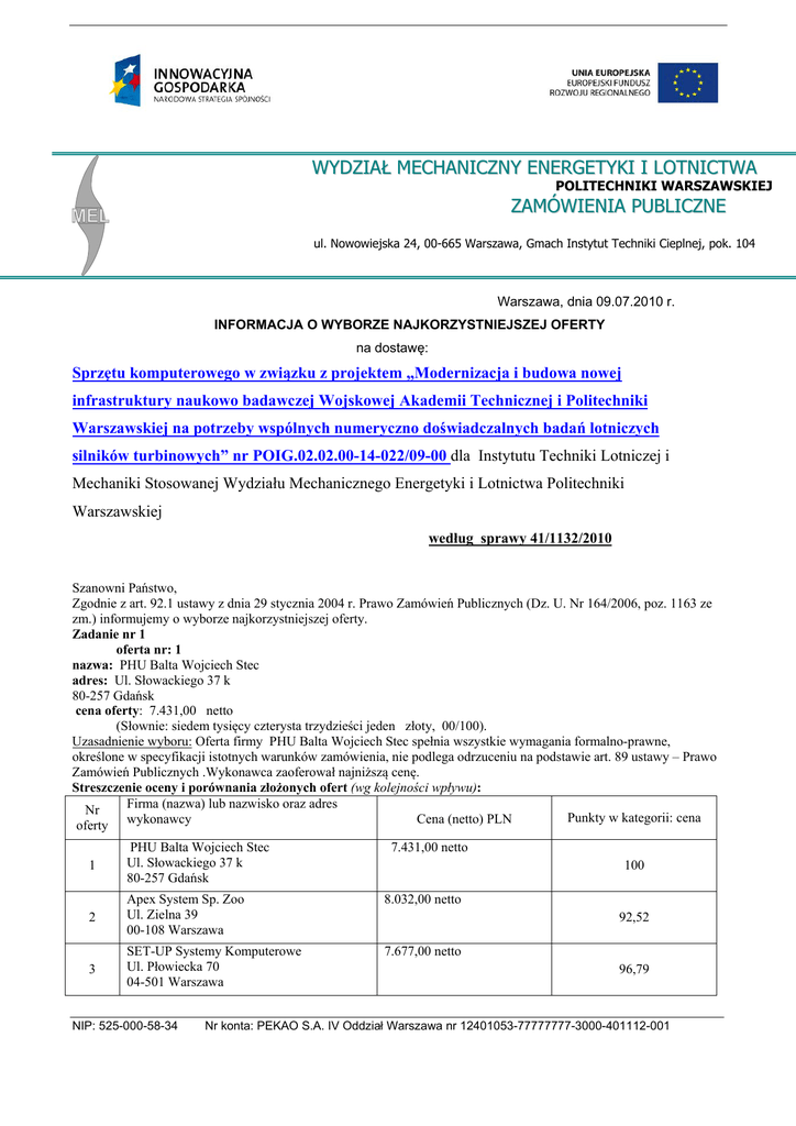 WYDZIAŁ MECHANICZNY ENERGETYKI I LOTNICTWA POLITECHNIKI WARSZAWSKIEJ ZAMÓWIENIA PUBLICZNE ul. Nowowiejska 24, 00-665 Warszawa, Gmach Instytut Techniki Cieplnej, pok. 104 Warszawa, dnia 09.07.2010 r. INFORMACJA O WYBORZE NAJKORZYSTNIEJSZEJ OFERTY na dostawę: Sprzętu komputerowego w związku z projektem „Modernizacja i budowa nowej infrastruktury naukowo badawczej Wojskowej Akademii Technicznej i Politechniki Warszawskiej na potrzeby wspólnych numeryczno doświadczalnych badań lotniczych silników turbinowych” nr POIG.02.02.00-14-022/09-00 dla Instytutu Techniki Lotniczej i Mechaniki Stosowanej Wydziału Mechanicznego Energetyki i Lotnictwa Politechniki Warszawskiej według sprawy 41/1132/2010 Szanowni Państwo, Zgodnie z art. 92.1 ustawy z dnia 29 stycznia 2004 r. Prawo Zamówień Publicznych (Dz. U. Nr 164/2006, poz. 1163 ze zm.) informujemy o wyborze najkorzystniejszej oferty. Zadanie nr 1 oferta nr: 1 nazwa: PHU Balta Wojciech Stec adres: Ul. Słowackiego 37 k 80-257 Gdańsk cena oferty: 7.431,00 netto (Słownie: siedem tysięcy czterysta trzydzieści jeden złoty, 00/100). Uzasadnienie wyboru: Oferta firmy PHU Balta Wojciech Stec spełnia wszystkie wymagania formalno-prawne, określone w specyfikacji istotnych warunków zamówienia, nie podlega odrzuceniu na podstawie art. 89 ustawy – Prawo Zamówień Publicznych .Wykonawca zaoferował najniższą cenę. Streszczenie oceny i porównania złożonych ofert (wg kolejności wpływu): Firma (nazwa) lub nazwisko oraz adres Nr Punkty w kategorii: cena Cena (netto) PLN oferty wykonawcy 1 PHU Balta Wojciech Stec Ul. Słowackiego 37 k 80-257 Gdańsk Apex System Sp. Zoo Ul. Zielna 39 00-108 Warszawa 8.032,00 netto 2 7.677,00 netto 3 SET-UP Systemy Komputerowe Ul. Płowiecka 70 04-501 Warszawa NIP: 525-000-58-34 7.431,00 netto 100 92,52 96,79 Nr konta: PEKAO S.A. IV Oddział Warszawa nr 12401053-77777777-3000-401112-001 Oznaczenie sprawy 4 41/1132/2010 PHU WICOMP Szymon Wojtan Os. Staszica 1/29 27-100 Iłża KOMSERWIS Sp. Zoo Ul. Ryska 1 15-008 Białystok 5 Oraz CSPM sp. Zoo Ul.Rejtana 17 lok. S3 02-516 Warszawa Wykonawcy wykluczeni brak Oferty odrzucone: brak 7.870,00 netto 94,42 7.776,08 netto 95,56 Zadanie nr 2 oferta nr: 1 nazwa: PHU Balta Wojciech Stec adres: Ul. Słowackiego 37 k 80-257 Gdańsk cena oferty: 3.892,00 netto (Słownie: trzy tysiące osiemset dziewięćdziesiąt dwa złote, 00/100). Uzasadnienie wyboru: Oferta firmy PHU Balta Wojciech Stec spełnia wszystkie wymagania formalno-prawne, określone w specyfikacji istotnych warunków zamówienia, nie podlega odrzuceniu na podstawie art. 89 ustawy – Prawo Zamówień Publicznych Wykonawca zaoferował najniższą cenę. Streszczenie oceny i porównania złożonych ofert (wg kolejności wpływu): Firma (nazwa) lub nazwisko oraz adres Nr Punkty w kategorii: cena Cena (netto) PLN oferty wykonawcy 1 PHU Balta Wojciech Stec Ul. Słowackiego 37 k 80-257 Gdańsk 3.892,00 netto Apex System Sp. Zoo Ul. Zielna 39 00-108 Warszawa 4.535,00 netto 2 SET-UP Systemy Komputerowe Ul. Płowiecka 70 04-501 Warszawa 4.308,00 netto 3 4.260,00 netto 4 PHU WICOMP Szymon Wojtan Os. Staszica 1/29 27-100 Iłża 100 85,82 90,34 91,36 KOMSERWIS Sp. Zoo 4.390,88 netto Ul. Ryska 1 15-008 Białystok 5 Oraz 88,64 CSPM sp. Zoo Ul.Rejtana 17 lok. S3 02-516 Warszawa Wykonawcy wykluczeni brak Oferty odrzucone: brak Umowy w sprawie zamówienia publicznego zgodnie z art. 94 ust 2 zostaną zawarta w terminach przewidzianych w Ustawie Prawo Zamówień Publicznych. Z poważaniem Dokumentacja przetargowa jest do wglądu w Instytucie Techniki Cieplnej, Wydział Mechaniczny Energetyki i Lotnictwa, Politechnika Warszawska, 00-665 Warszawa, ul. Nowowiejska 21/25, pok. nr 104 2