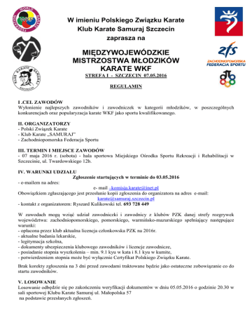 W imieniu Polskiego Związku Zwi zku Karate Klub Karate Samuraj Szczecin zaprasza na MIĘDZYWOJEWÓDZKIE MIĘ MISTRZOSTW MŁODZIKÓW MISTRZOSTWA KARATE WKF STREFA I - SZCZECIN 07.05.2016 REGULAMIN I .CEL ZAWODÓW Wyłonienie najlepszych zawodników i zawodniczek w kategorii młodzików, w poszczególnych konkurencjach oraz popularyzacja karate WKF jako sportu kwalifikowanego. II. ORGANIZATORZY - Polski Związek Karate - Klub Karate „SAMURAJ” - Zachodniopomorska Federacja Sportu III. TERMIN I MIEJSCE ZAWODÓW - 07 maja 2016 r. (sobota) - halaa sportowa Miejskiego Ośrodka Sportu Rekreacji i Rehabilitacji w Szczecinie, ul. Twardowskiego 12b. IV. WARUNKI UDZIAŁU Zgłoszenie startujących startuj w terminie do 03.05.2016 - e-mailem na adres: e- mail –[email protected] Obowiązkiem zgłaszającego cego jest przesłanie kopii zgłoszenia do organizatora na adres e-mail: [email protected] - kontakt z organizatorem: Ryszard Kulikowski tel. 693 728 449 W zawodach mogą wziąć ąć udział zawodniczki i zawodnicy z klubów PZK danej strefy rozgrywek województwa: zachodniopomorskiego, pomorskiego, warmińsko-mazurskiego spełniający następujące warunki: - opłacona przez klub aktualna licencja członkowska PZK na 2016r. - aktualne badania lekarskie, - legitymacja szkolna, - dokumenty ubezpieczenia klubowego zawodników i licencje zawodnicze, - posiadanie stopnia wyszkolenia – min. 9.1 kyu w kata i 8.1 kyu w kumite, - potwierdzeniem stopnia może ż byćć wyłącznie wył Certyfikat Polskiego Związku Karate arate. Brak korekty zgłoszenia na 3 dni przed zawodami traktowane będzie b dzie jako ostateczne zobowiązanie co do startu zawodników. V. LOSOWANIE ńczeniu weryfikacji dokumentów w dniu 05.05..2016 o godzinie 20.30 w Losowanie odbędzie się po zakończeniu sali sportowej Klubu Karate Samuraj ul. Małopolska 57 na podstawie przesłanych zgłoszeń.. VI. WIEK ZAWODNIKÓW Uczestnikami zawodów są zawodniczki i zawodnicy w wieku: 12-13 lat – decyduje dzienna data urodzenia. VII. KONKURENCJE KOBIETY 1 2 3 4 5 Kata Indywidualne Młodziczek do 7.3 kyu Kata Indywidualne Młodziczek 6.1 kyu i wyższe Kumite Indywidualne Młodziczek -40 kg Kumite Indywidualne Młodziczek -50 kg Kumite Indywidualne Młodziczek +50 kg MĘŻCZYŹNI 6 7 8 9 10 11 12 Kata Indywidualne Młodzików do 7.3 kyu Kata Indywidualne Młodzików 6.1 kyu i wyższe Kumite Indywidualne Młodzików -35 kg Kumite Indywidualne Młodzików -40 kg Kumite Indywidualne Młodzików -45 kg Kumite Indywidualne Młodzików -50 kg Kumite Indywidualne Młodzików +50 kg VIII. PRZEPISY Dwa trzecie miejsca w kumite i w kata, system chorągiewkowy z repasażami. Kumite – obowiązkowe ochraniacze na zęby; ochraniacz na korpus; napięstniki, pasy i protektory na stopy i golenie koloru czerwonego i niebieskiego – wzór WKF. Możliwość zważenia zawodnika przed rozpoczęciem konkurencji. · kata do 7.3 kyu – dowolne (min. dwa kata wykonywane na przemian). · kata od 6.1 kyu – dowolne kata, w każdej rundzie inne. · czas walki wynosi – 90 s. • mistrzostwa zostaną rozegrane wg aktualnych przepisów WKF, • w konkurencjach, w których obsada jest niepełna (min. 4 zawodników), nie będzie przyznawany tytuł Mistrza, punkty w SSM ani punktacja do Rankingu oraz klasyfikacji końcowej Mistrzostw, • zawodnicy muszą posiadać sprzęt z homologacją WKF/PZK, • organizator nie zabezpiecza pasów startowych dla zawodników, • tylko licencjonowani trenerzy mogą przebywać w wyznaczonym przepisami miejscu wyłącznie w dresie klubowym i z widoczną ważną licencją trenerską, • w obszarze pola walki mogą przebywać jedynie zawodnicy aktualnie toczący walki, ich trenerzy oraz sędziowie, • zgodnie z informacją, która ukazała się na stronie PZK 25.04.2013r. dotyczącą współzawodnictwa sportowego w ramach Międzywojewódzkich Mistrzostw Młodzików i Mistrzostw Polski Juniorów Młodszych w Karate WKF Polski Związek Karate informuje, że zgodnie z Częścią Ogólną Regulaminu Współzawodnictwa Sportowego Dzieci i Młodzieży Polskiej Federacji Sportu Młodzieżowego w punkcie 3.3. zawarta jest informacja, która mówi, iż zawodnik jest klasyfikowany i zdobywa punkty zaliczane do współzawodnictwa sportowego tylko w jednej kategorii wiekowej, to znaczy w tej, w której ze względu na rok urodzenia i wewnętrzne przepisy sportu powinien w danym roku startować. Oznacza to, że w bieżącym roku zawodnik może rywalizować tylko w jednej kategorii wiekowej (młodzika lub juniora młodszego) w ramach MMM lub Mistrzostw Polski Juniorów Młodszych. IX. POSTANOWIENIA KOŃCOWE - zawody zostaną rozegrane na dwóch planszach /tatami/, - za zajęcie miejsc 1-3 przyznawane są medale oraz dyplomy, - w trakcie ceremonii dekoracji obowiązuje zawodników i zawodniczki dres klubowy lub karategi, - kwestie sporne rozstrzyga Sędzia Główny w porozumieniu z Organizatorem, - złożenie protestu dotyczącego decyzji sędziowskiej – po wpłaceniu wadium w wysokości 300 zł, - organizator nie ponosi odpowiedzialności za rzeczy zaginione, - wejście na salę sportową tylko w zmiennym obuwiu sportowym, - na sali podczas zawodów mogą przebywać tylko zawodnicy i trenerzy /kierownicy ekip/, kibice na trybunach, - za ewentualne szkody poczynione przez uczestnika Mistrzostw odpowiedzialność ponosi jego Klub, - ekspozycja i sprzedaż towarów – tylko za zgodą organizatora, - przy weryfikacji zgłoszeń należy posiadać kopię zgłoszenia X.INFORMACJE DOTYCZĄCE SĘDZIÓW Listę sędziów ustali Organizator w porozumieniu z sędzią głównym zawodów Panem Stanisławem Jabłonowskim - kontakt telefoniczny 602 330 245. XI. NOCLEGI I WYŻYWIENIE Młodzieżowe Schronisko Szkolne ul. Monte Cassino 19a tel 422 4761 Marina Hotele Sp.z o.o. ul. Twardowskiego 12, tel 91 434 57 96, 91 433 75 01 - obok hali sportowej – 40 m. HOTEL SDS ul. Unisławy 29 tel..091 422 28 56 HOTEL RYCERSKI ul. Potulicka 2a tel 091 814 66 01 Woj