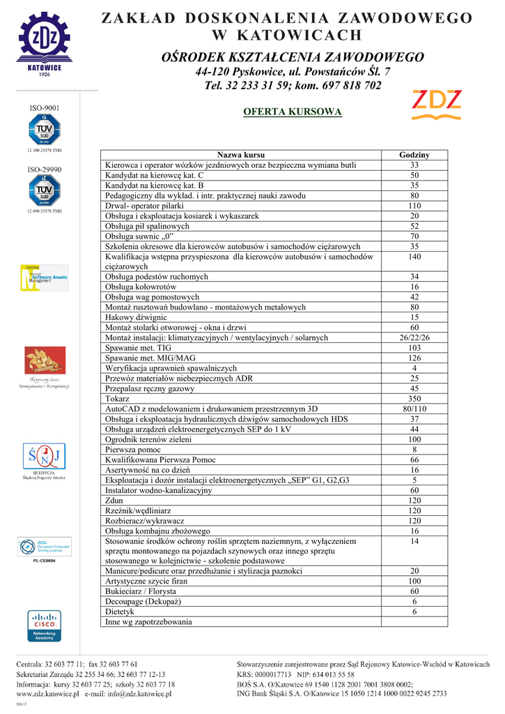 OŚRODEK KSZTAŁCENIA ZAWODOWEGO 44-120 Pyskowice, ul. Powstańców Śl. 7 Tel. 32 233 31 59; kom. 697 818 702 OFERTA KURSOWA Nazwa kursu Kierowca i operator wózków jezdniowych oraz bezpieczna wymiana butli Kandydat na kierowcę kat. C Kandydat na kierowcę kat. B Pedagogiczny dla wykład. i intr. praktycznej nauki zawodu Drwal- operator pilarki Obsługa i eksploatacja kosiarek i wykaszarek Obsługa pił spalinowych Obsługa suwnic „0” Szkolenia okresowe dla kierowców autobusów i samochodów ciężarowych Kwalifikacja wstępna przyspieszona dla kierowców autobusów i samochodów ciężarowych Obsługa podestów ruchomych Obsługa kołowrotów Obsługa wag pomostowych Montaż rusztowań budowlano - montażowych metalowych Hakowy dźwignic Montaż stolarki otworowej - okna i drzwi Montaż instalacji: klimatyzacyjnych / wentylacyjnych / solarnych Spawanie met. TIG Spawanie met. MIG/MAG Weryfikacja uprawnień spawalniczych Przewóz materiałów niebezpiecznych ADR Przepalasz ręczny gazowy Tokarz AutoCAD z modelowaniem i drukowaniem przestrzennym 3D Obsługa i eksploatacja hydraulicznych dźwigów samochodowych HDS Obsługa urządzeń elektroenergetycznych SEP do 1 kV Ogrodnik terenów zieleni Pierwsza pomoc Kwalifikowana Pierwsza Pomoc Asertywność na co dzień Eksploatacja i dozór instalacji elektroenergetycznych „SEP” G1, G2,G3 Instalator wodno-kanalizacyjny Zdun Rzeźnik/wędliniarz Rozbieracz/wykrawacz Obsługa kombajnu zbożowego Stosowanie środków ochrony roślin sprzętem naziemnym, z wyłączeniem sprzętu montowanego na pojazdach szynowych oraz innego sprzętu stosowanego w kolejnictwie - szkolenie podstawowe Manicure/pedicure oraz przedłużanie i stylizacja paznokci Artystyczne szycie firan Bukieciarz / Florysta Decoupage (Dekupaż) Dietetyk Inne wg zapotrzebowania Godziny 33 50 35 80 110 20 52 70 35 140 34 16 42 80 15 60 26/22/26 103 126 4 25 45 350 80/110 37 44 100 8 66 16 5 60 120 120 120 16 14 20 100 60 6 6