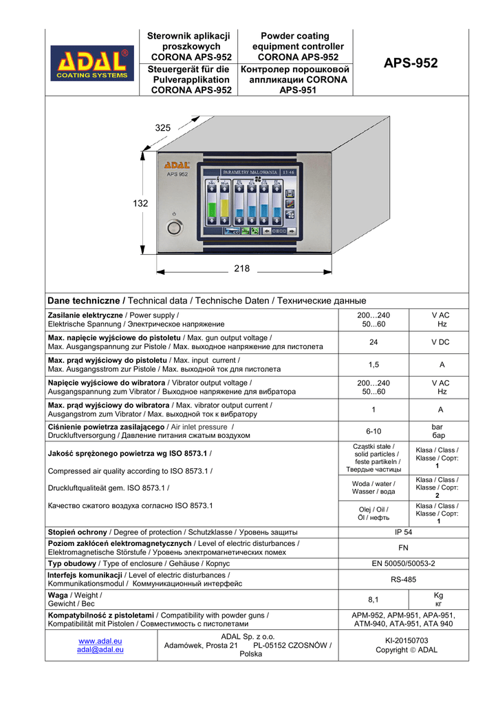 Sterownik aplikacji Powder coating proszkowych equipment controller CORONA APS-952 CORONA APS-952 Steuergerät für die Контролер порошковой Pulverapplikation аппликации CORONA CORONA APS-952 APS-951 APS-952 325 132 218 Dane techniczne / Technical data / Technische Daten / Технические данные 200…240 50...60 V AC Hz Max. napięcie wyjściowe do pistoletu / Max. gun output voltage / Max. Ausgangspannung zur Pistole / Max. выходное напряжение для пистолета 24 V DC Max. prąd wyjściowy do pistoletu / Max. input current / Max. Ausgangsstrom zur Pistole / Max. выходной ток для пистолета 1,5 A 200…240 50...60 V AC Hz 1 A 6-10 bar бар Cząstki stałe / solid particles / feste partikeln / Твердые частицы Klasa / Class / Klasse / Сорт: 1 Woda / water / Wasser / вода Klasa / Class / Klasse / Сорт: 2 Olej / Oil / Öl / нефть Klasa / Class / Klasse / Сорт: 1 Zasilanie elektryczne / Power supply / Elektrische Spannung / Электрическое напряжение Napięcie wyjściowe do wibratora / Vibrator output voltage / Ausgangspannung zum Vibrator / Выходное напряжение для вибратора Max. prąd wyjściowy do wibratora / Max. vibrator output current / Ausgangstrom zum Vibrator / Max. выходной ток к вибратору Ciśnienie powietrza zasilającego / Air inlet pressure / Druckluftversorgung / Давление питания сжатым воздухом Jakość sprężonego powietrza wg ISO 8573.1 / Compressed air quality according to ISO 8573.1 / Druckluftqualiteät gem. ISO 8573.1 / Качество сжатого воздуха согласно ISO 8573.1 Stopień ochrony / Degree of protection / Schutzklasse / Уровень защиты Poziom zakłóceń elektromagnetycznych / Level of electric disturbances / Elektromagnetische Störstufe / Уровень электромагнетических помех Typ obudowy / Type of enclosure / Gehäuse / Корпус IP 54 FN EN 50050/50053-2 Interfejs komunikacji / Level of electric disturbances / Kommunikationsmodul / Коммуникационный интерфейс Waga / Weight / Gewicht / Вес 8,1 Kompatybilność z pistoletami / Compatibility with powder guns / Kompatibilität mit Pistolen / Совместимость с пистолетами www.adal.eu [email protected] RS-485 ADAL Sp. z o.o. Adamówek, Prosta 21 PL-05152 CZOSNÓW / Polska Kg кг APM-952, APM-951, APA-951, ATM-940, ATA-951, ATA 940 KI-20150703 Copyright ADAL